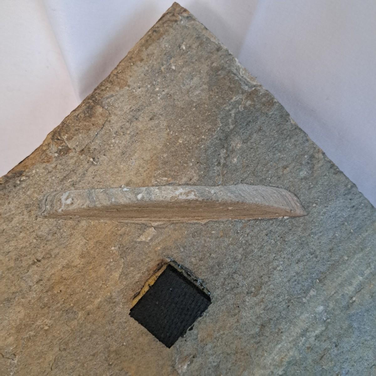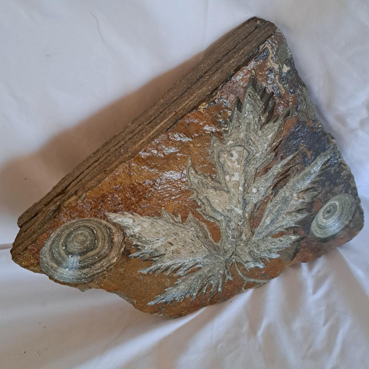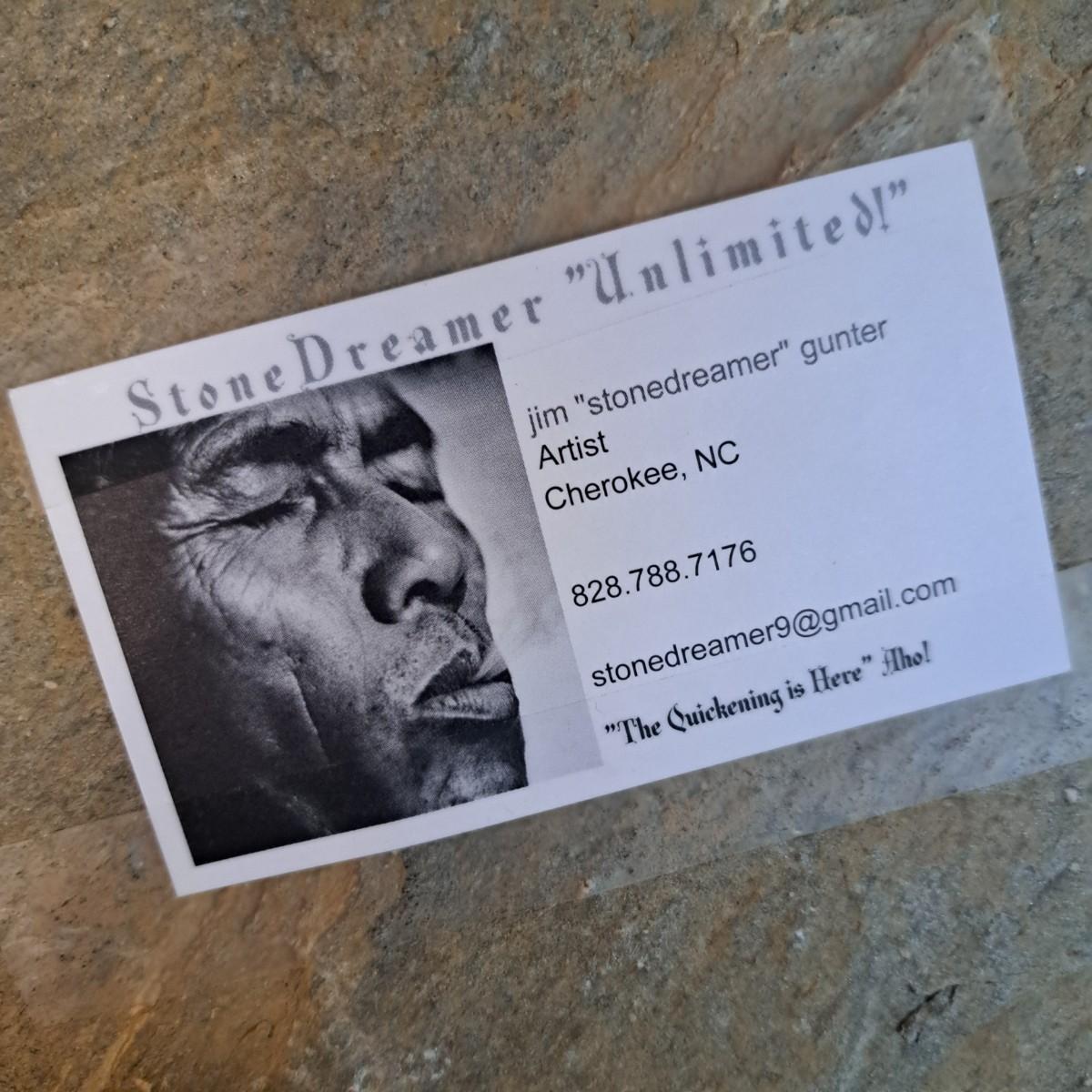 Two interesting botanical sculptures that feature a hand-made stone sculpture by Jim "stonedreamer" Gunter, a Cherokee artist from NC, 16" x 1.5" x 12"H. Features a carved leaf with two concentric deeply cut circles on each side. Sculpture can be placed on a table, hung on a wall (*see notch on back) - or inserted into an outdoor path. Second sculpture is a wrought iron metal fern hanging wall sculpture, 22" x 41"H. Painted a distressed green and white. Has welded metal eyelets for hanging vertically or horizontally; no artist signature visible. Shipping available. Shipping can be costly. We suggest contacting our preferred local shipping provider, Postage Express, with dimensions and getting an estimate before bidding: (828) 255-9250 or shipping@postageexpressnc.com.