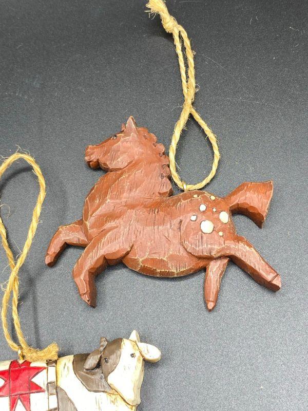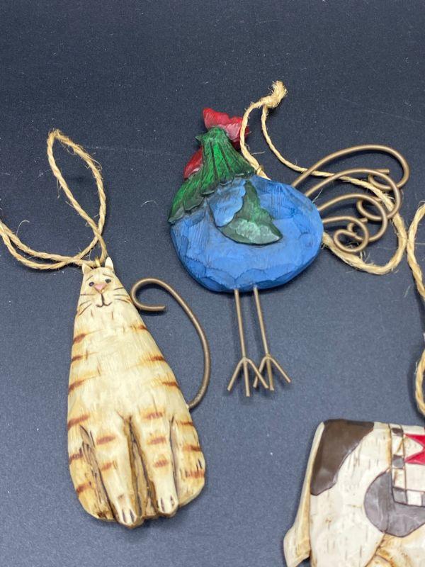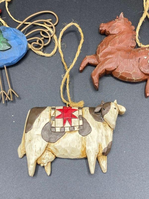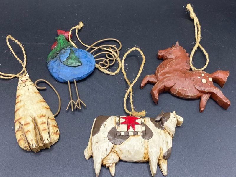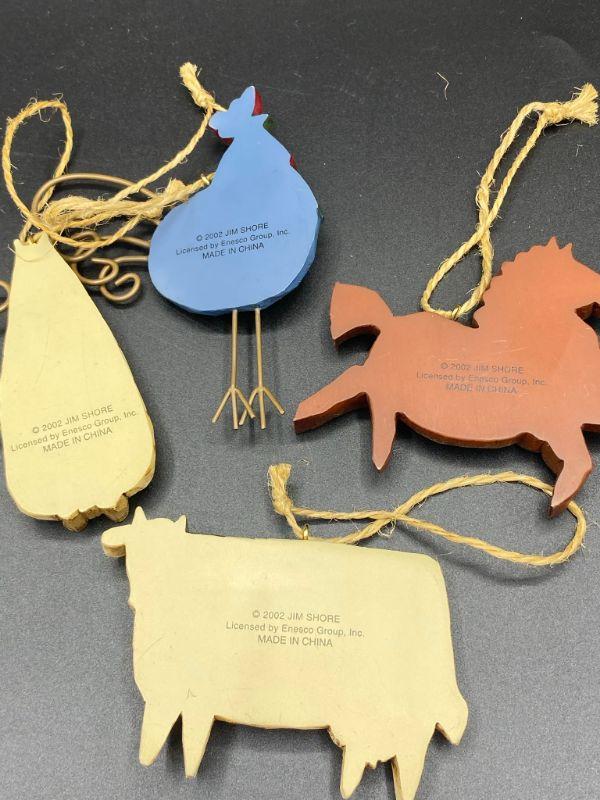4 Jim Shore animal ornaments. Cat, rooster, cow, and horse. All marked on the backside.