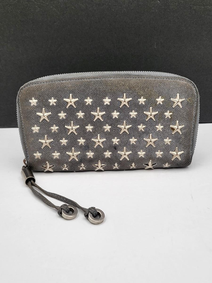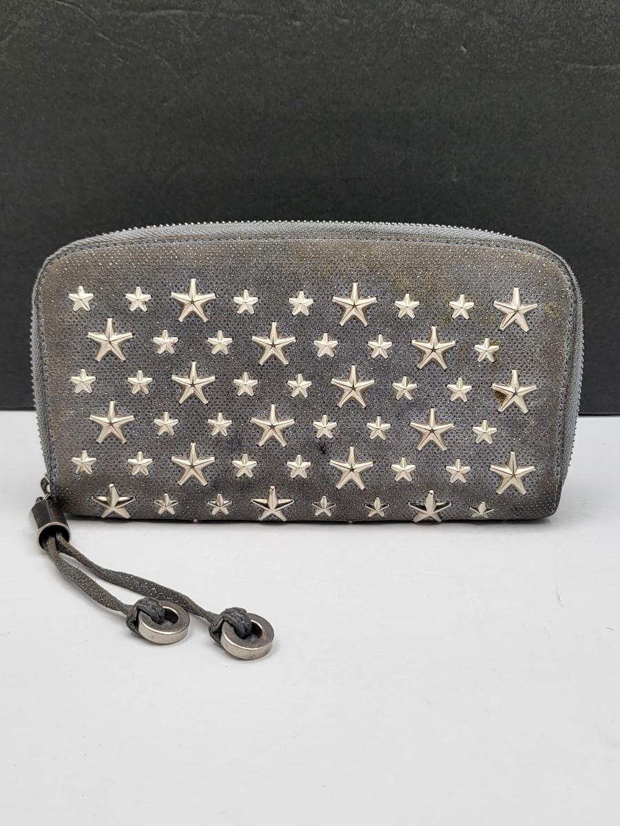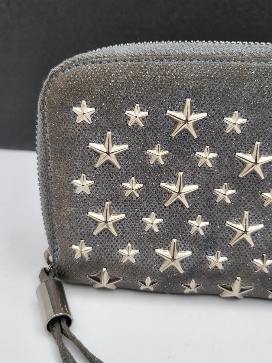 Jimmy Choo silver tone star studded dark grey shimmer leather zip around wallet. Tassel zipper pull. Blue leather interior. Made in Italy. Measures 7.5" x 4". Pre-owned.