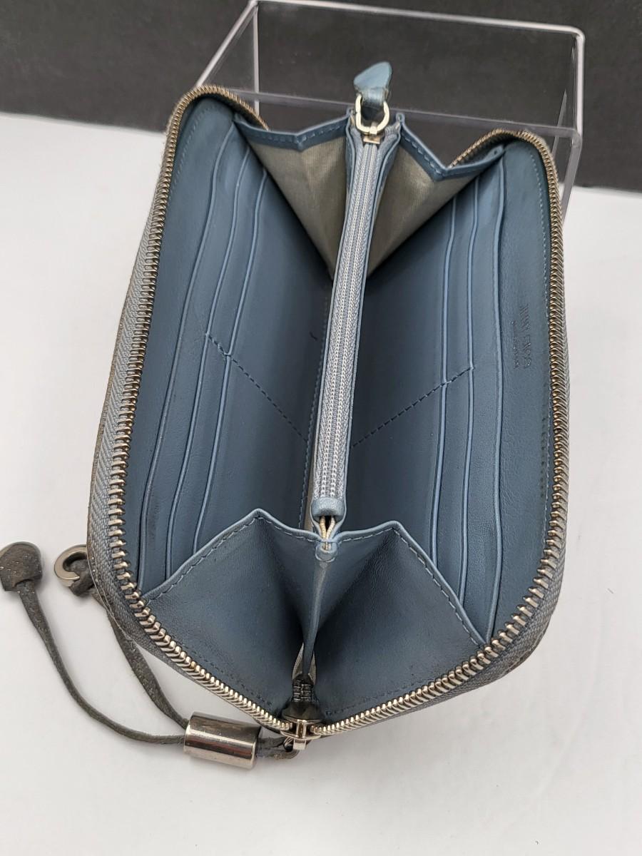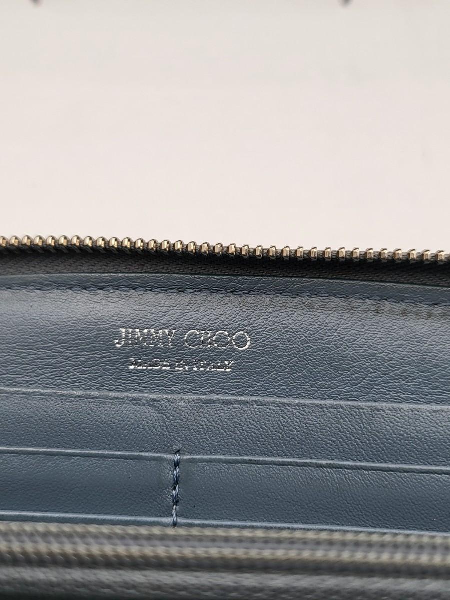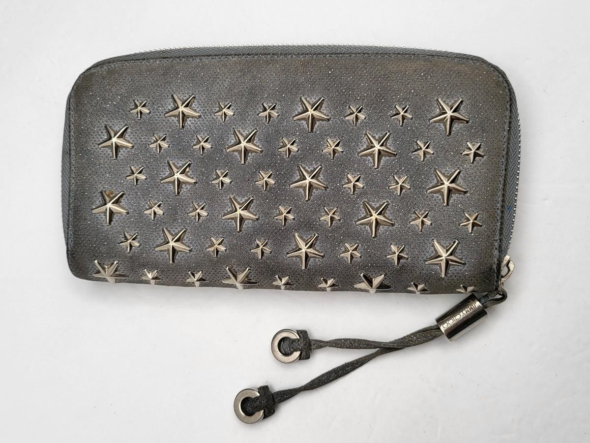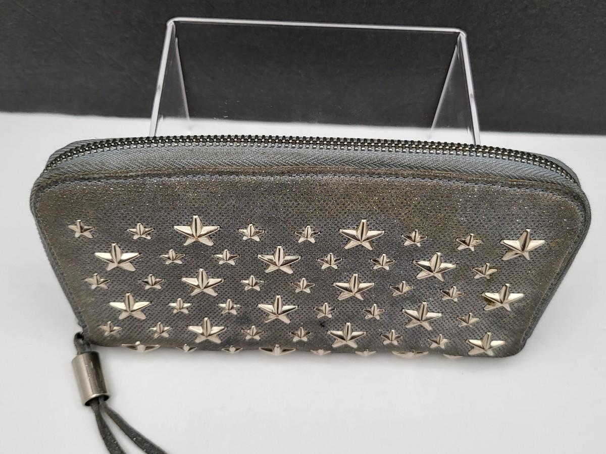 Jimmy Choo silver tone star studded dark grey shimmer leather zip around wallet. Tassel zipper pull. Blue leather interior. Made in Italy. Measures 7.5" x 4". Pre-owned.