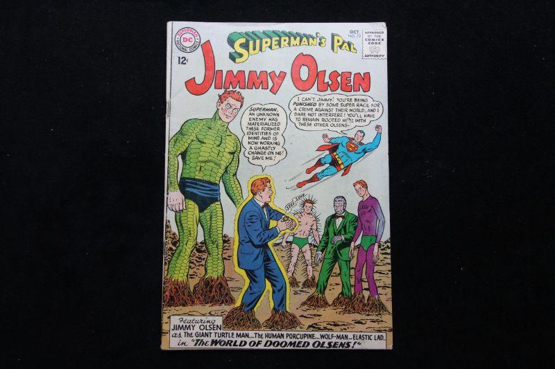 Jimmy is taken by The Collector to the world Gion-El, which is seemingly inhabited by duplicates of him in the forms into which he has been transformed in the past. But when Jimmy realizes he is being hoaxed, the Legionnaires reveal that he has passed his initiation test and they bring him to the 30th century to officially be made an honorary member of the Legion of Super-Heroes. : Condition: 3.5