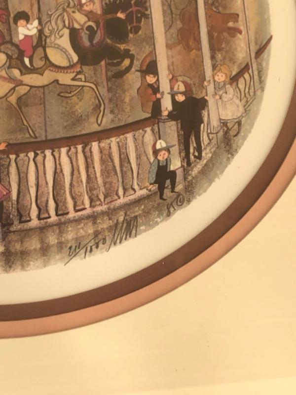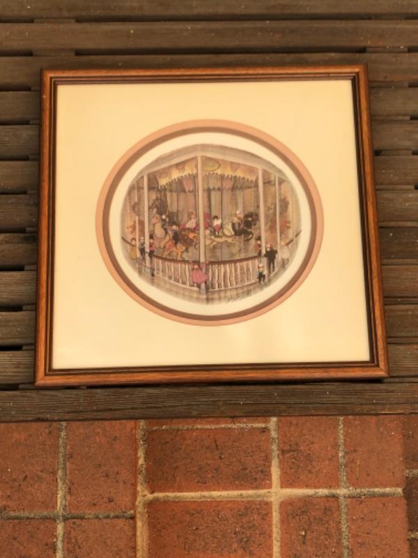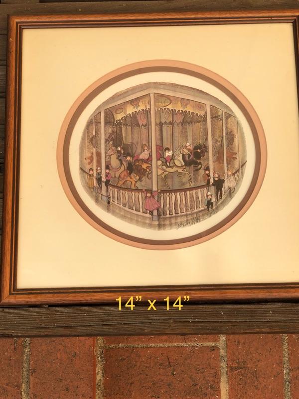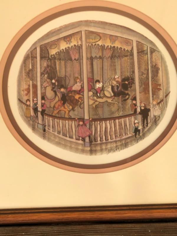 1985 Artwork Limited Edition P Buckley Moss print, framed, children on Merry Go Round Carousel 14" x 14", #211/1000