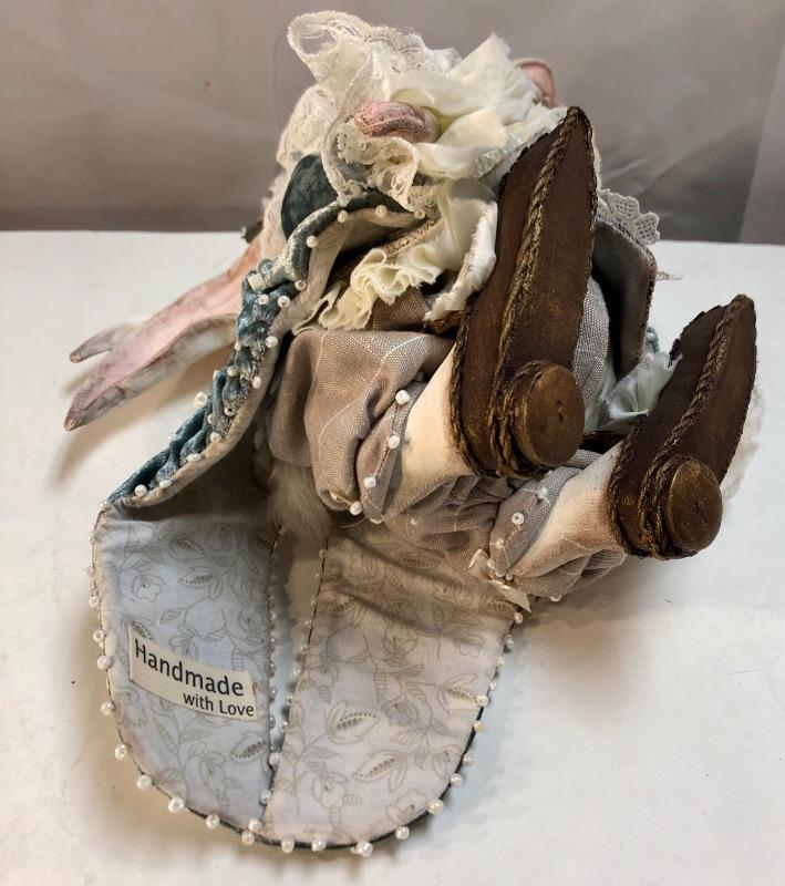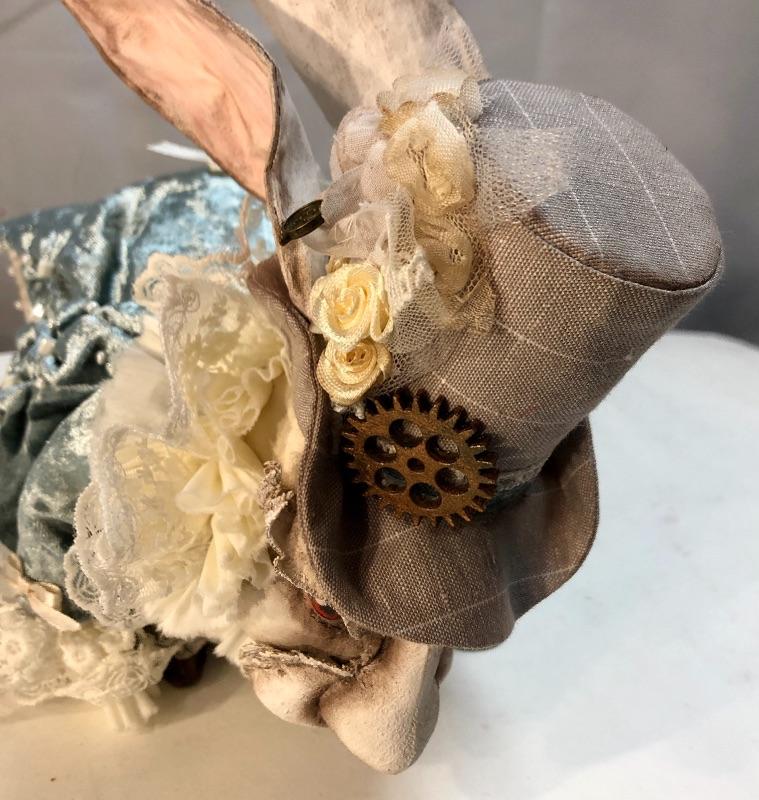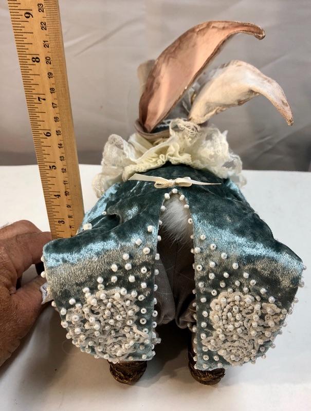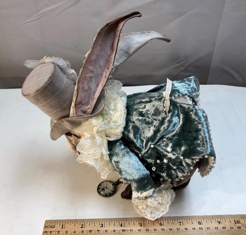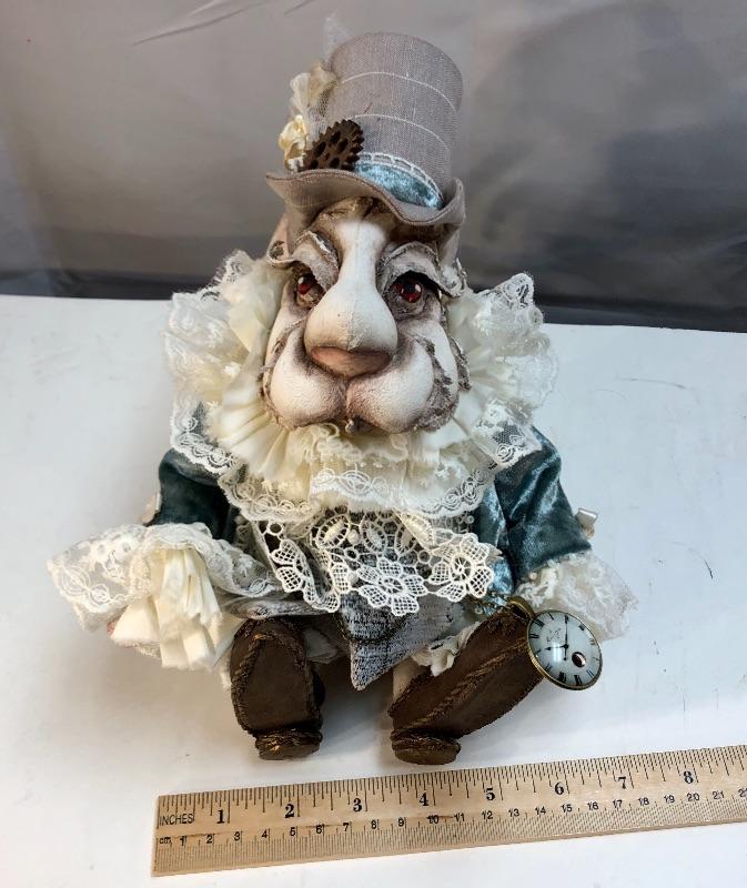 Handmade tea party White Rabbit from Alice in Wonderland plush doll. One of a kind artist doll. Good condition. About 9" size.