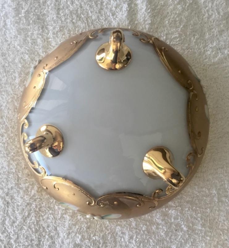 Beautiful gold gilt trinket dish. Clear glass painted white inside with thick gold gilt edges. Hand painted flowers on top of gold. About 7" size.