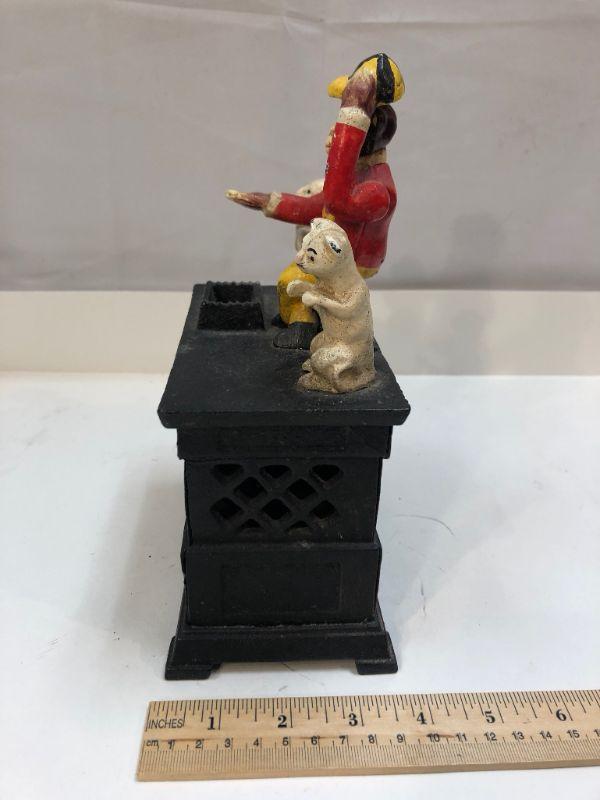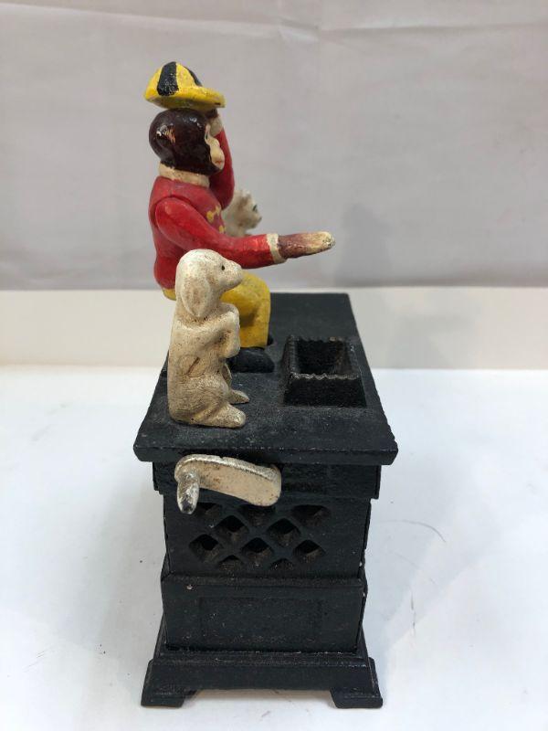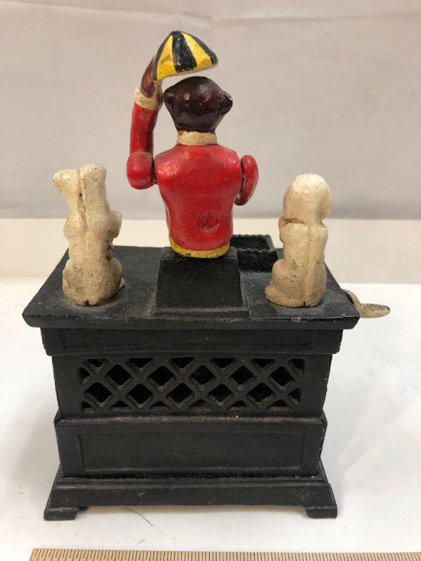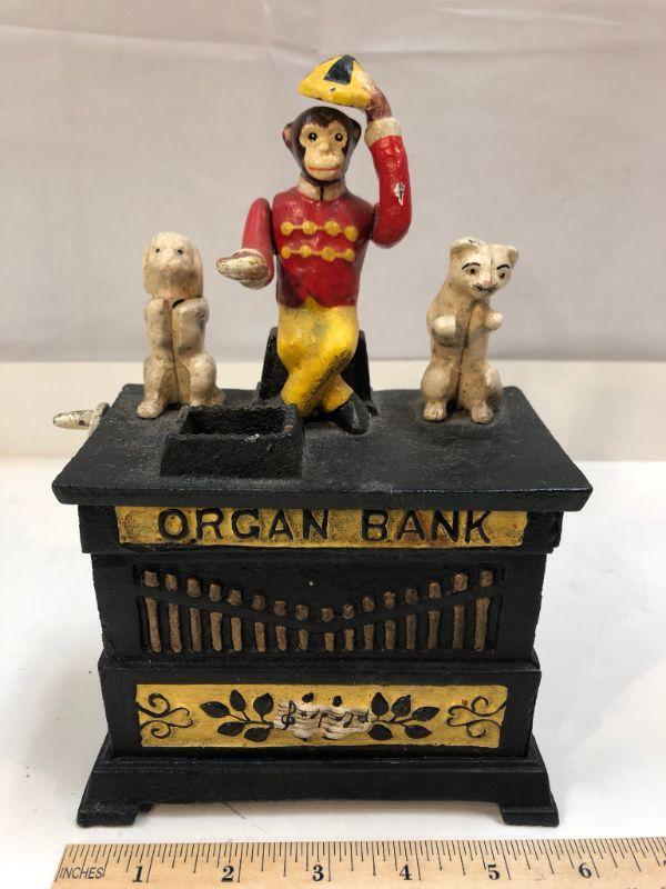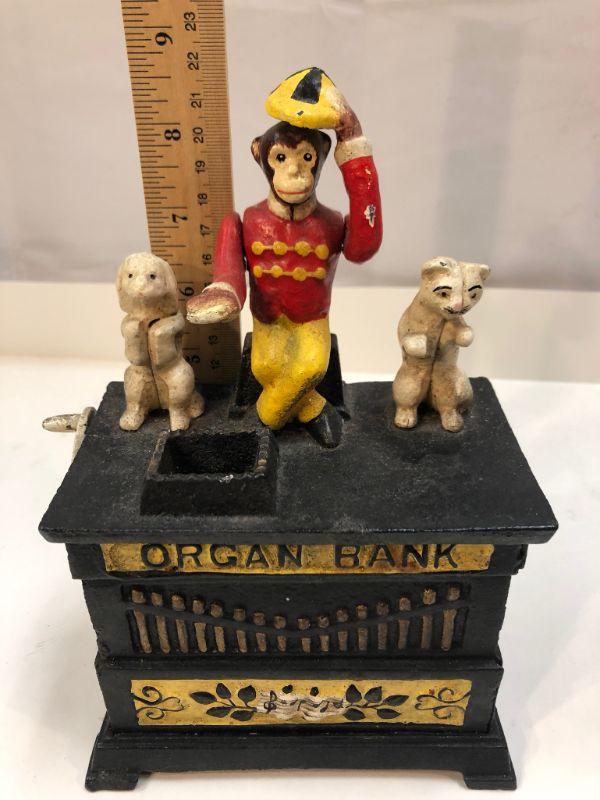 Cast iron organ grinder monkey coin bank. Put coin in hand and monkey drops it into bank. Possible reproduction. Paint in good condition. Almost 9" tall. #020-00542