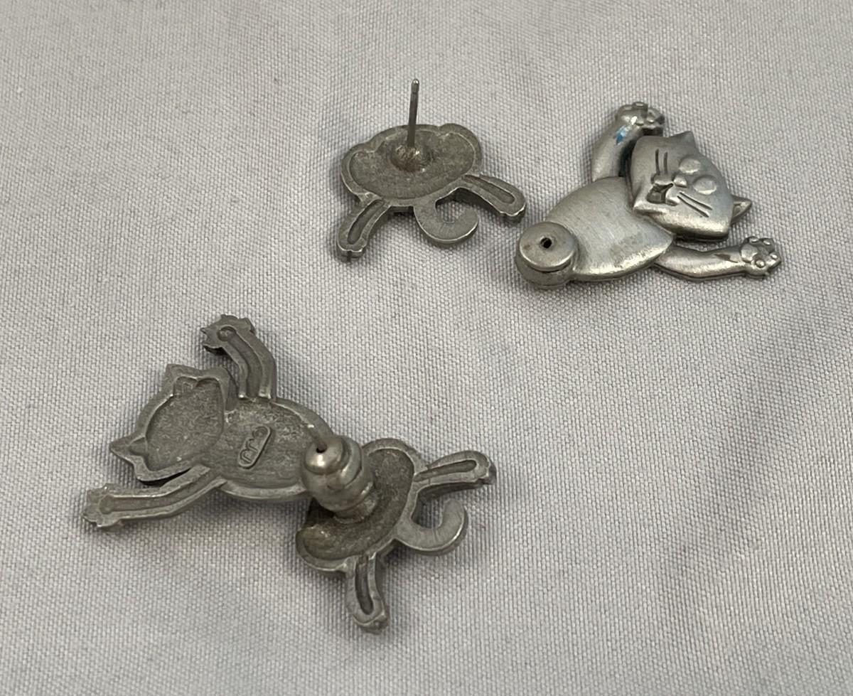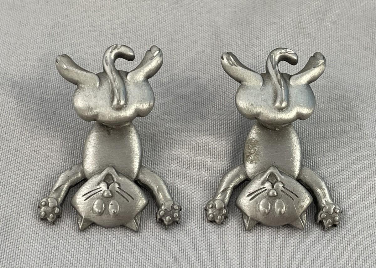 These earrings are two parts - the bottom is the earring and the top of the cat is the backing. They are made of what appears to be pewter and are definitely an attention getter. Each is about 1.25 inches long.