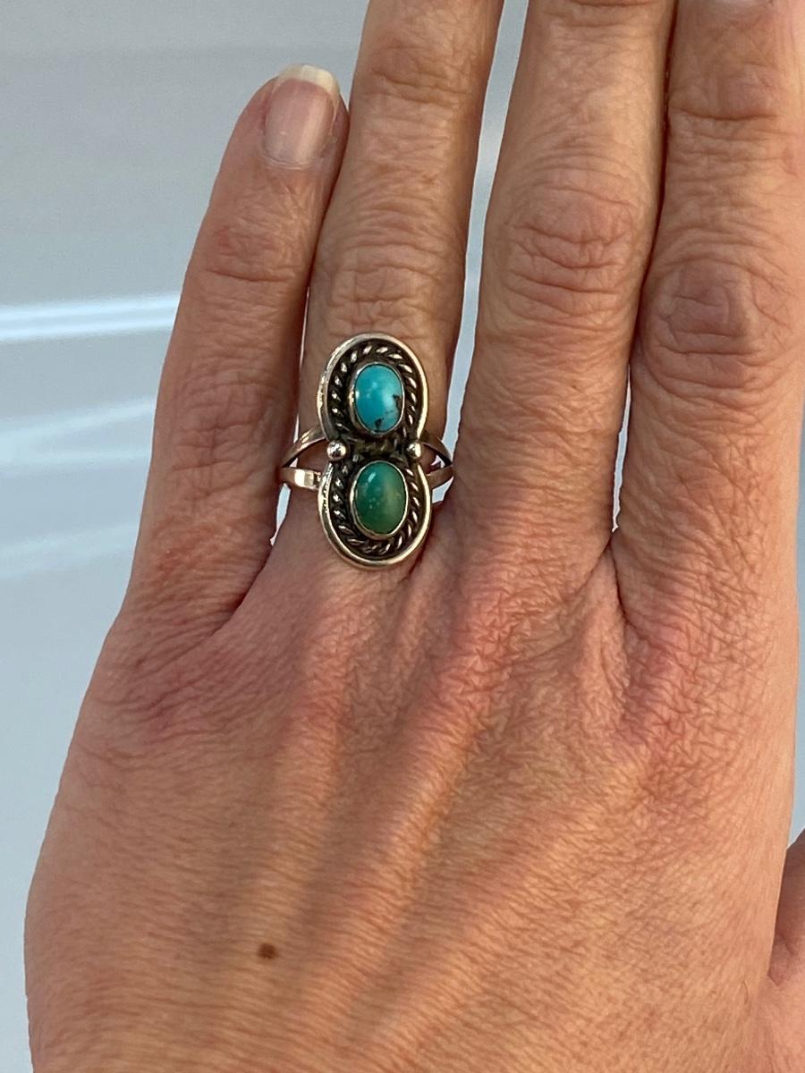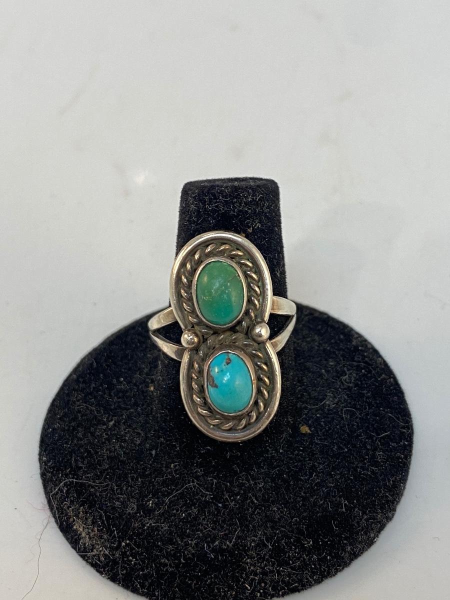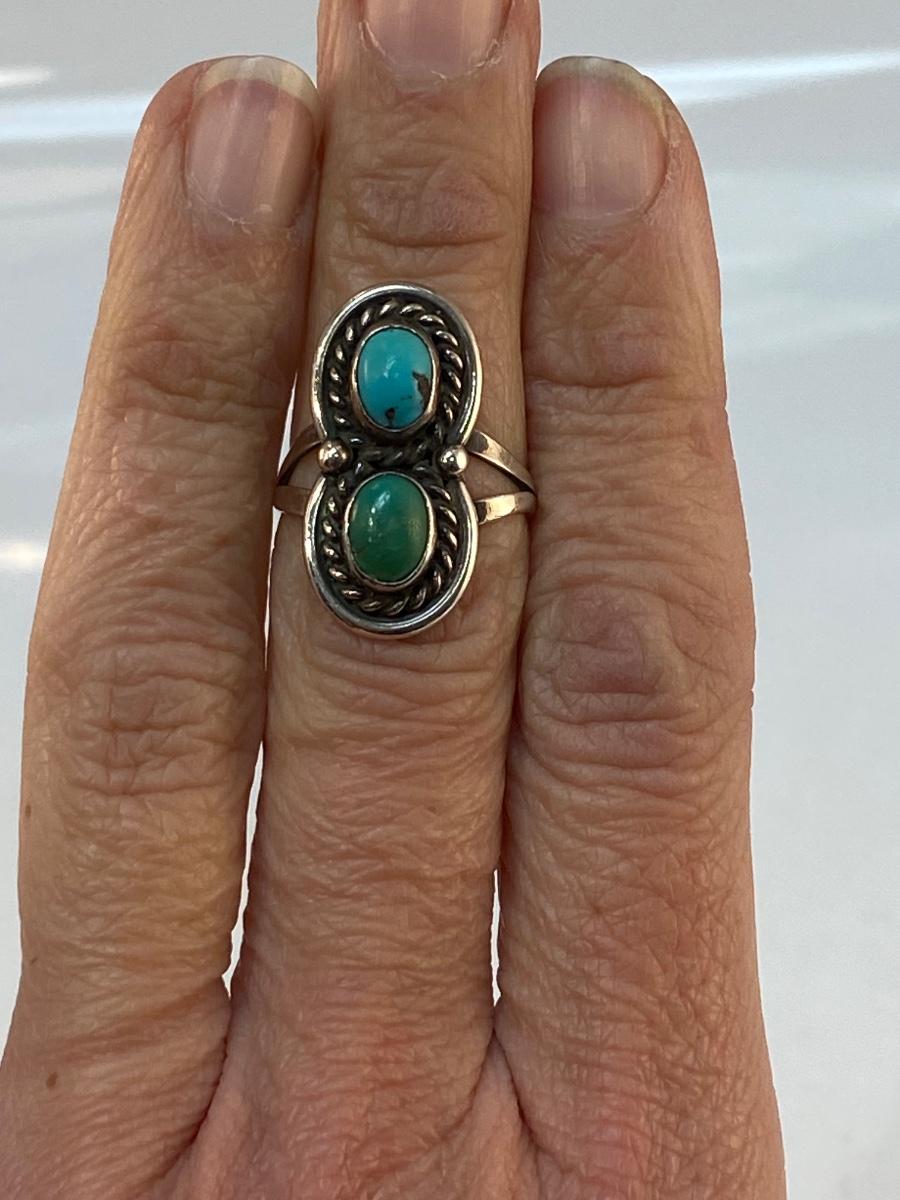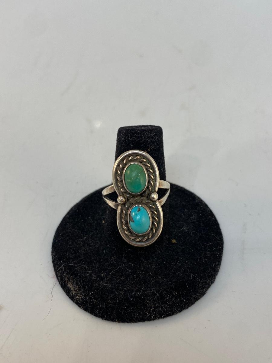 Silver Tone Double Turquoise Cabochon Southwest Style Ring. No sterling or hallmarks found. Blue and green turquoise. In good condition. Size 7 maybe 8.