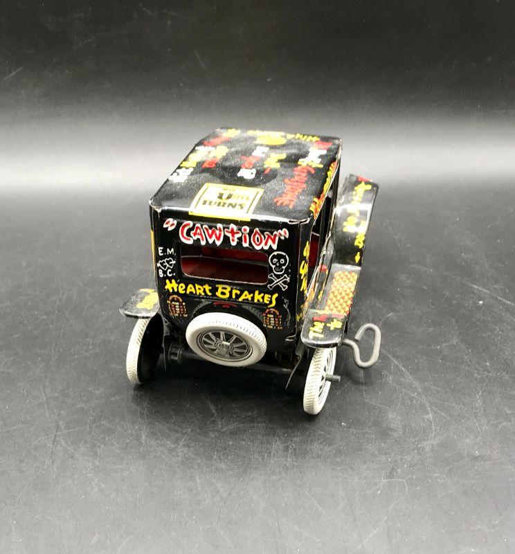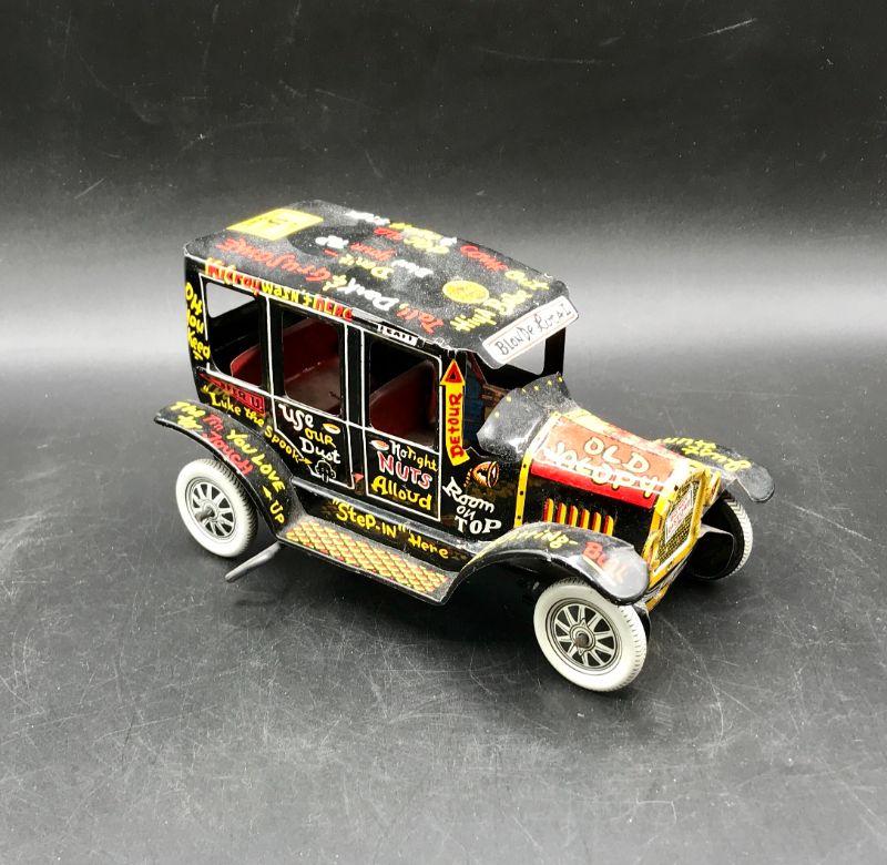 Vintage 1940s Louis Marx Old Jalopy tin toy car. Mechanical wind up with key. In good vintage condition.