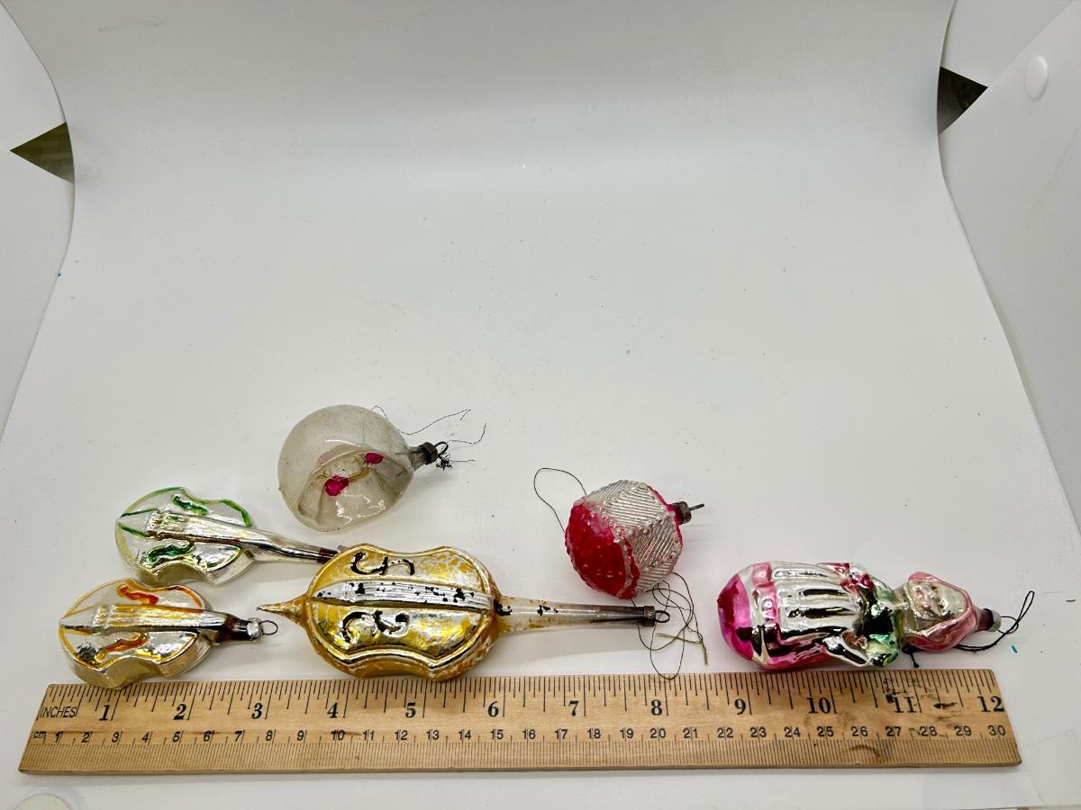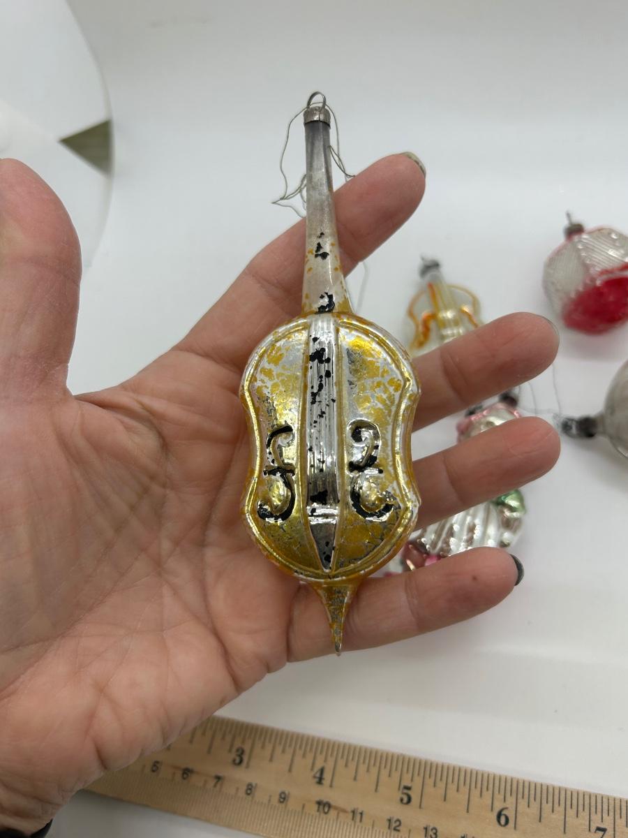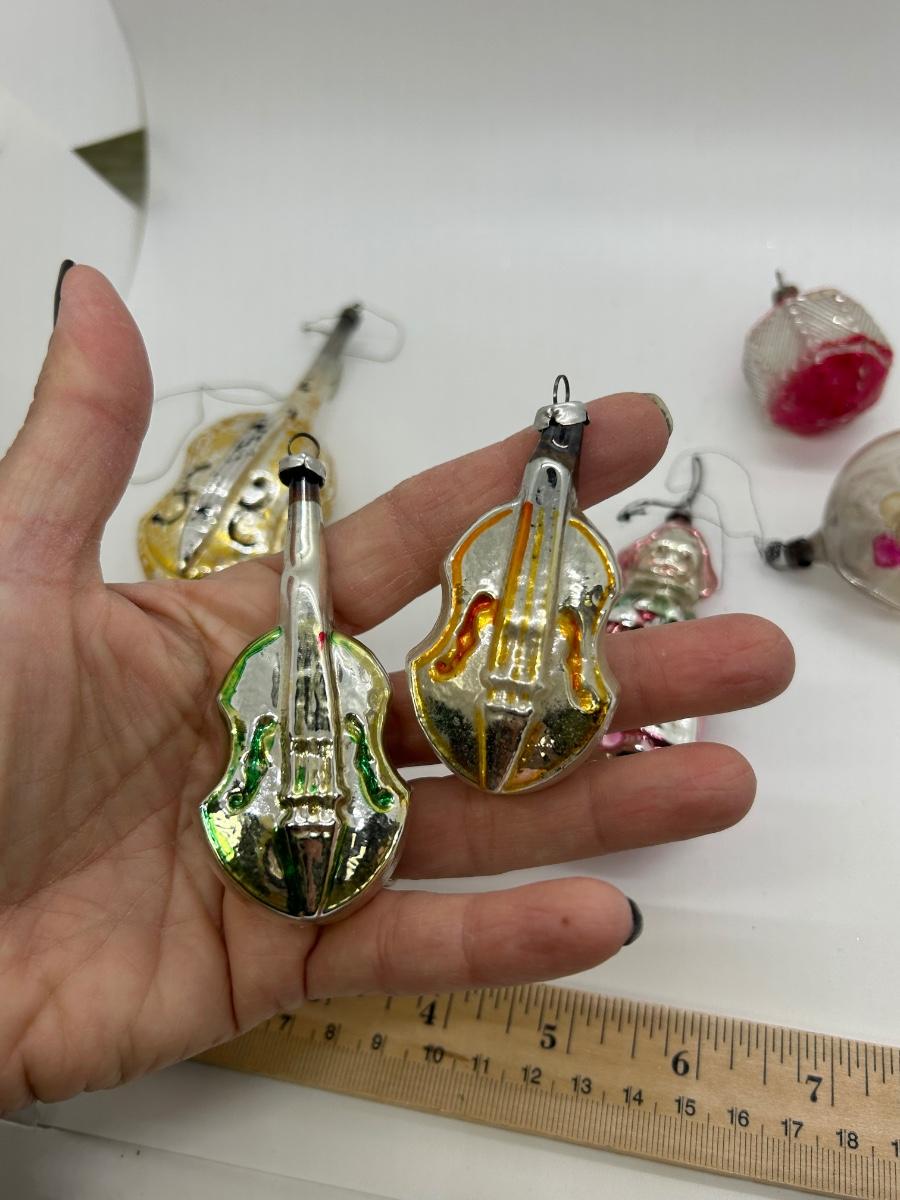 Mixed Lot of Novelty Shaped Blown Glass Christmas Holiday Ornaments Violins Woman Indent Top. In vintage condition. No broken ornaments but there is wear from age and previous use.