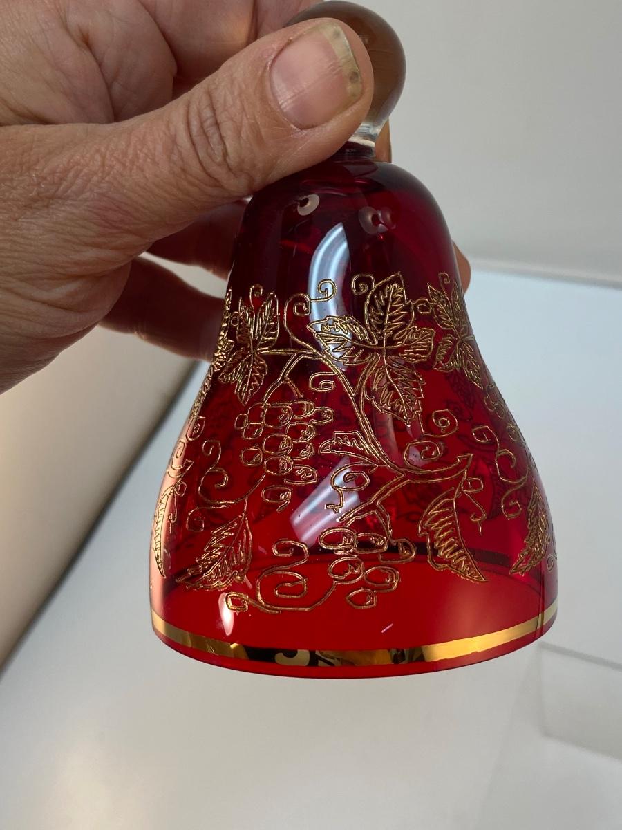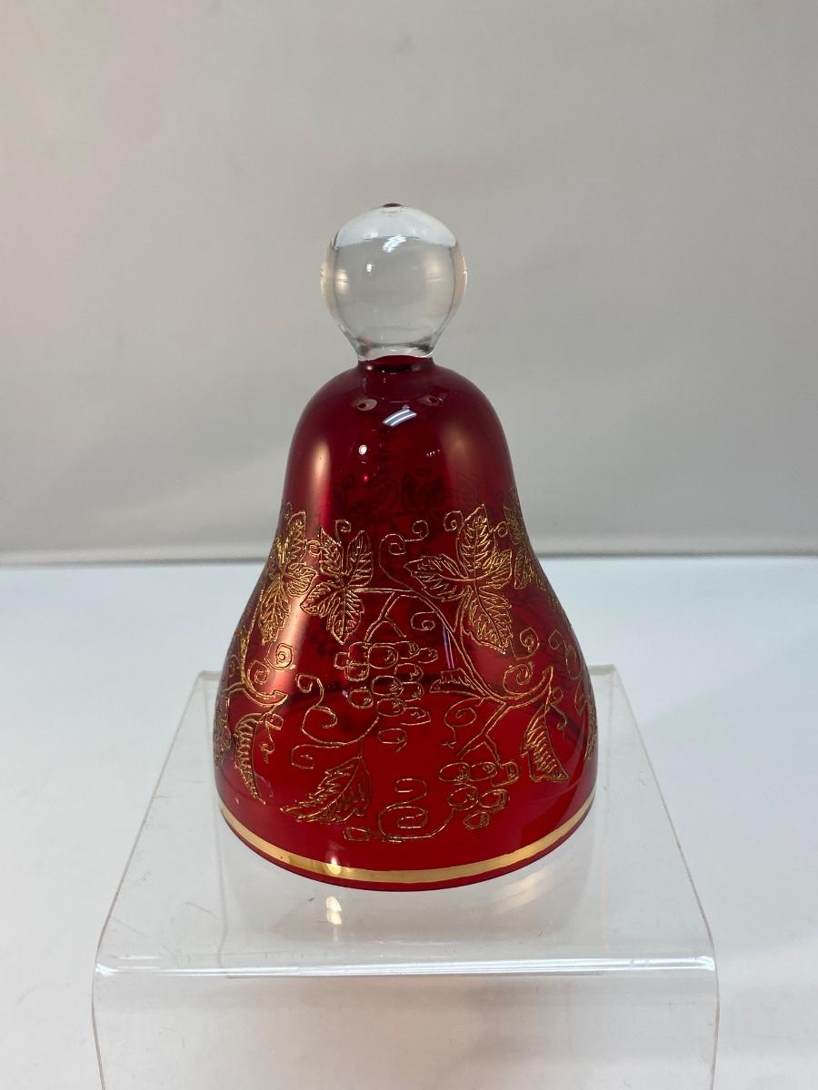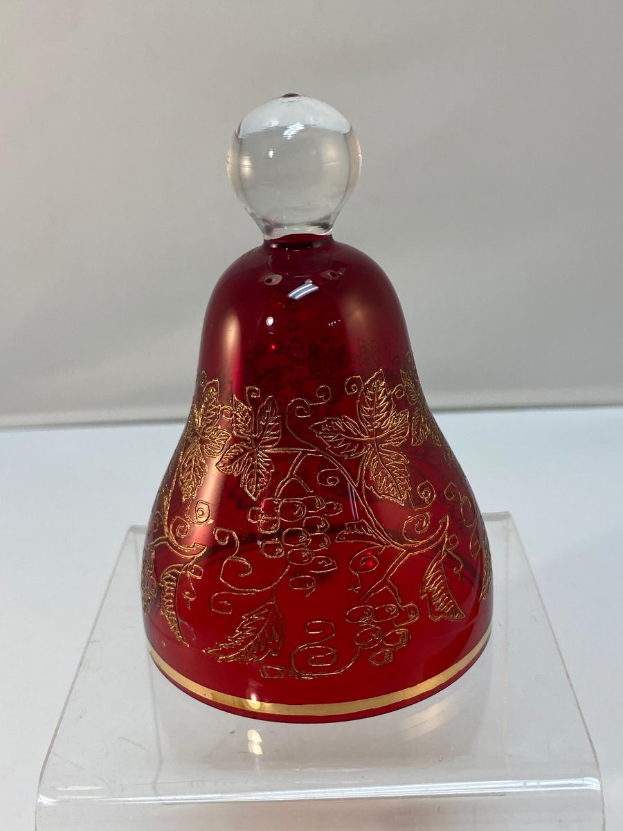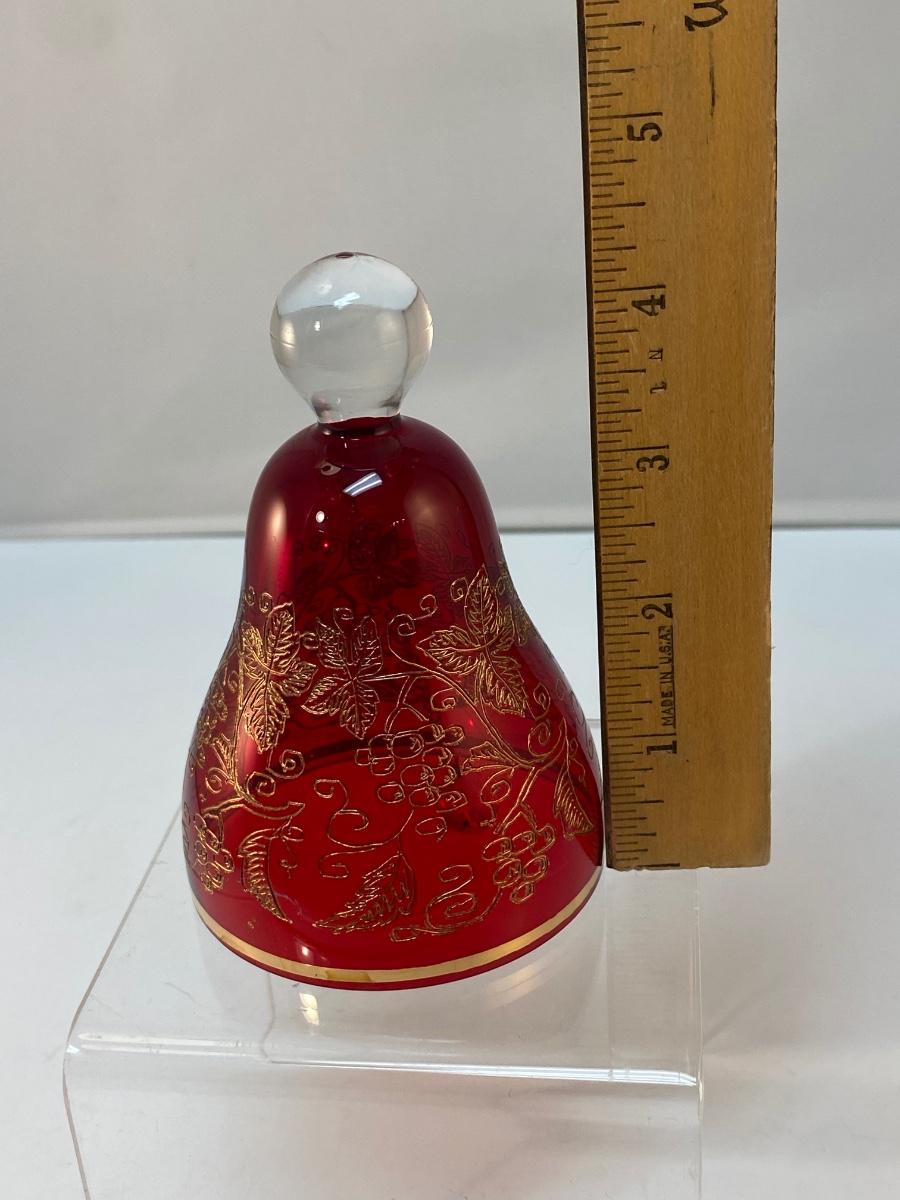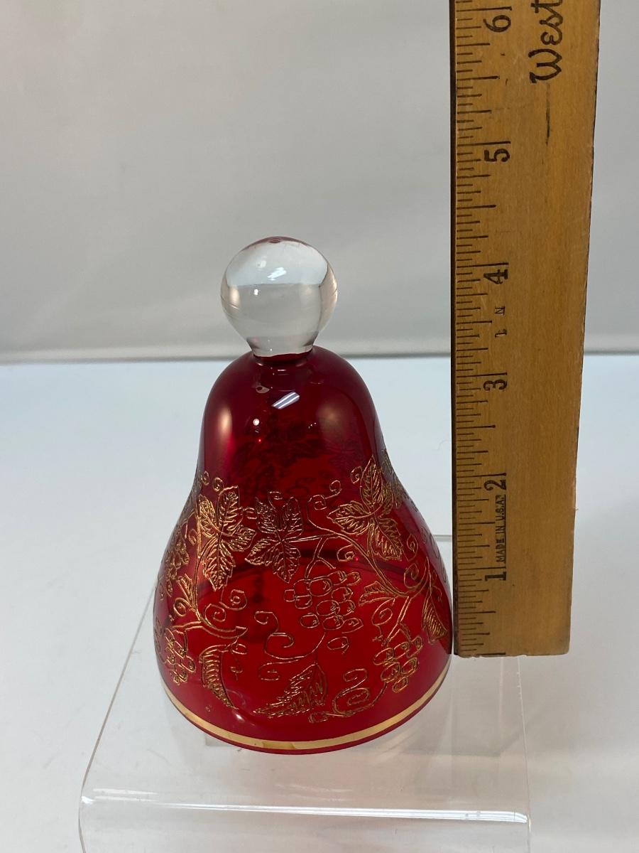 Vintage Red and Gold Grape Vine Pattern Glass Bell. Good condition. About 4" size.