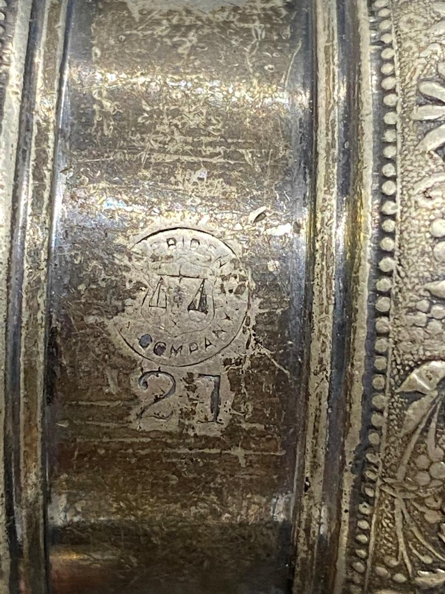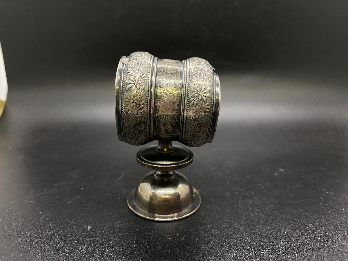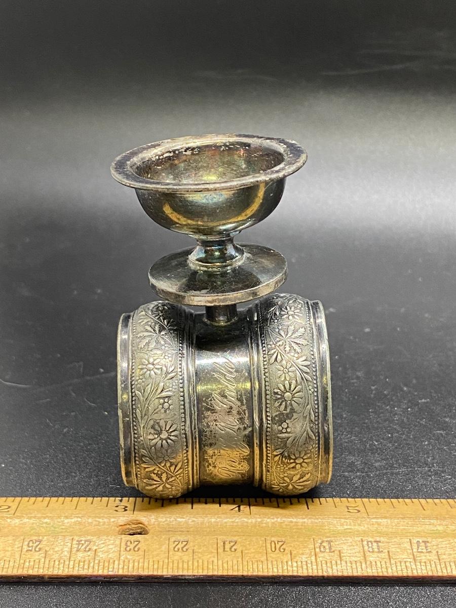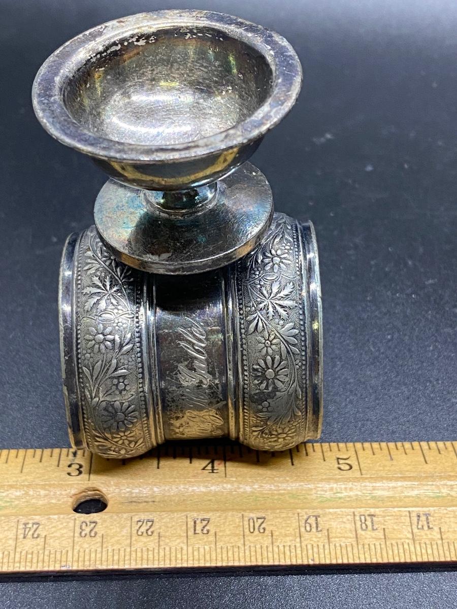 Interesting antique tableware piece. Looks like a napkin ring/salt cellar combination. Salt cellar is removable and could be set aside. Ring has a stamped floral pattern and a name engraved. Silver plate made by Meriden. There is some bent places and damage along the edge of ring.