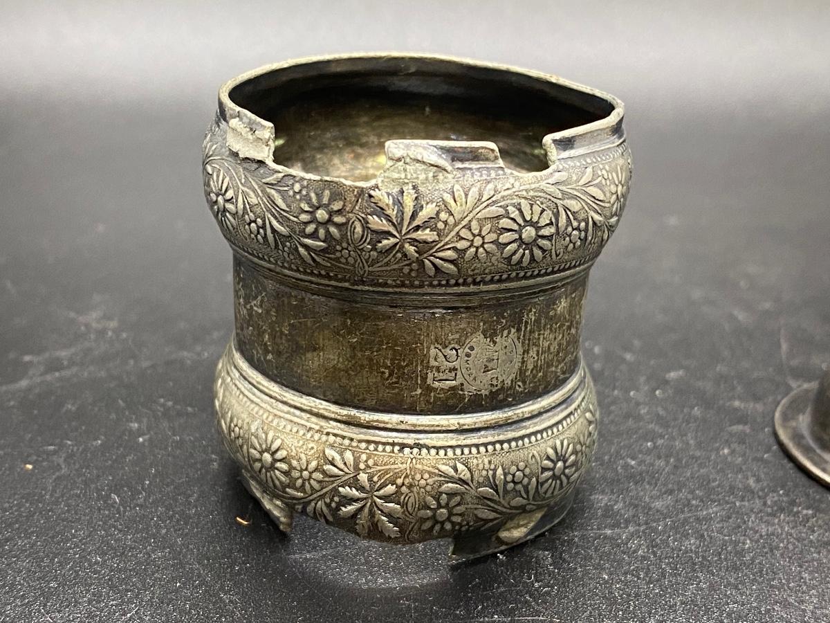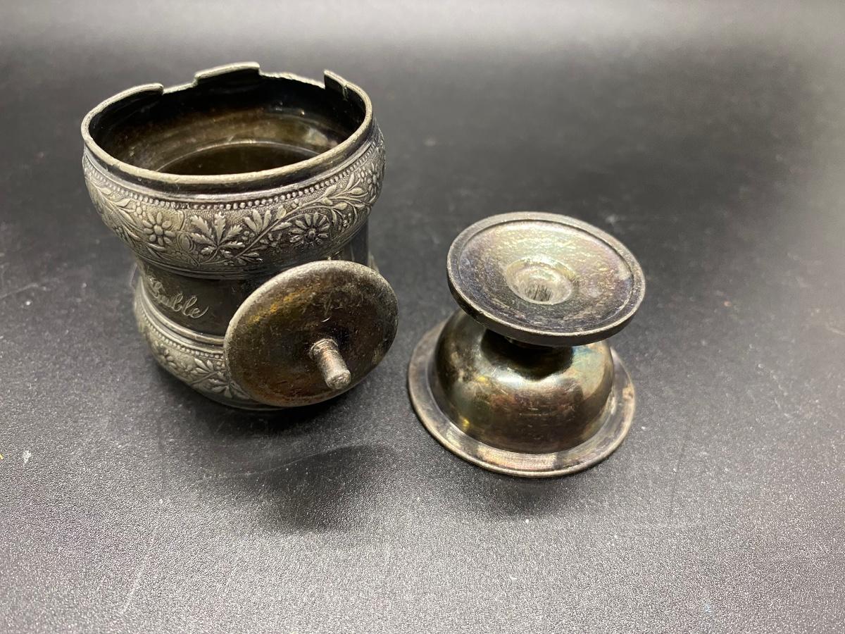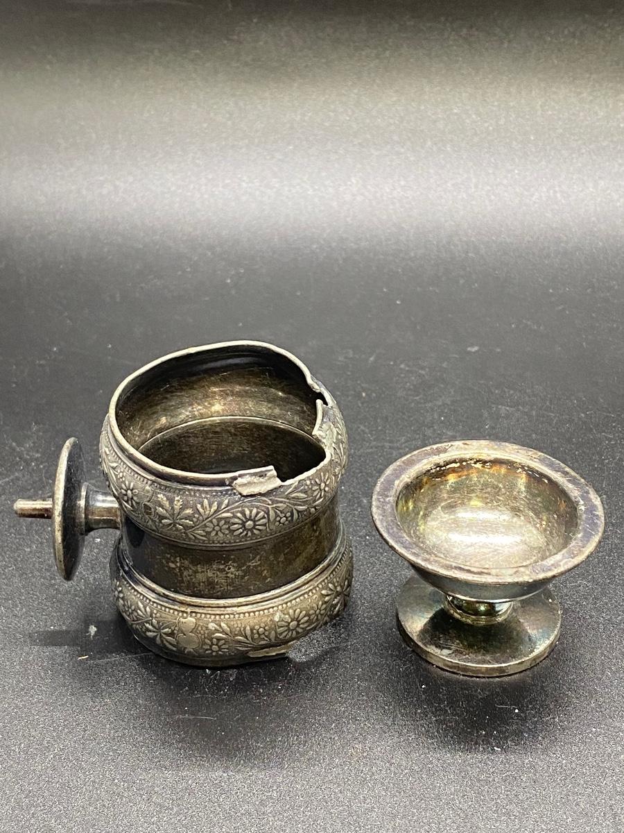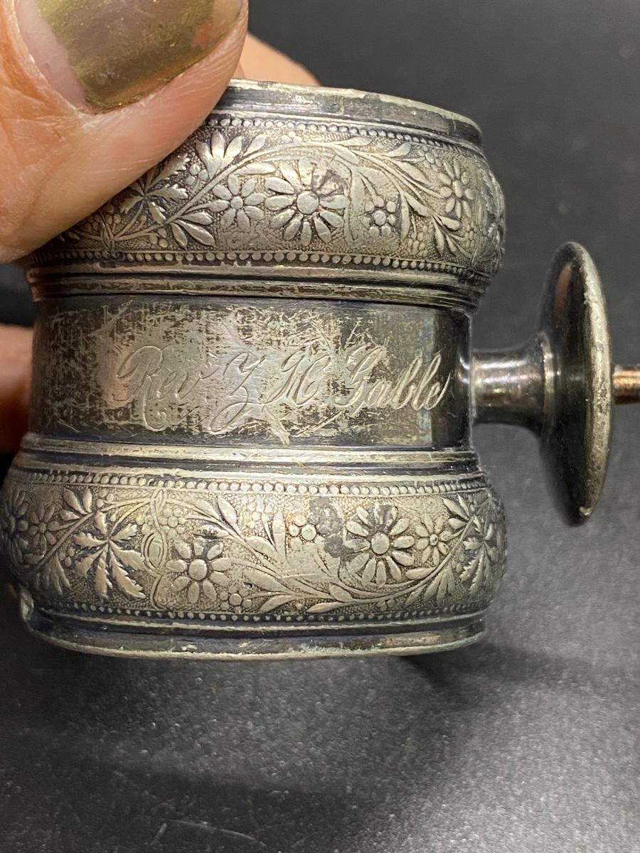 Interesting antique tableware piece. Looks like a napkin ring/salt cellar combination. Salt cellar is removable and could be set aside. Ring has a stamped floral pattern and a name engraved. Silver plate made by Meriden. There is some bent places and damage along the edge of ring.