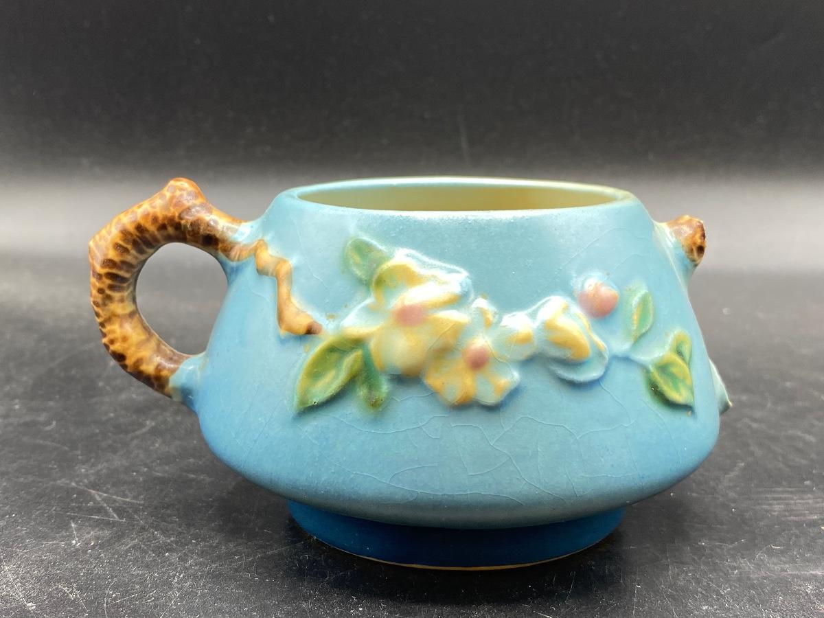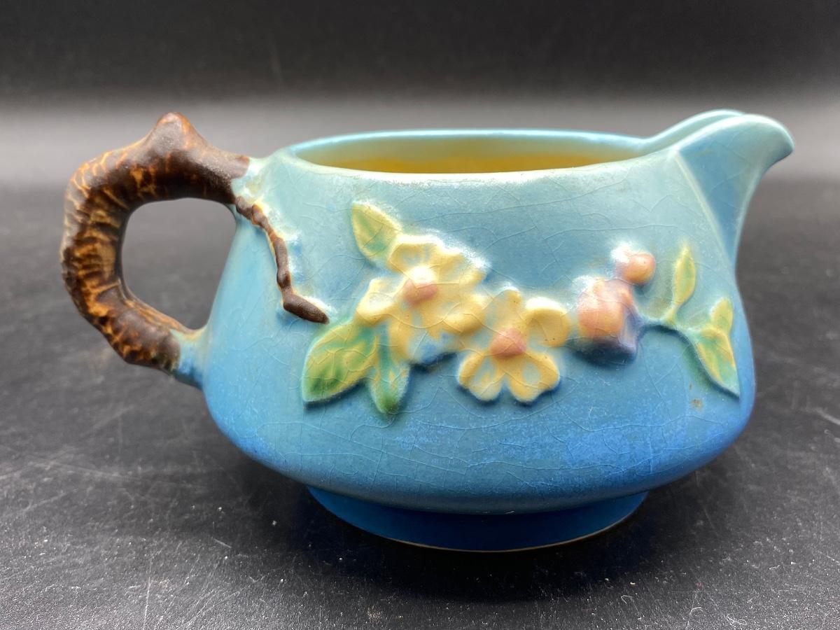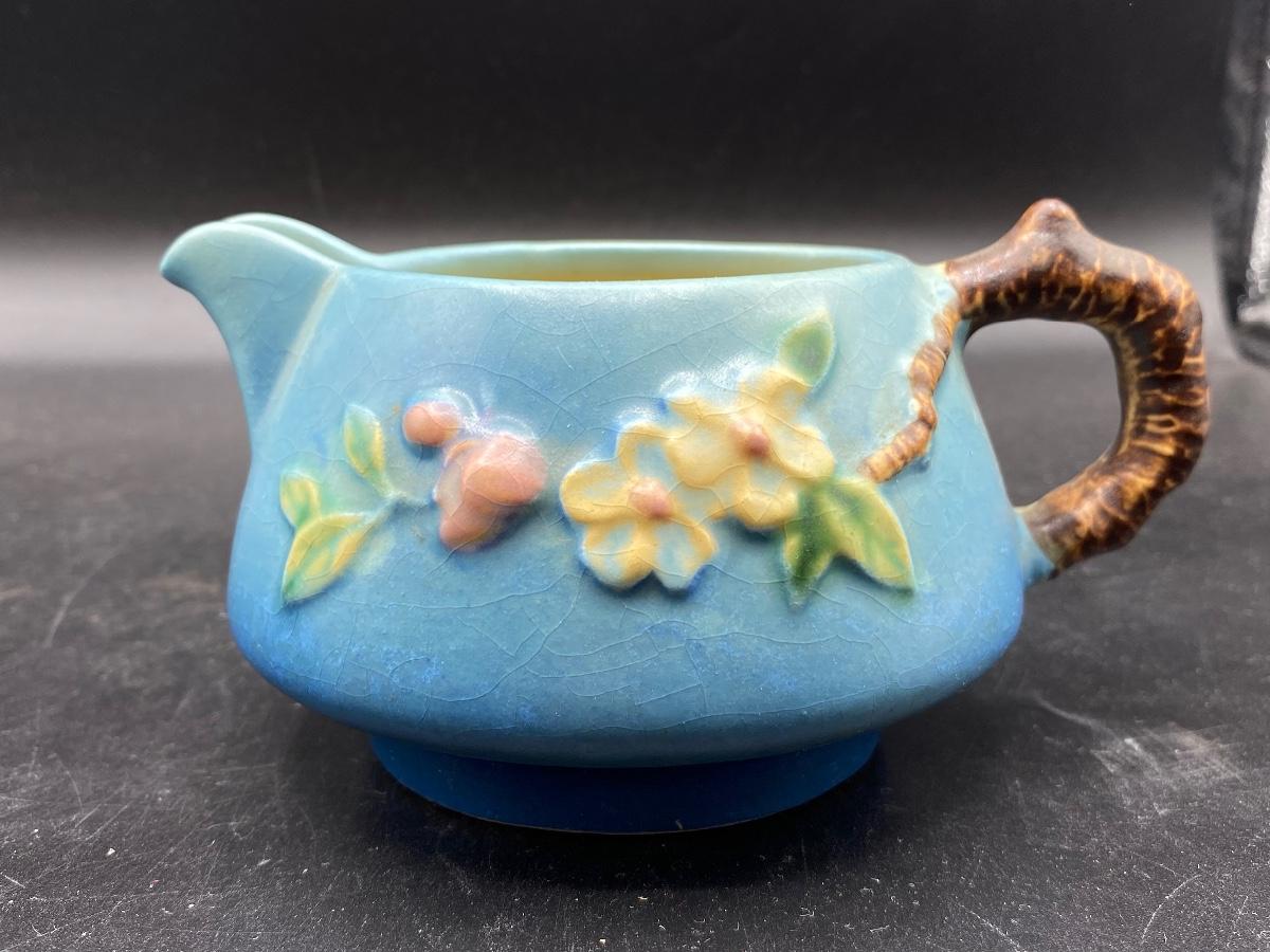 Vintage Roseville Pottery Robins Egg Blue Cream & Sugar Set. Floral apple blossom design with tree branch style handles. Unfortunately the sugar bowl has had a handle broken off. Display great, no damage to the creamer. There is crazing on both pieces. Marked on the bottom 371s & 371c.