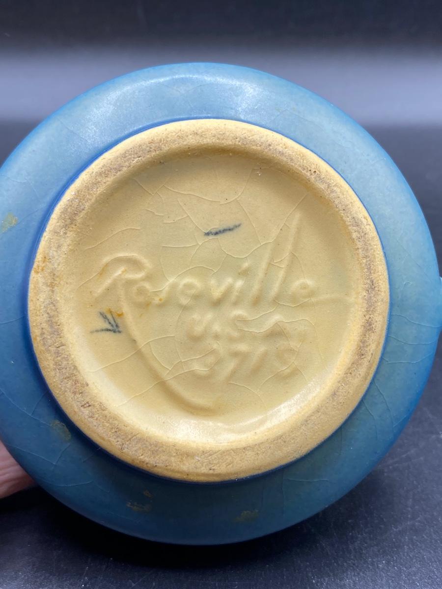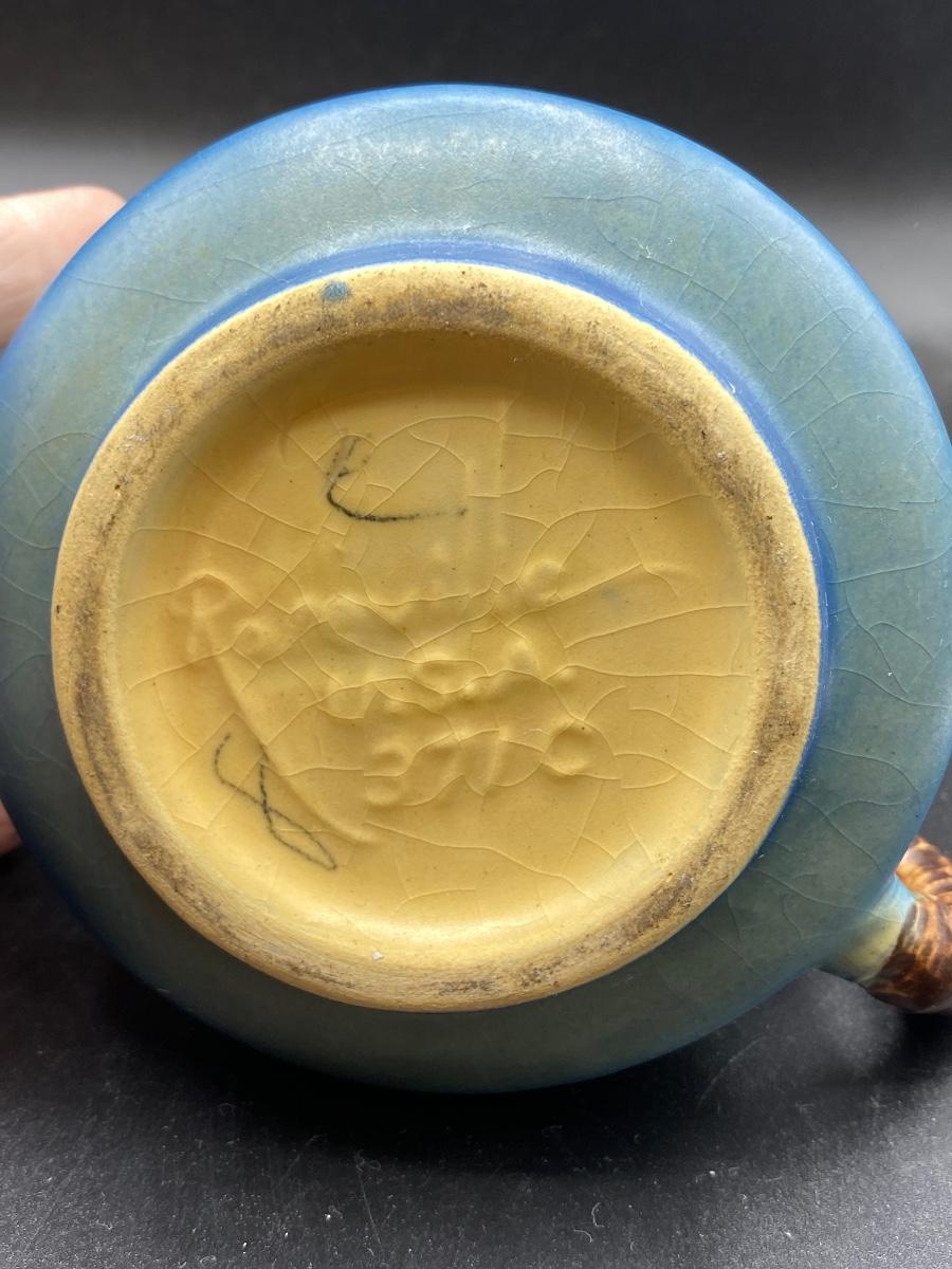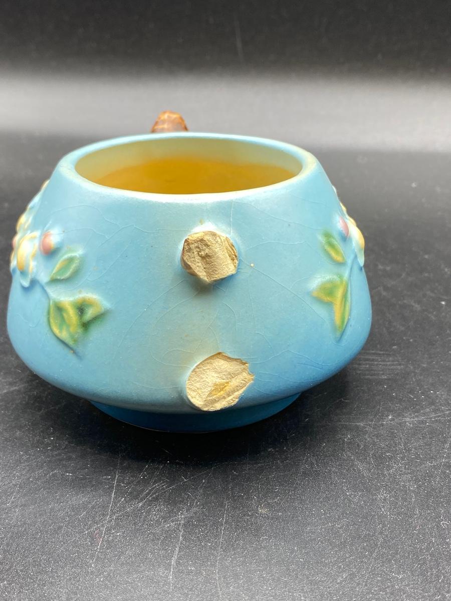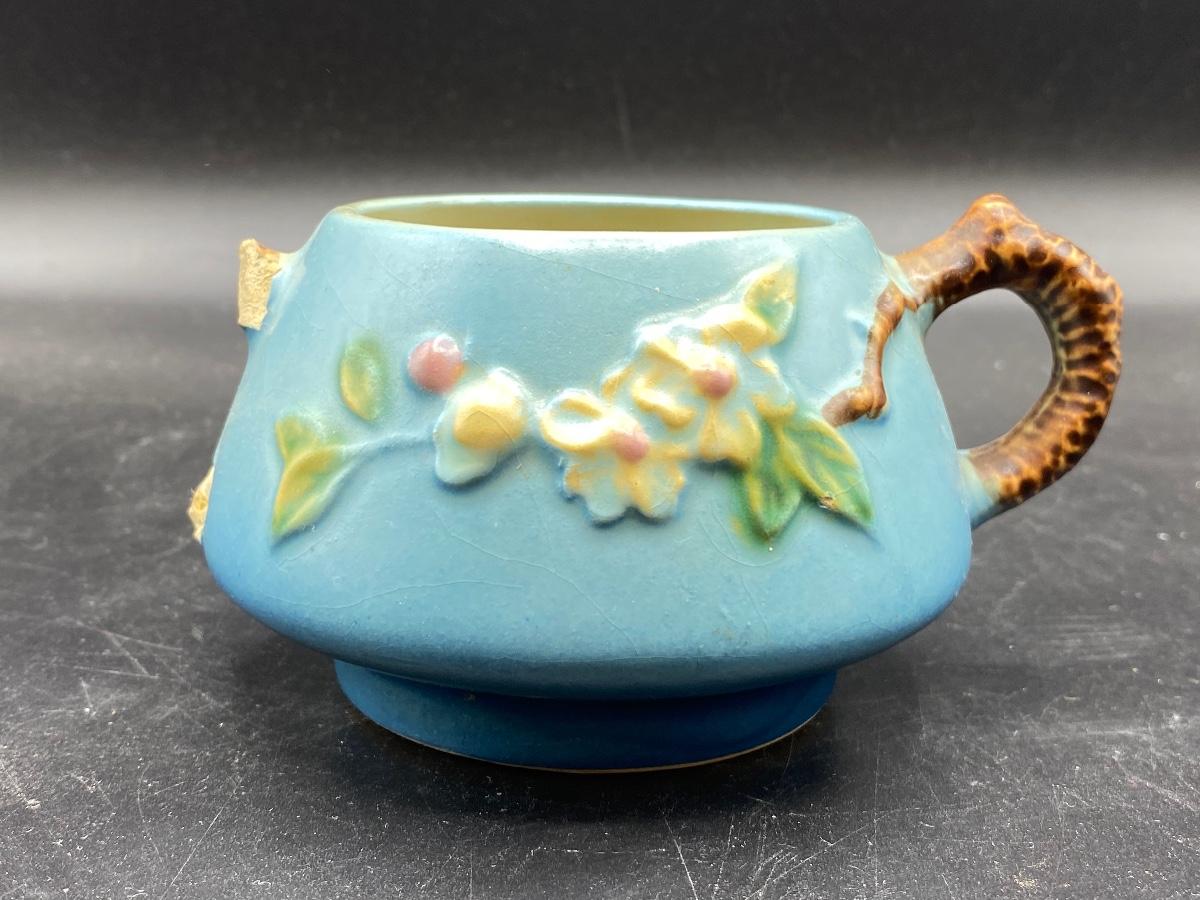 Vintage Roseville Pottery Robins Egg Blue Cream & Sugar Set. Floral apple blossom design with tree branch style handles. Unfortunately the sugar bowl has had a handle broken off. Display great, no damage to the creamer. There is crazing on both pieces. Marked on the bottom 371s & 371c.