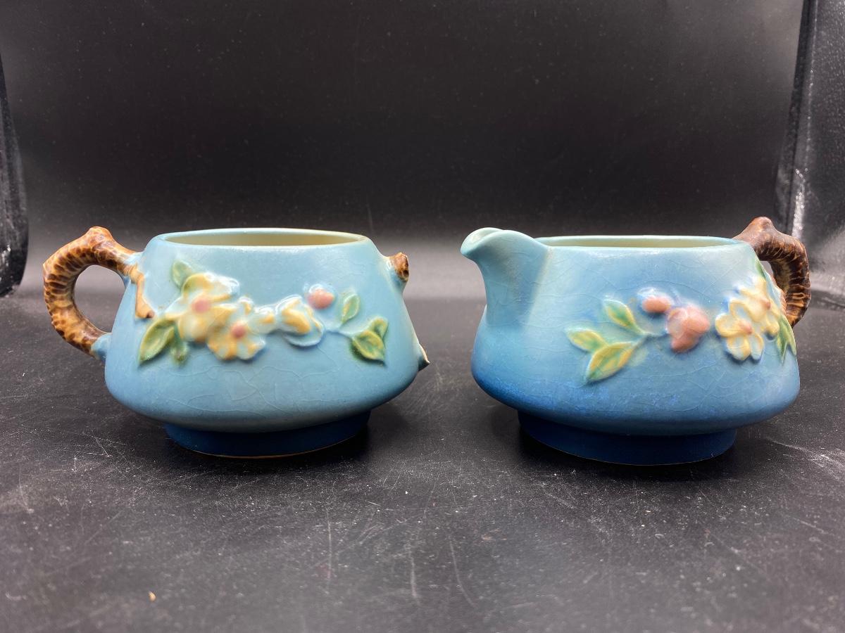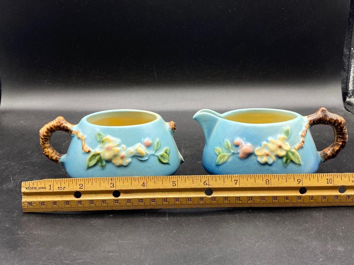 Vintage Roseville Pottery Robins Egg Blue Apple Blossom Cream & Sugar Set