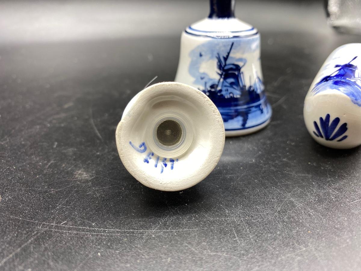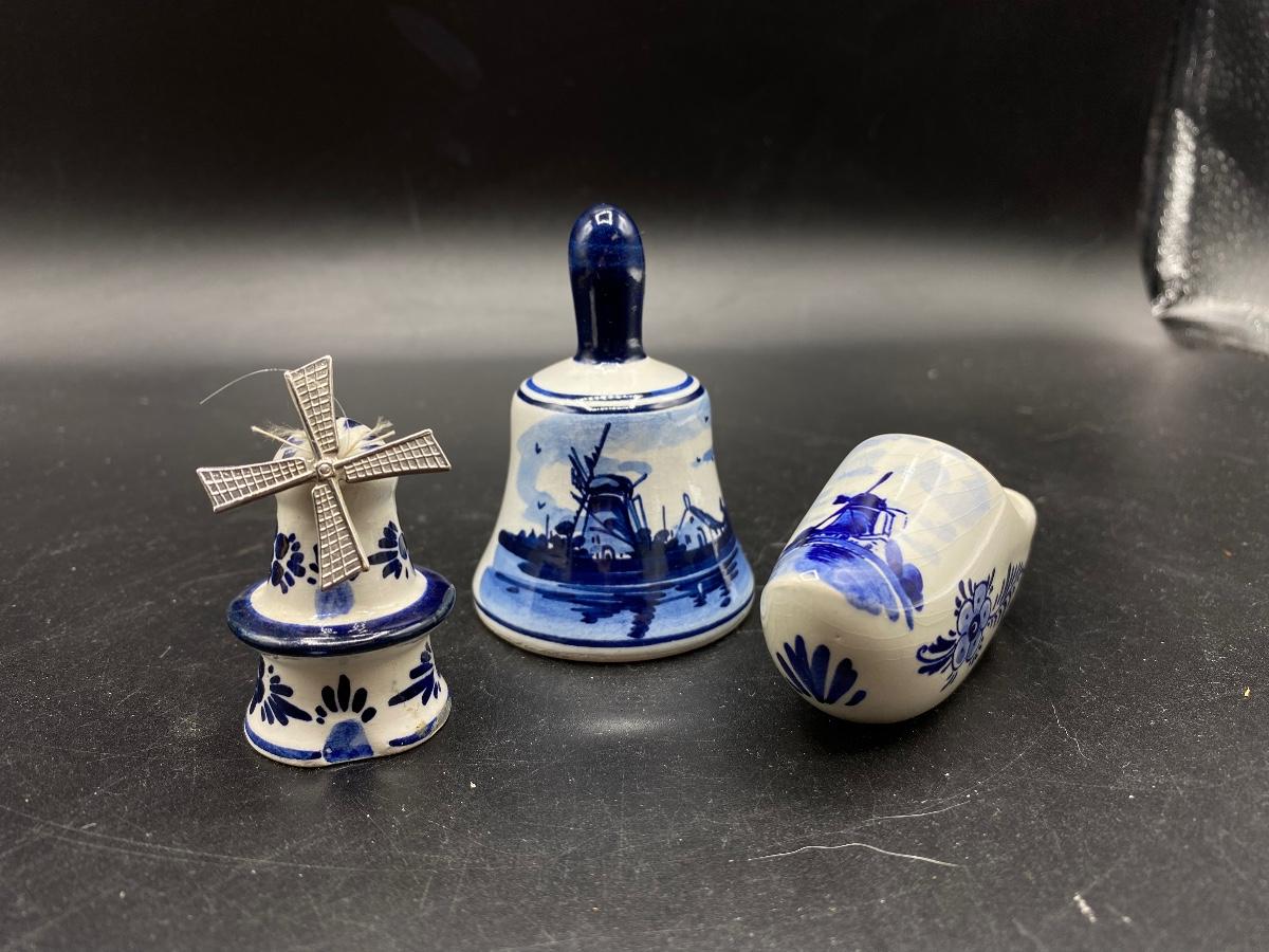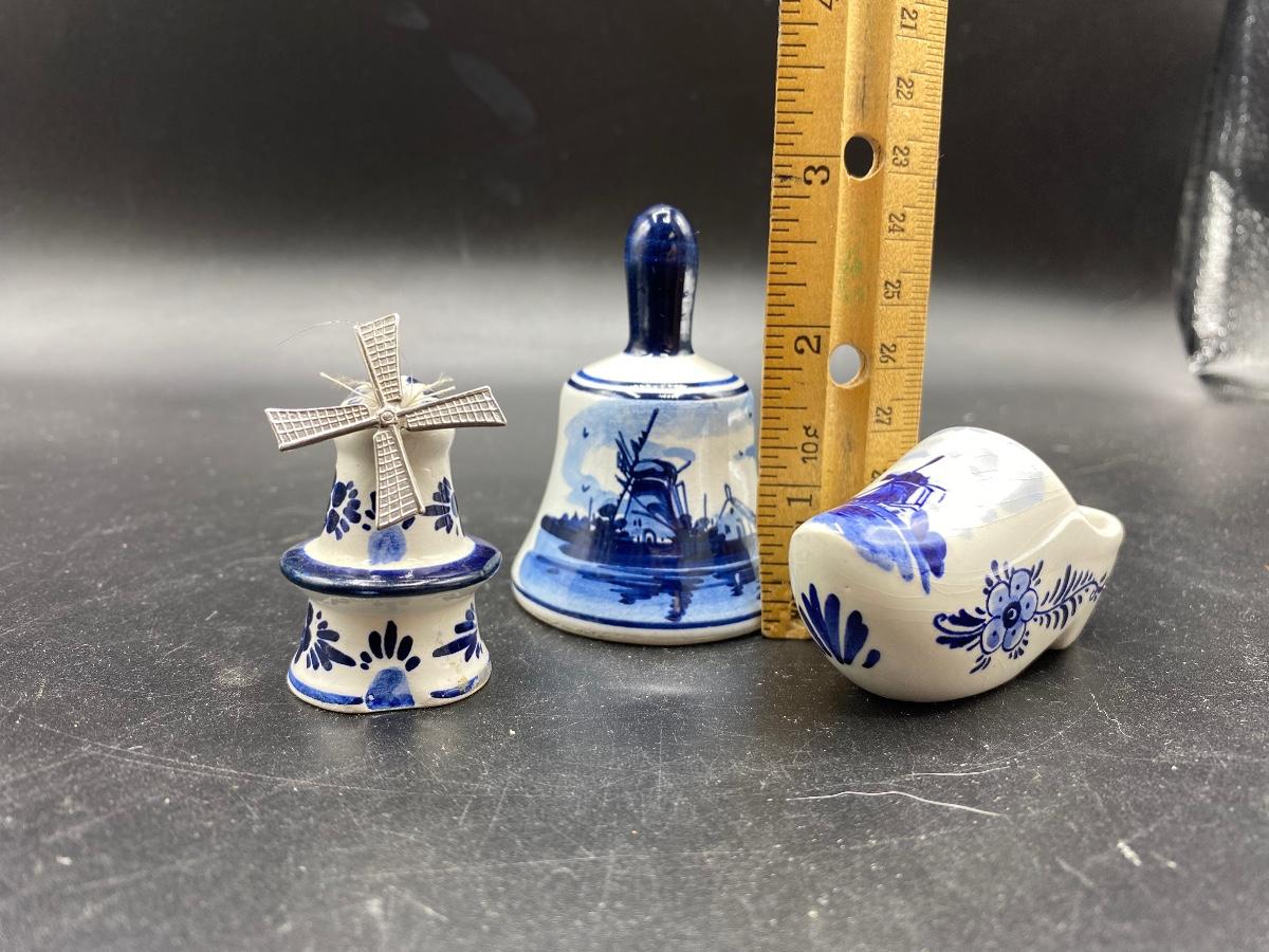 Set of 3 vintage Delft collectible miniatures. A windmill salt shaker, a small bell, and a ceramic shoe. All are marked, good conditions. Under 3" size.
