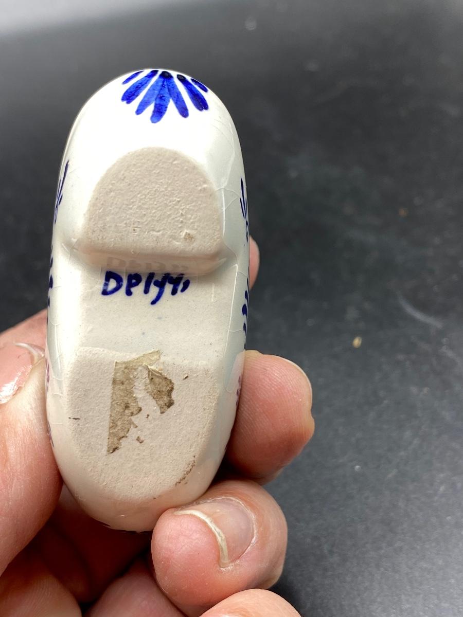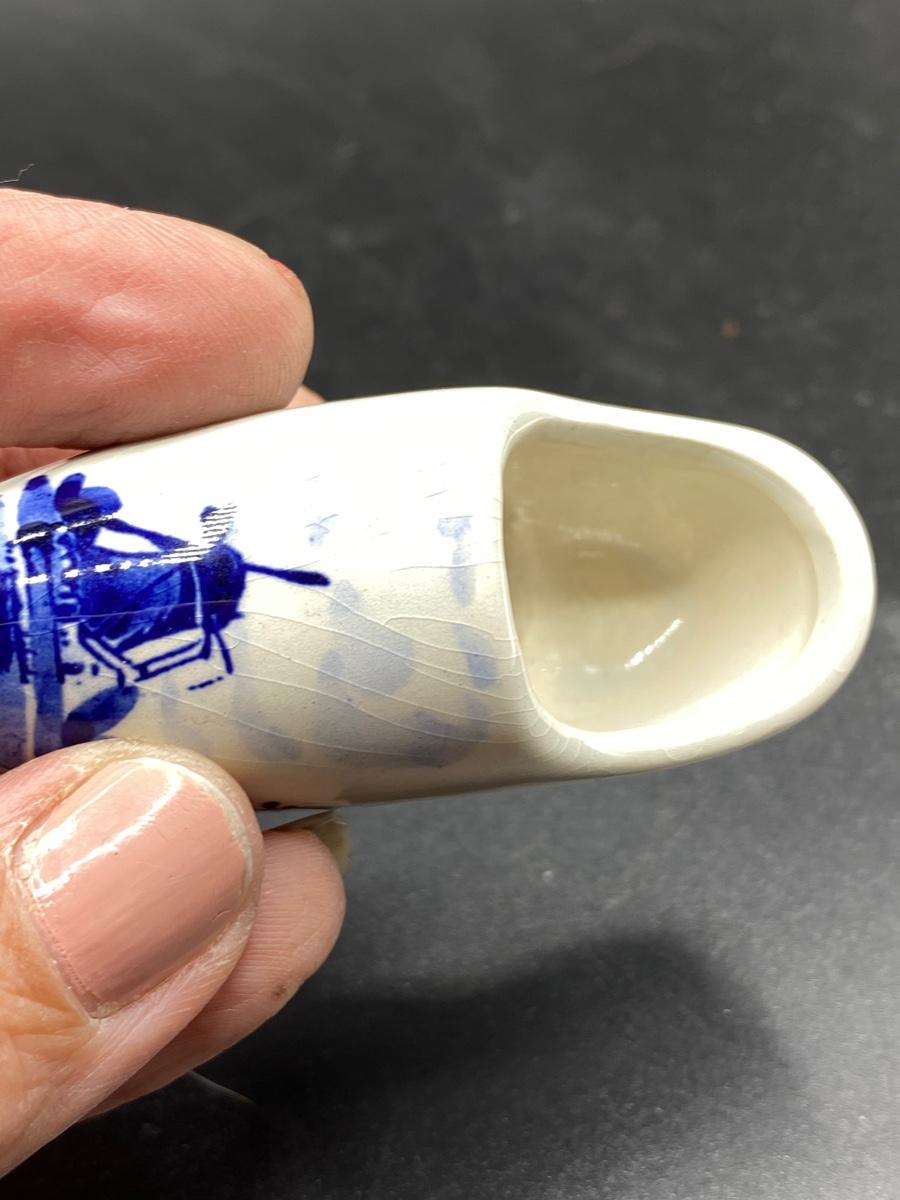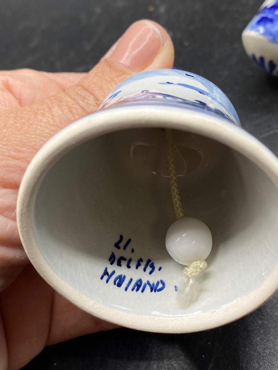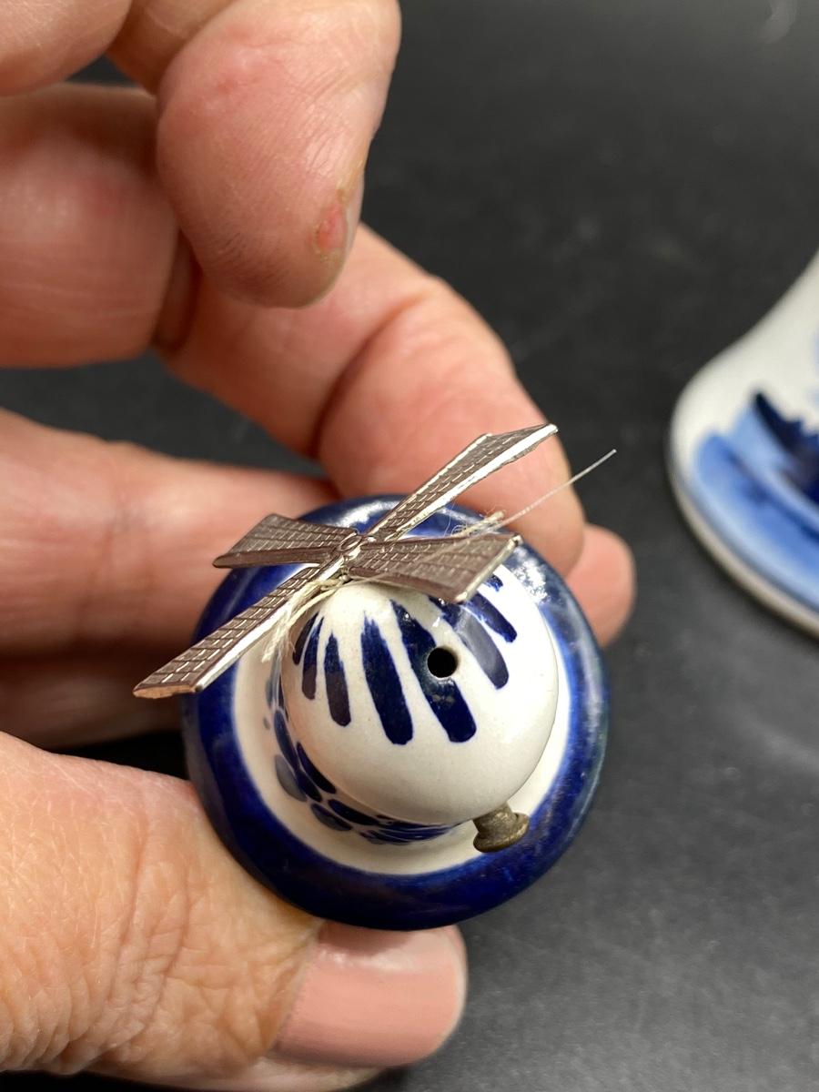 Set of 3 vintage Delft collectible miniatures. A windmill salt shaker, a small bell, and a ceramic shoe. All are marked, good conditions. Under 3" size.