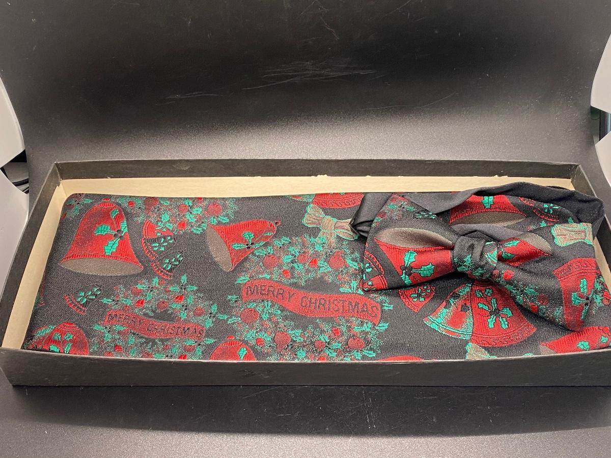 Vintage holiday cummerbund and bow tie set. Black with a red & green Merry Christmas pattern. Adjustable. Size around medium.