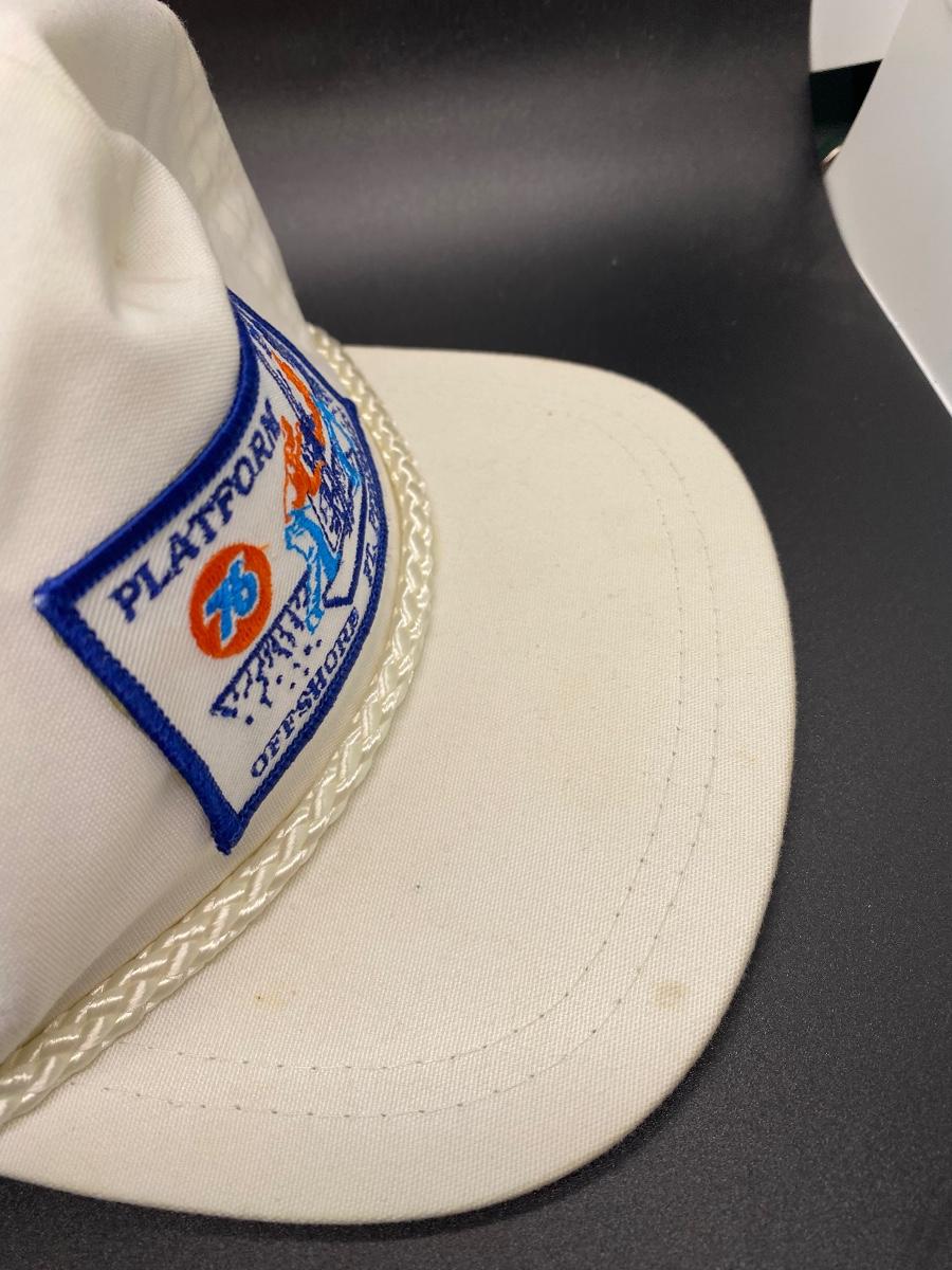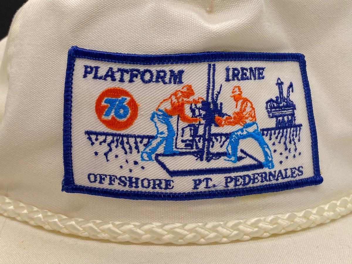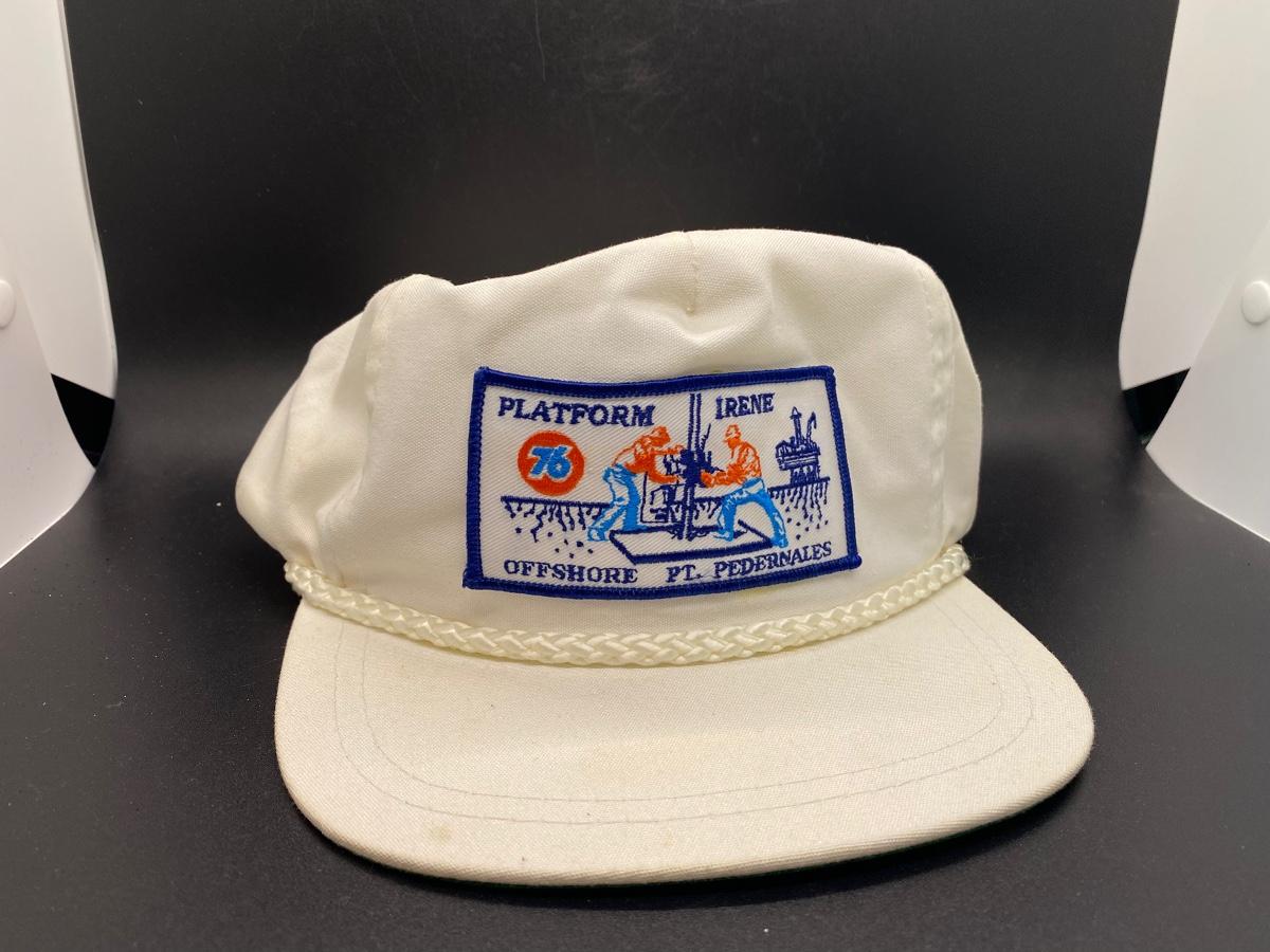 Vintage white Unocal 76 Platform Irene trucker hat. Adjustable one size fit. In good vintage condition. Some very light discolor, bill is very flat not broken.