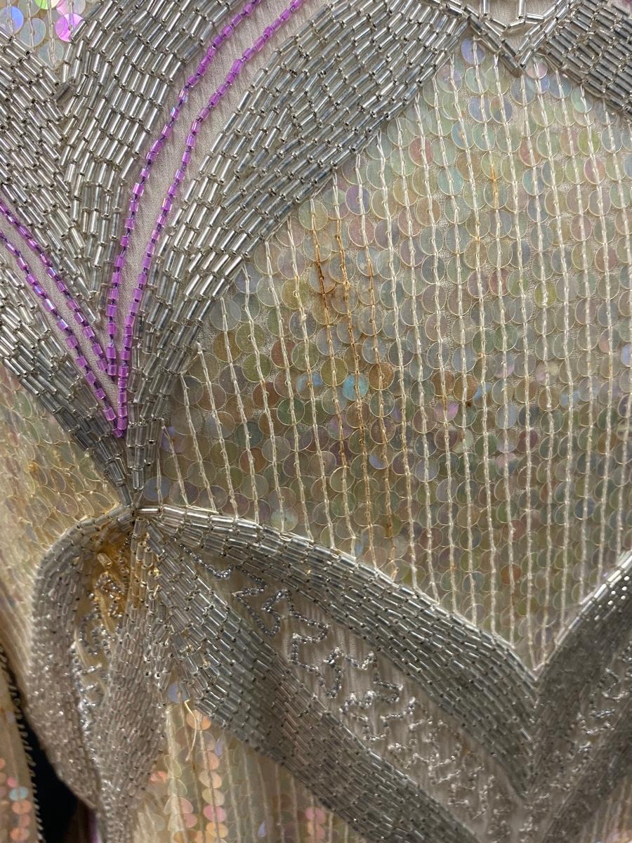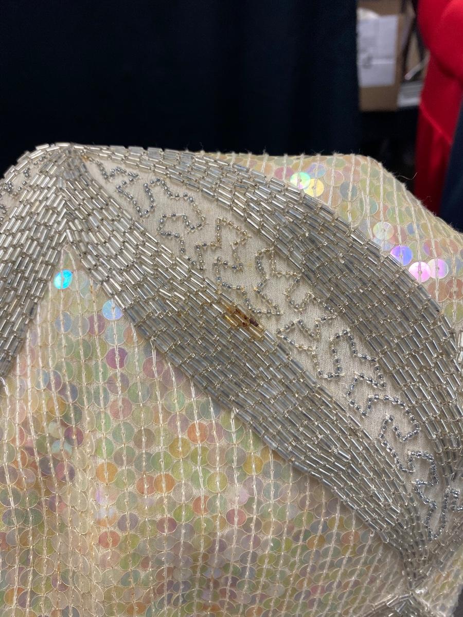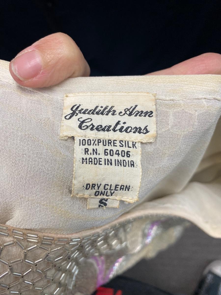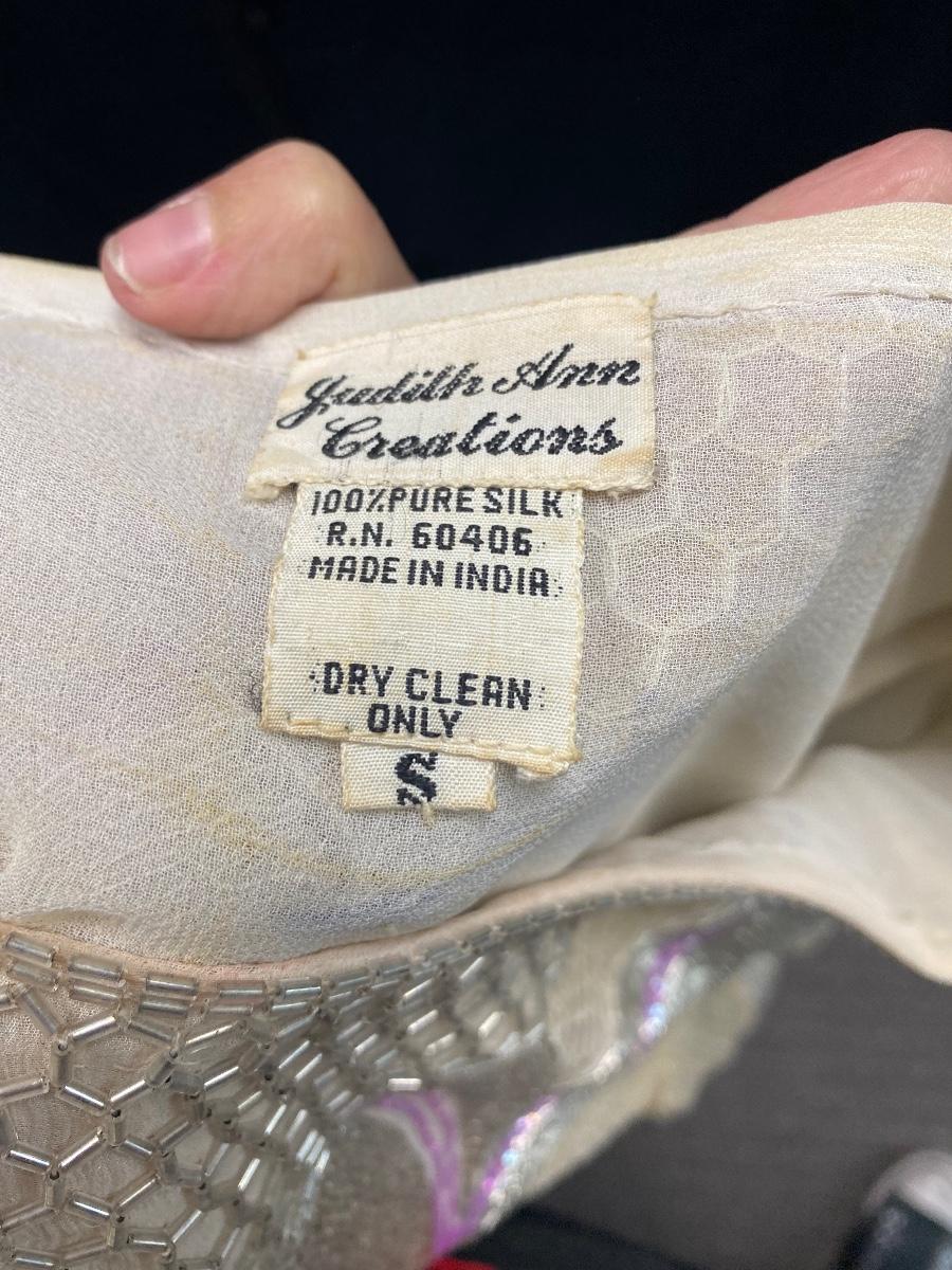 Vintage woman's silk party dress. Fully beaded and sequined design. Extremely heavy. Has a belt, can be worn with or without. There is some spots on the front, may come clean, they look to be on the surface. Light discolor from age. Did find a spot where there is missing sequins on the bottom back. About knee length. Made by Judith Ann Creations. Tag says size small, but it fit mannequin ok so it may fit a size 10 maybe 12. There is no zipper, over the head on/off.