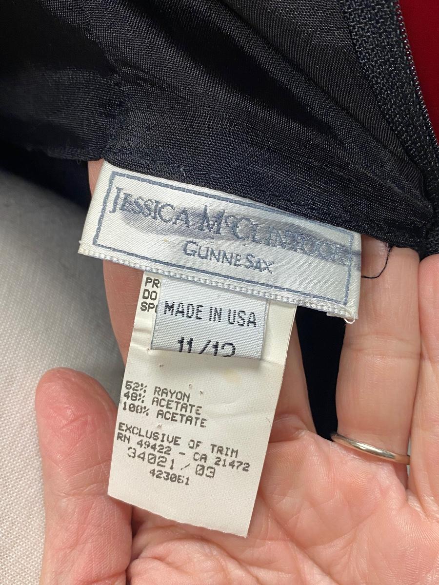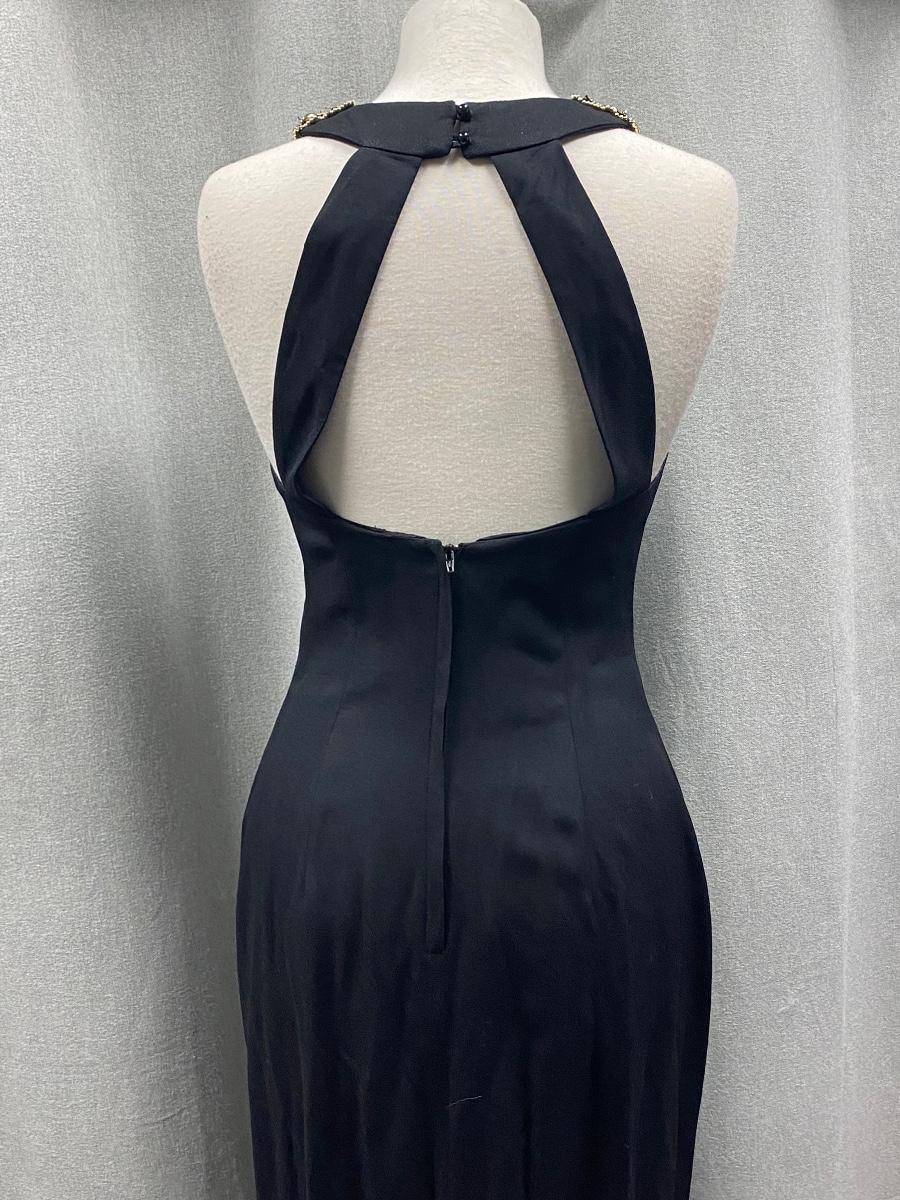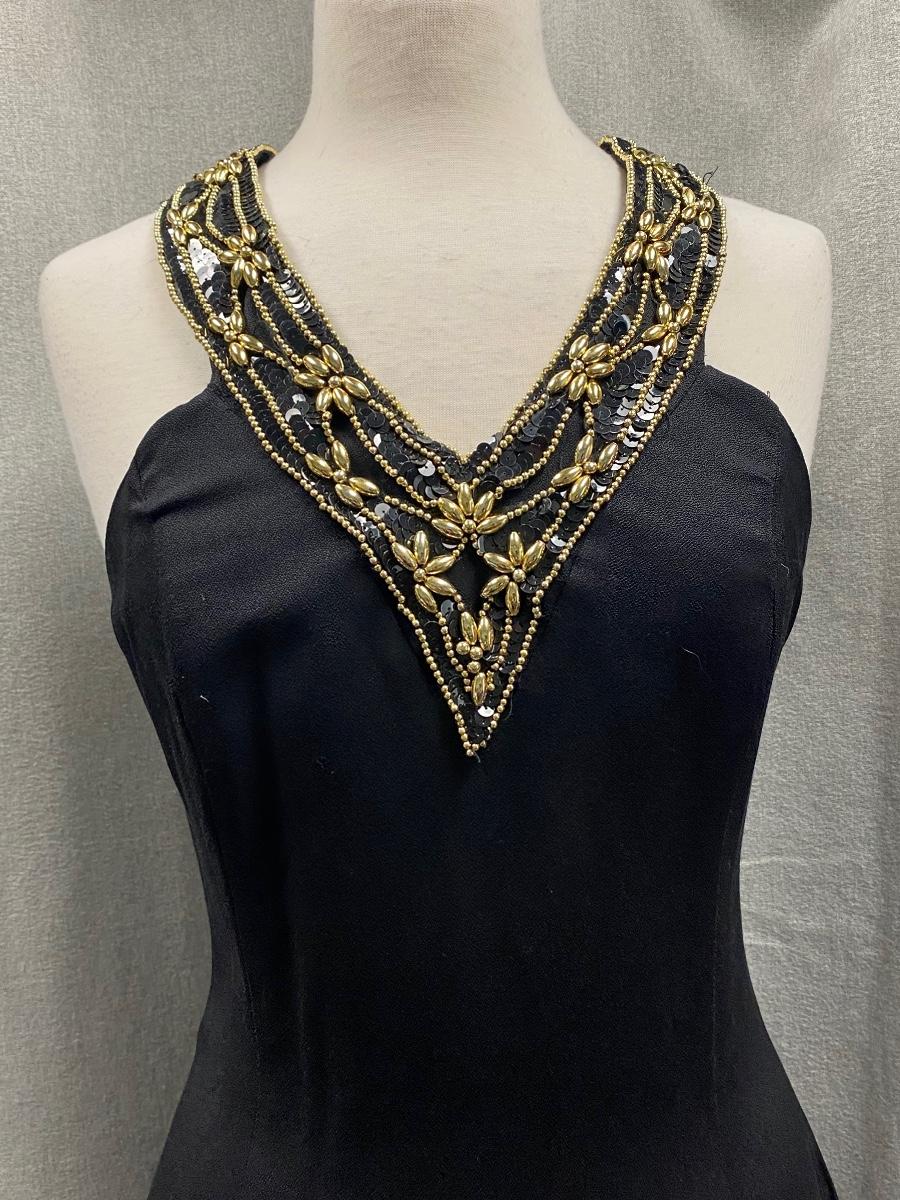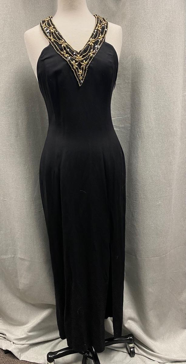 Woman's black fitted formal cocktail dress from Jessica McClintock. Full length fitted style with beaded collar. Good condition. Size 11/12.