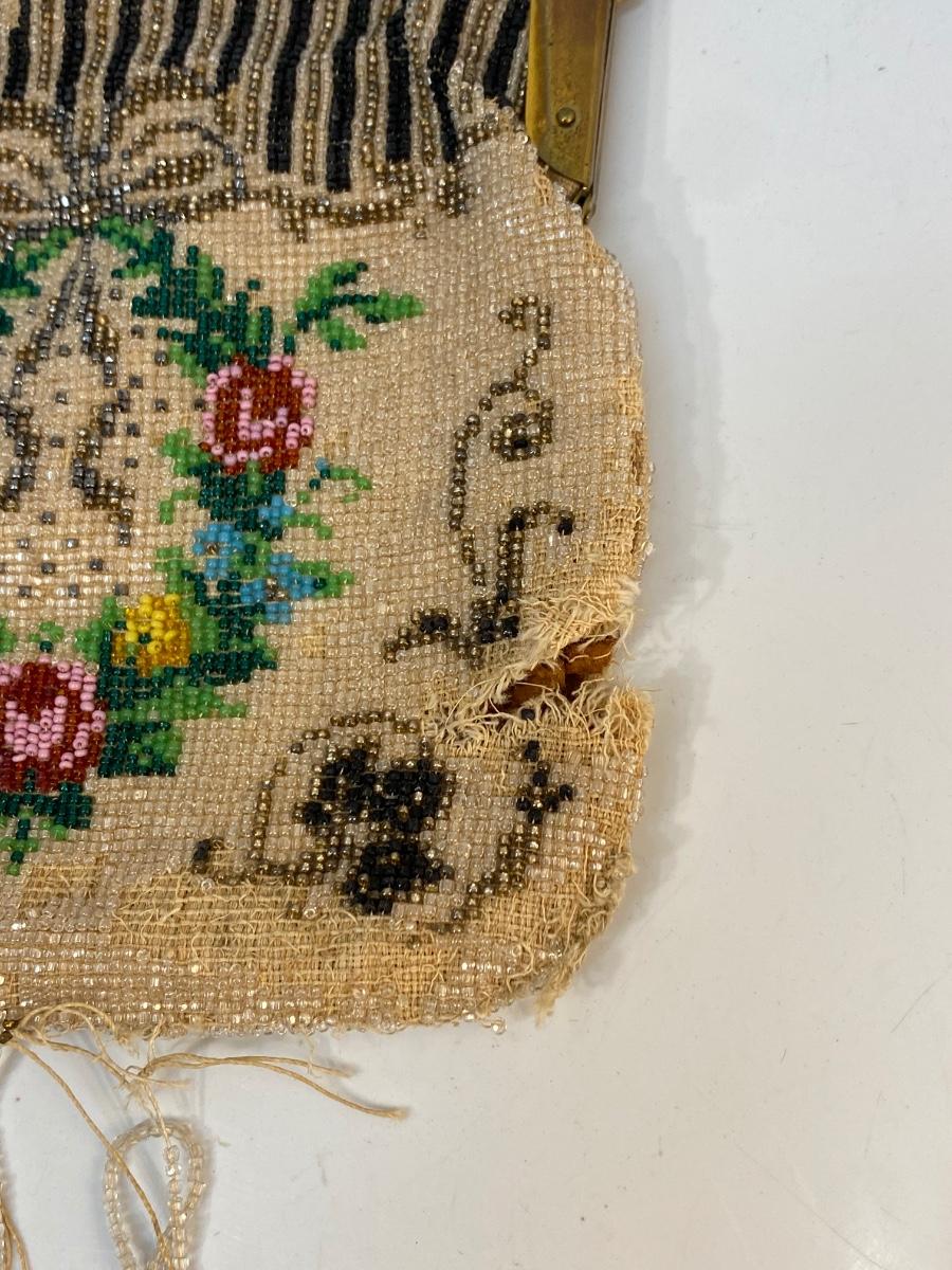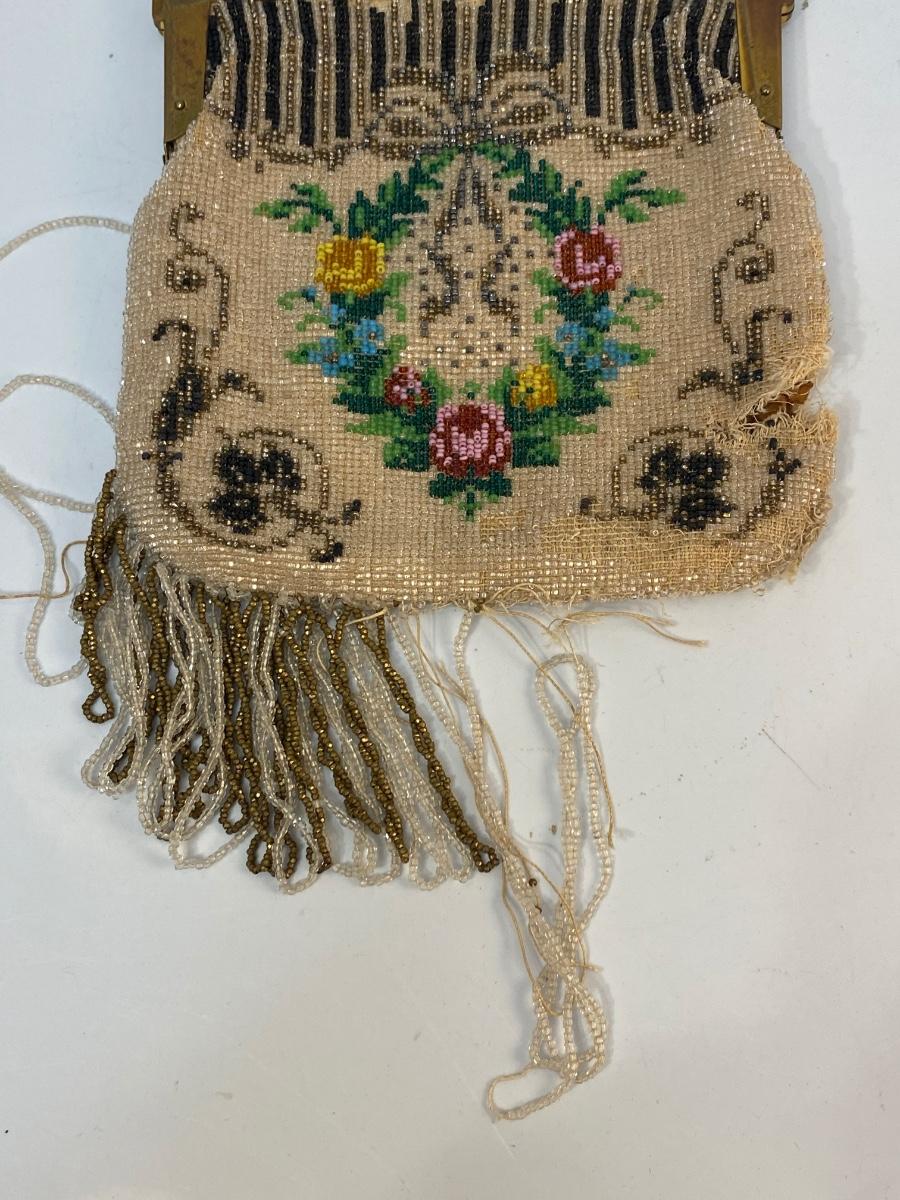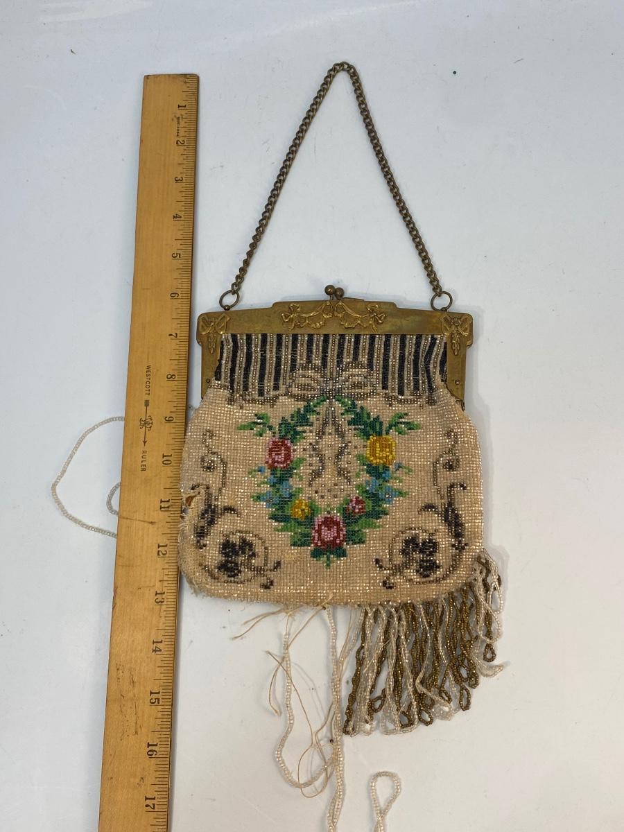 Vintage Antique Microbeaded Glass Bead Purse *Needs Repair*. Beautiful floral design but there is damage to oneside and missing fringe.