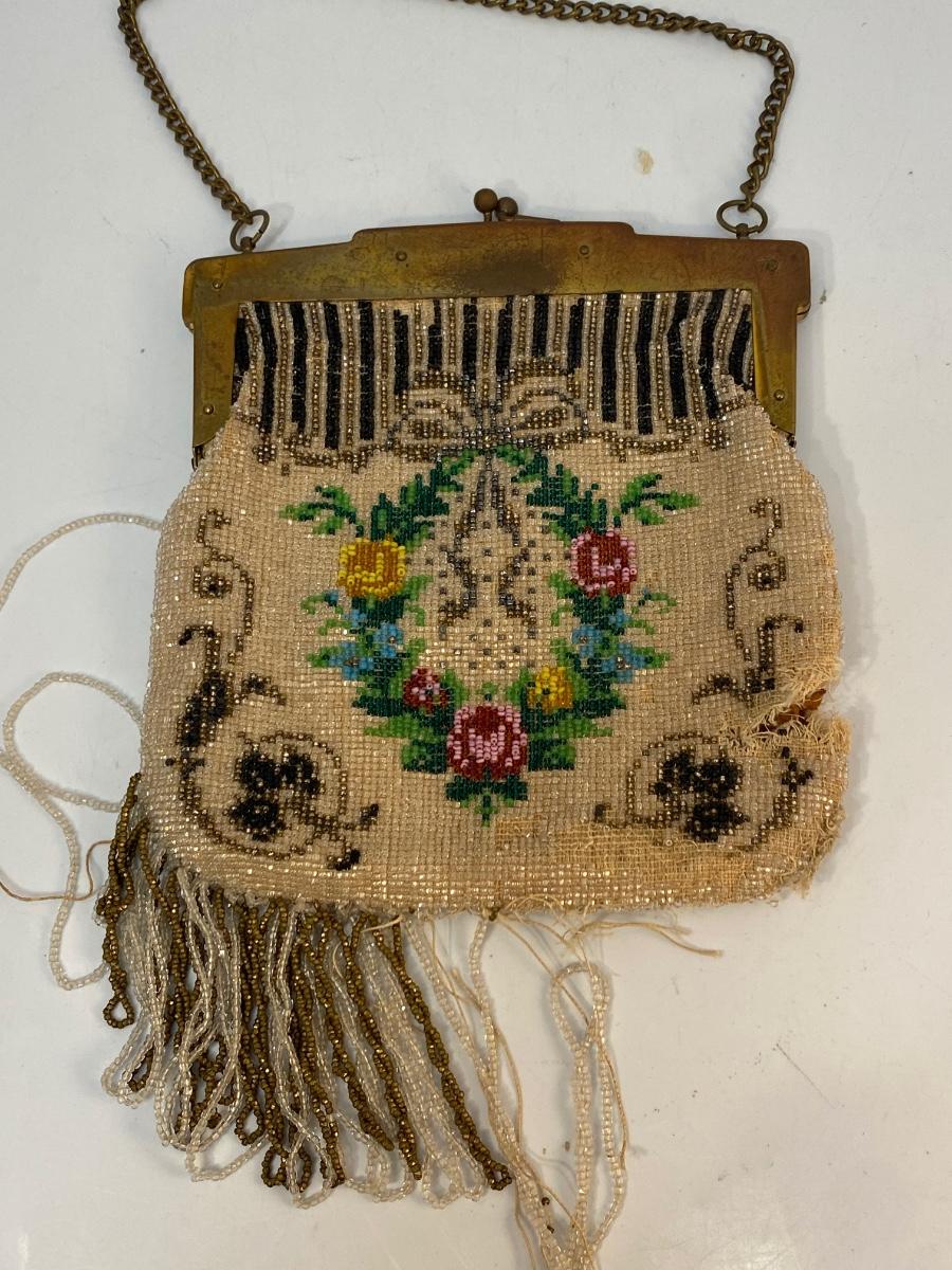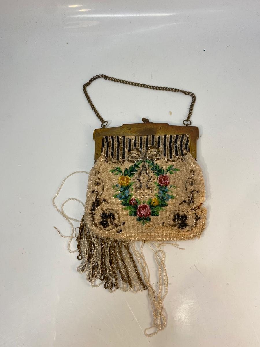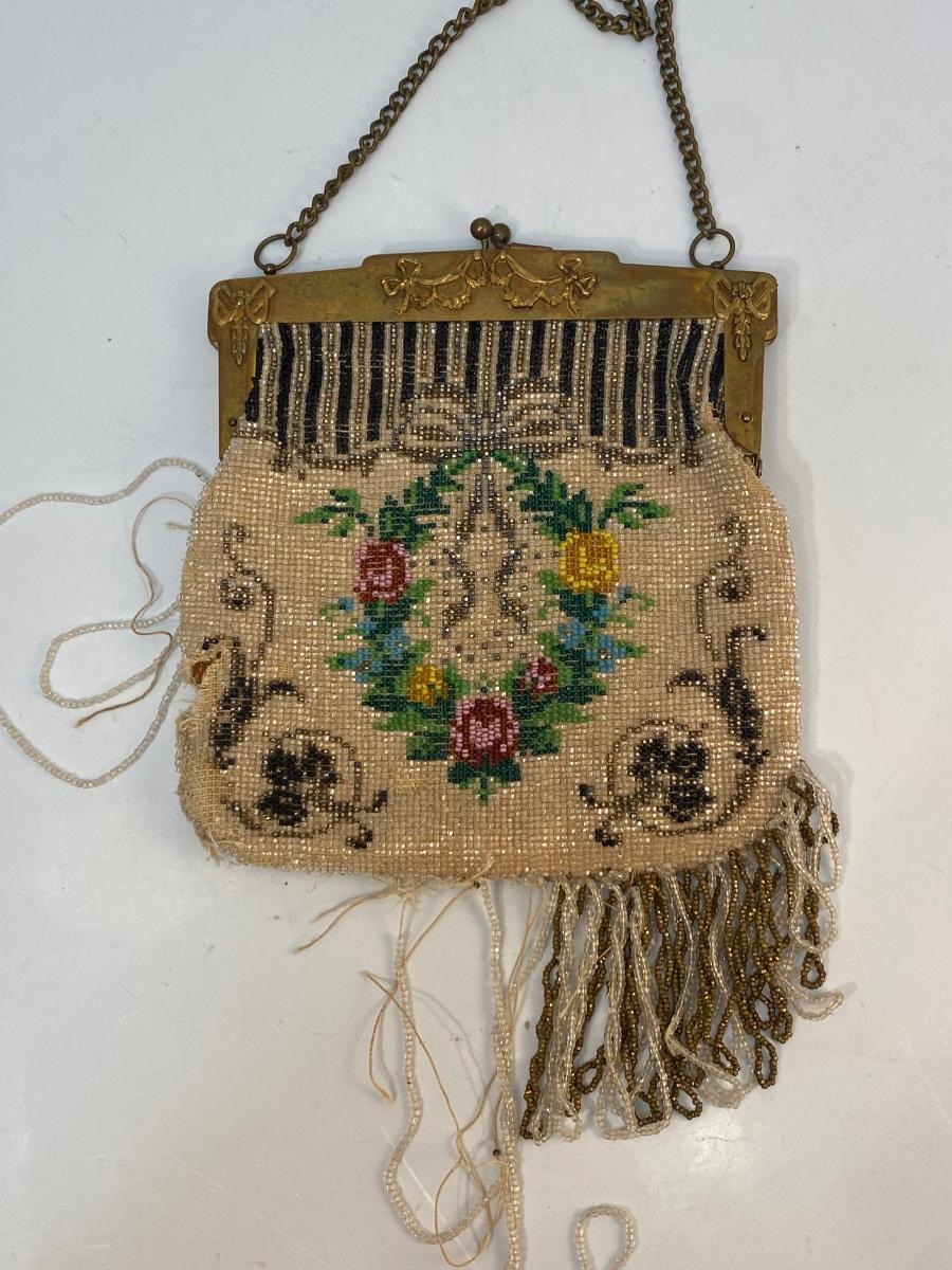 Vintage Antique Microbeaded Glass Bead Purse *Needs Repair*. Beautiful floral design but there is damage to oneside and missing fringe.