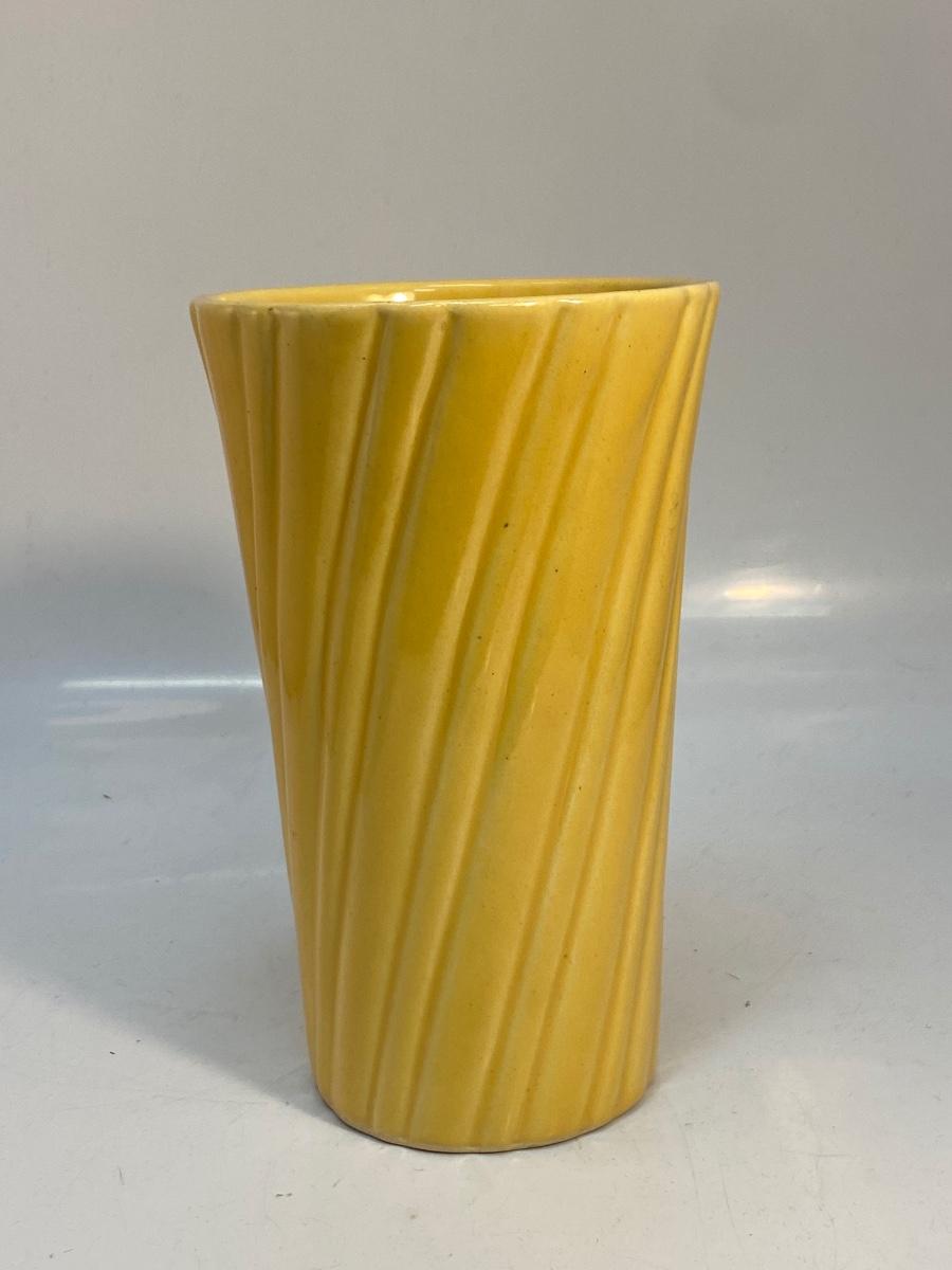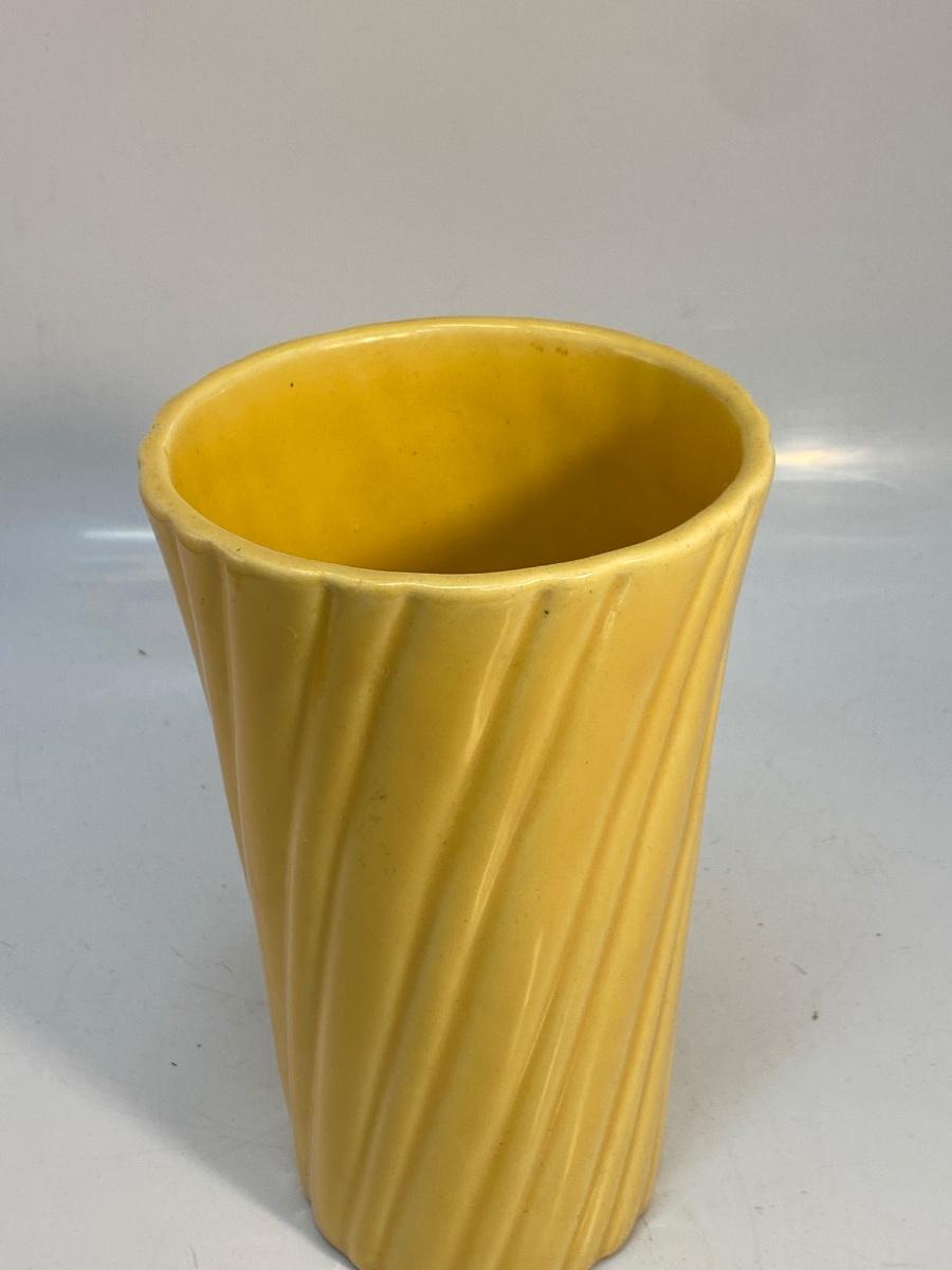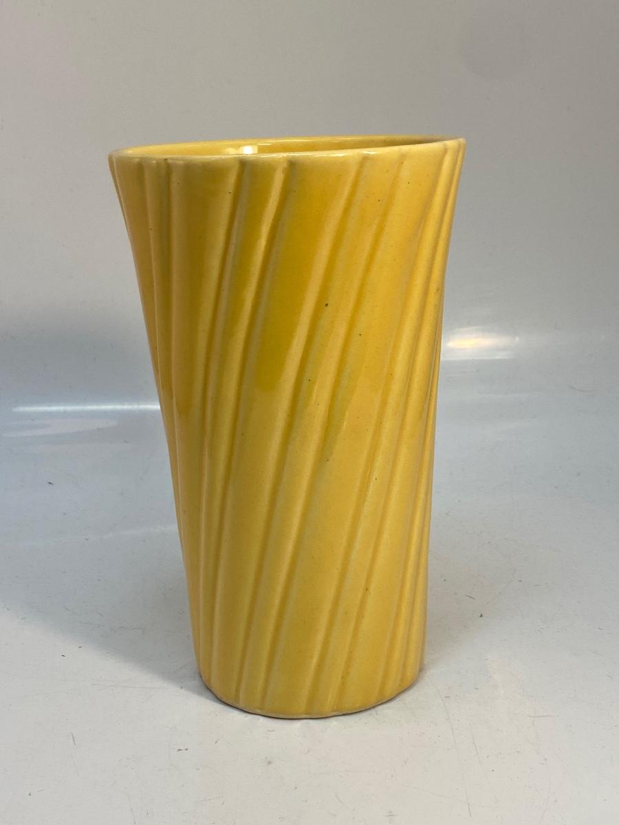 Vintage Sunshine Mustard Yellow Bauer Pottery Swirled Vase. Good vintage condition. Marked bauer USA on the bottom. No chips or cracks. About 8.25" tall.