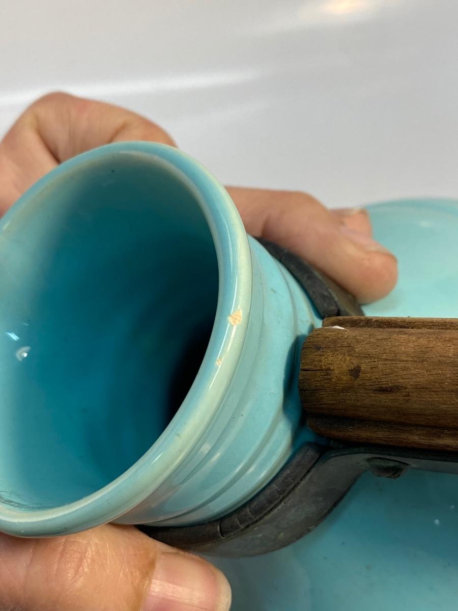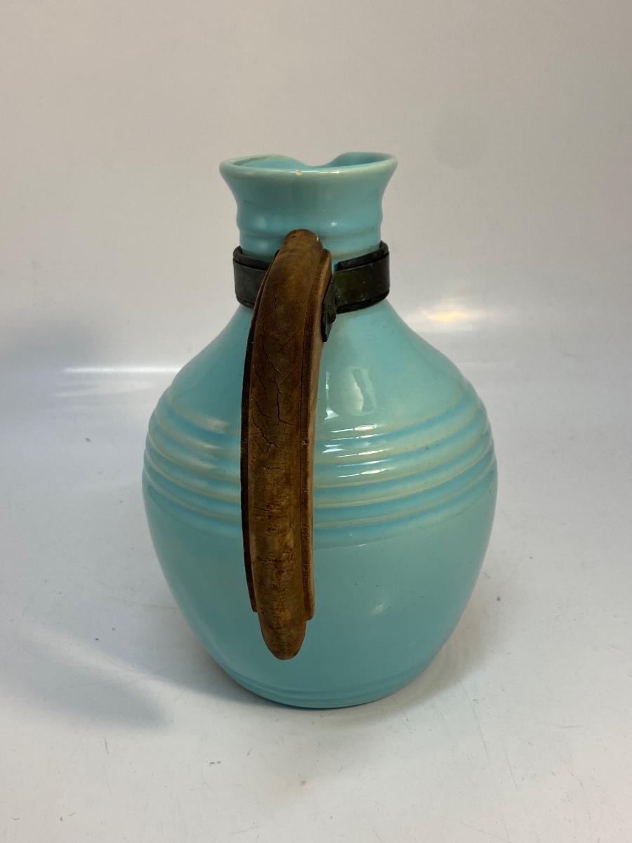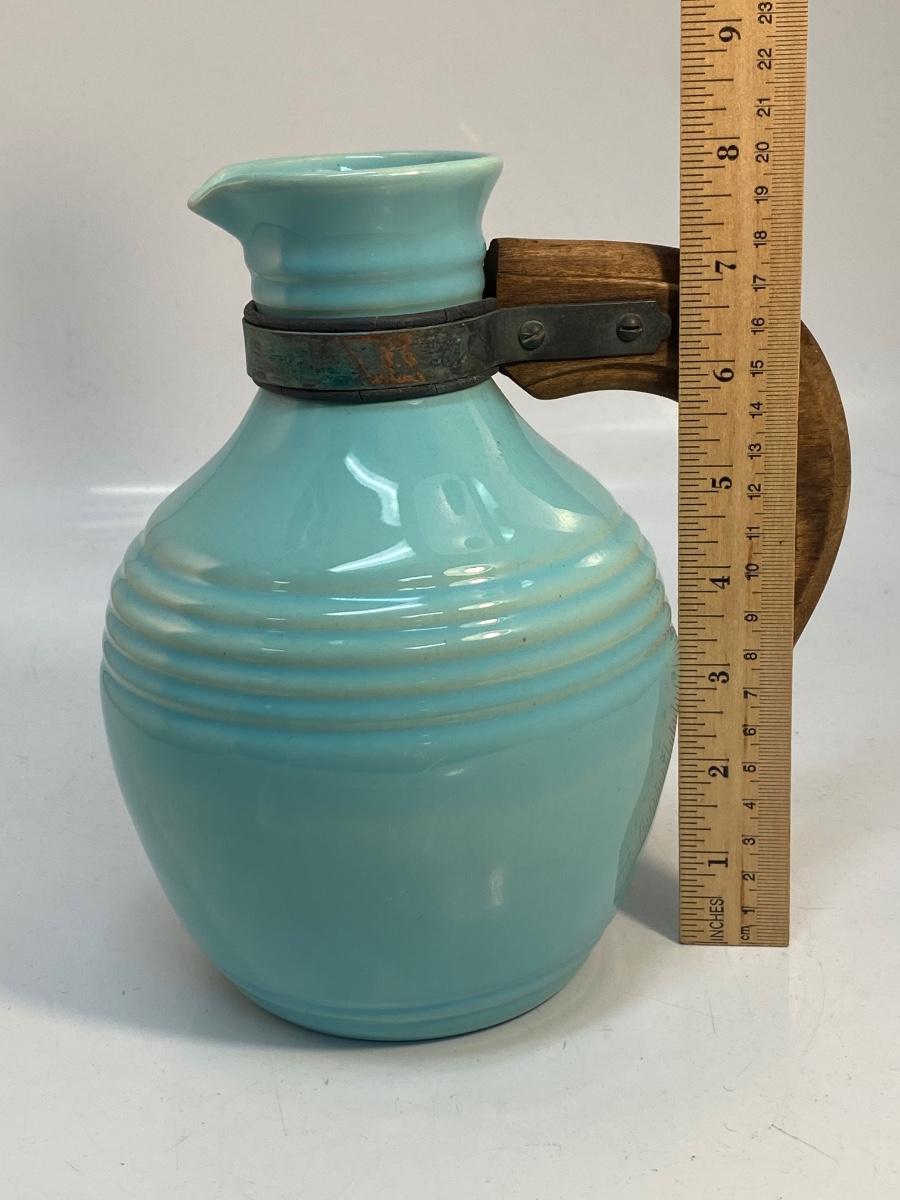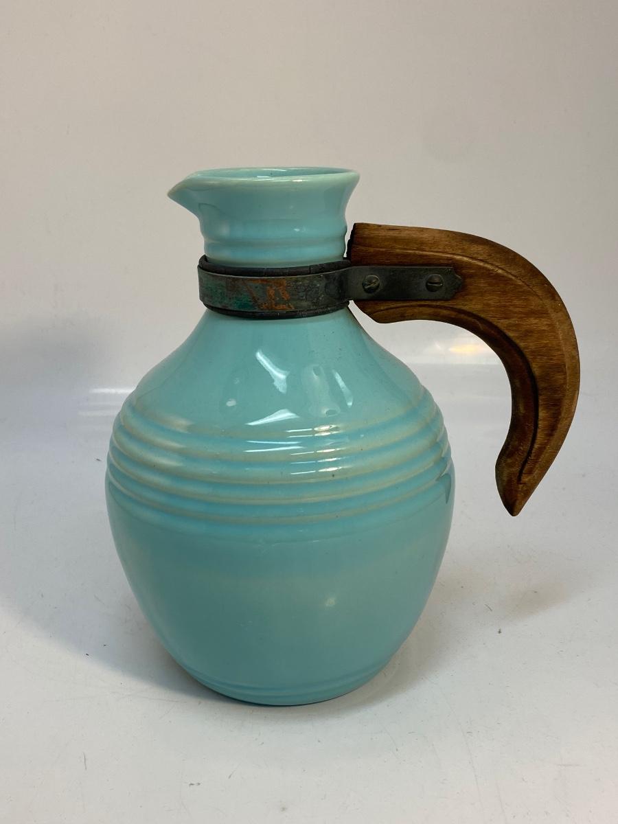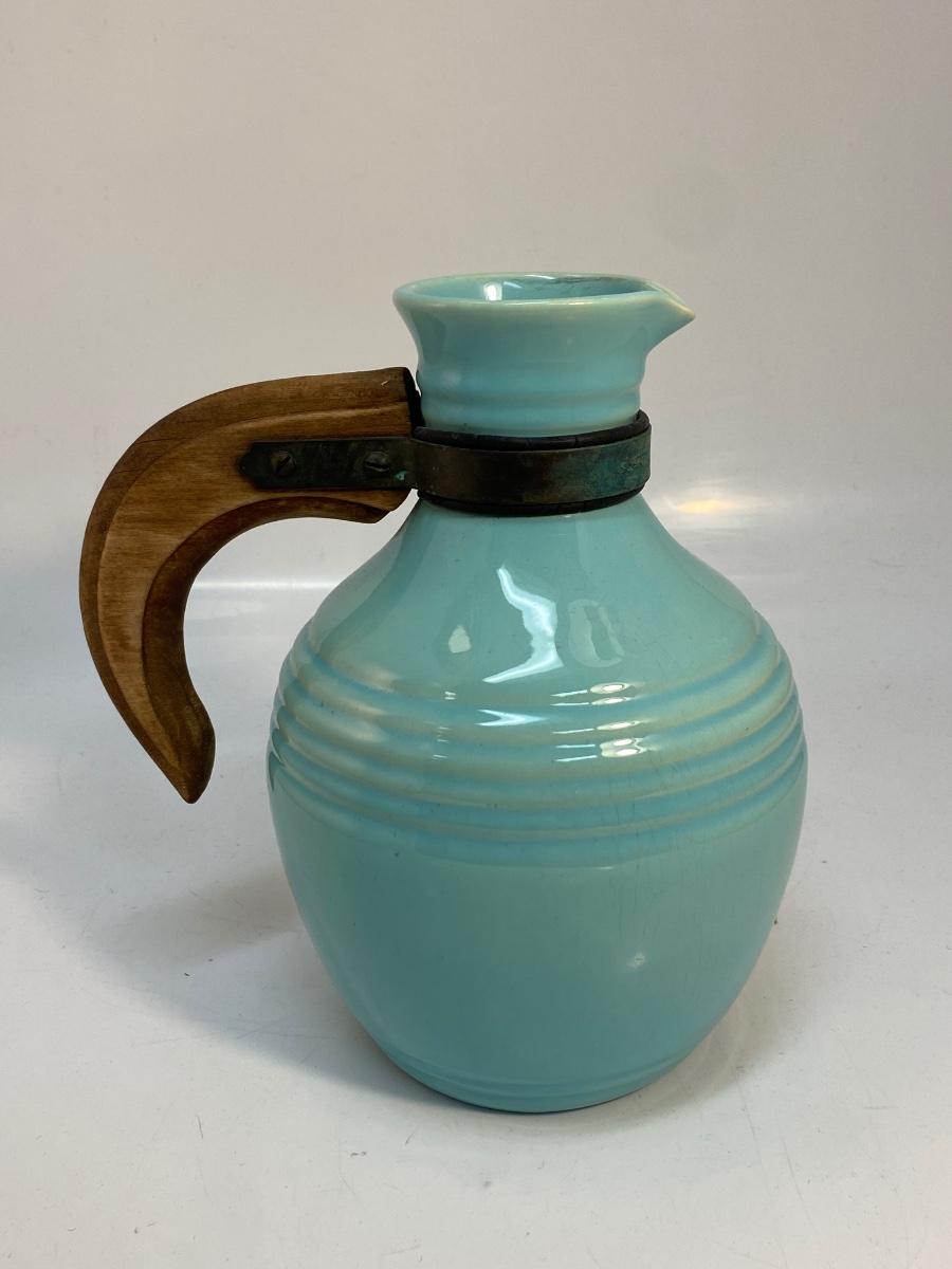 Vintage Mid Century Pacific Pottery Ceramic Rippled Turquoise Blue Pitcher Carafe with Wood Handle