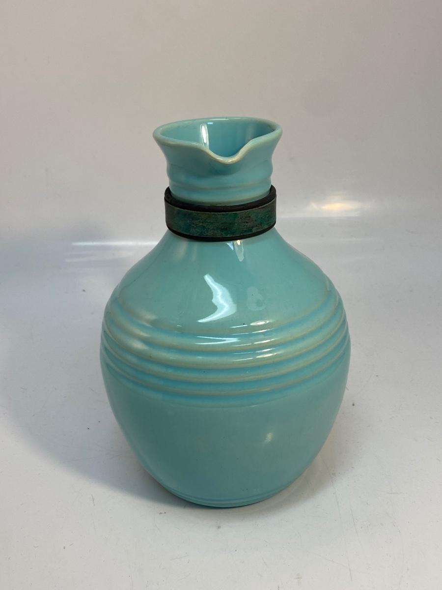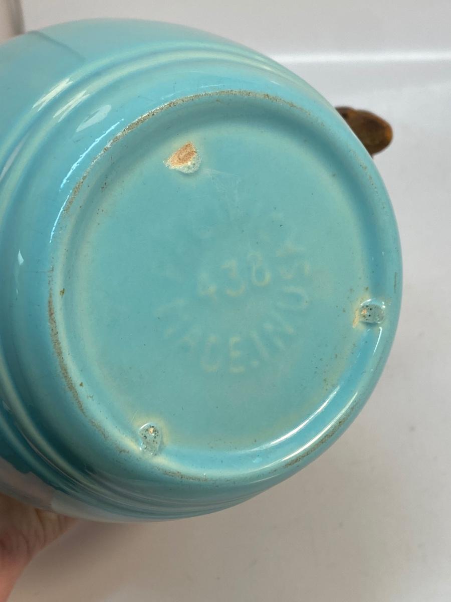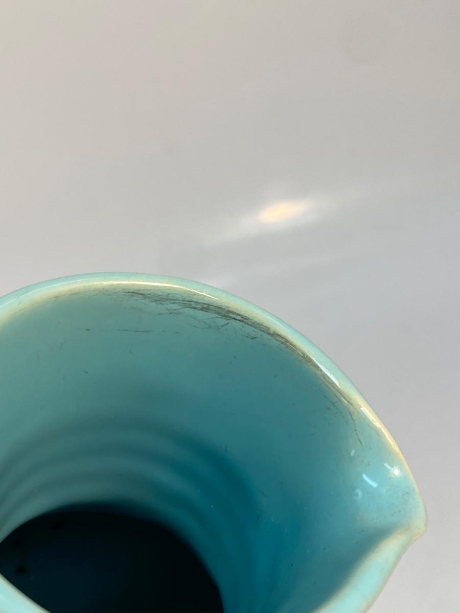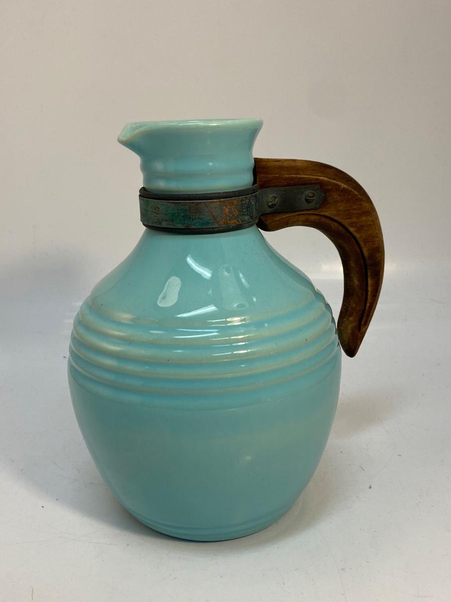 Vintage Mid Century Pacific Pottery Ceramic Rippled Turquoise Blue Pitcher Carafe with Wood Handle. In good vintage condition. There is a very small nick along edge of opening by handle and some scratches that look like utensil marks inside edge. Turquoise or robin's egg blue color. About 8" size.