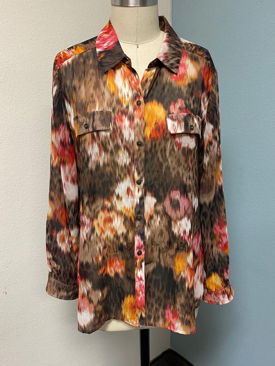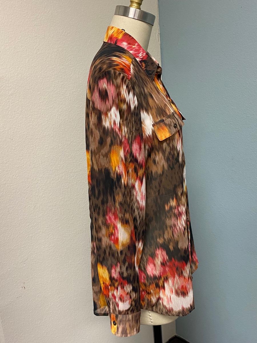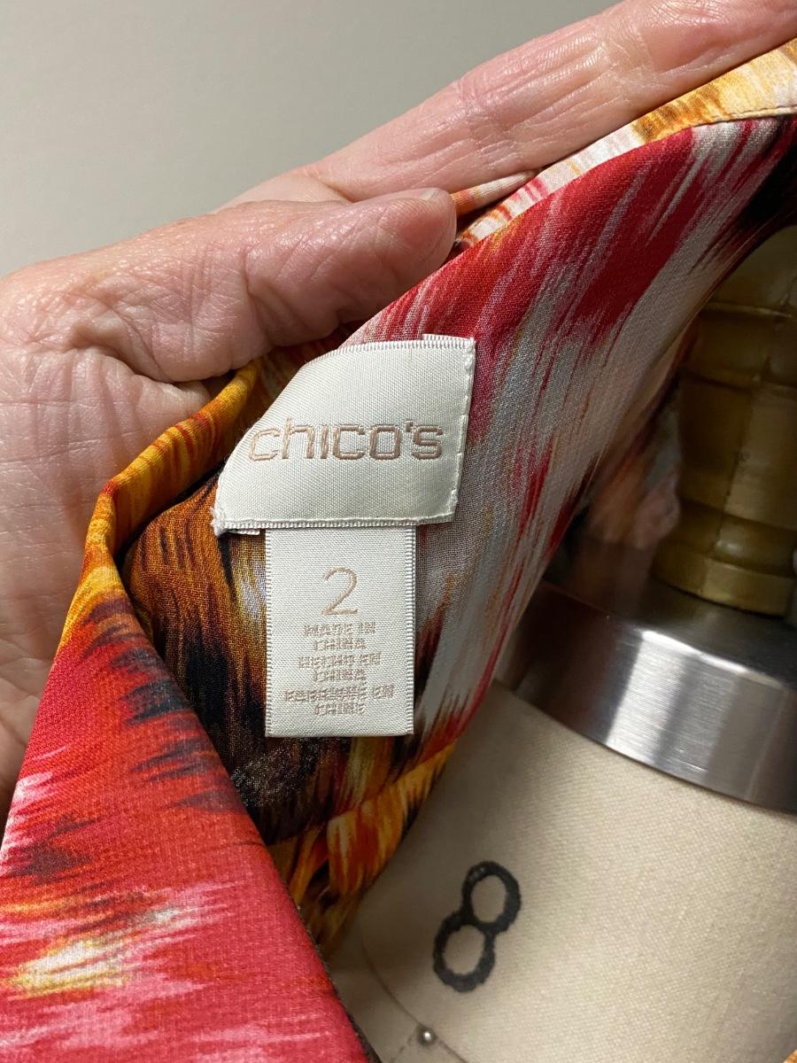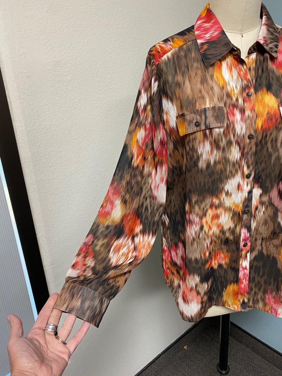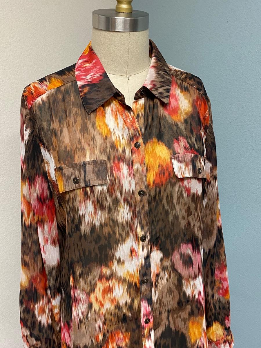 Warm Mixed Tone Chico's Button Front Blouse Size 2 Large 12. Sheer material, great with tank underneath. Chico's size 2 is comparable to a size large or 12.