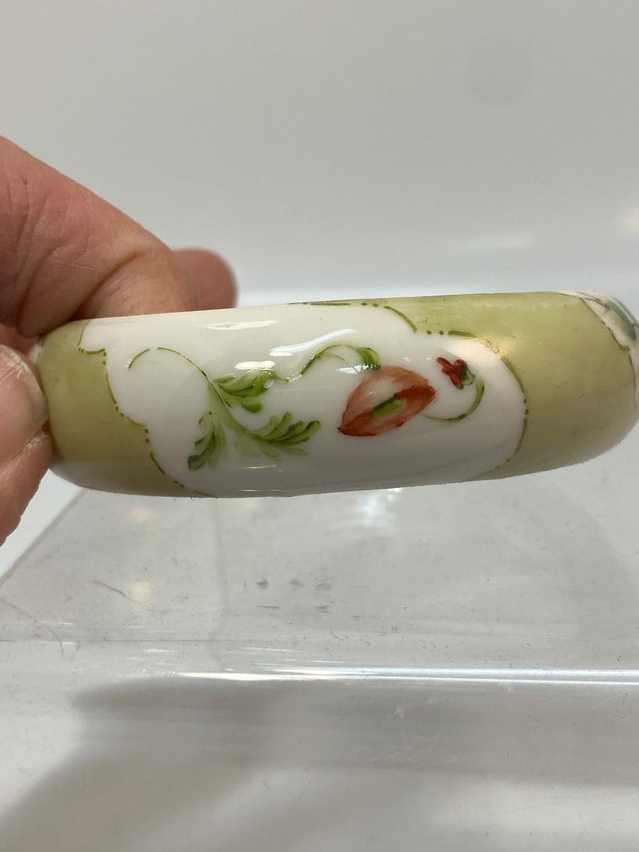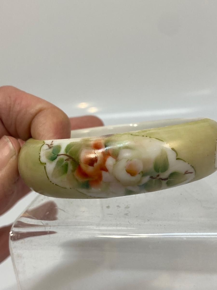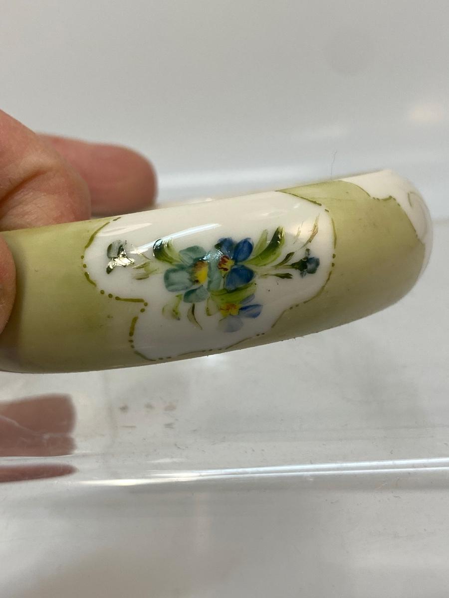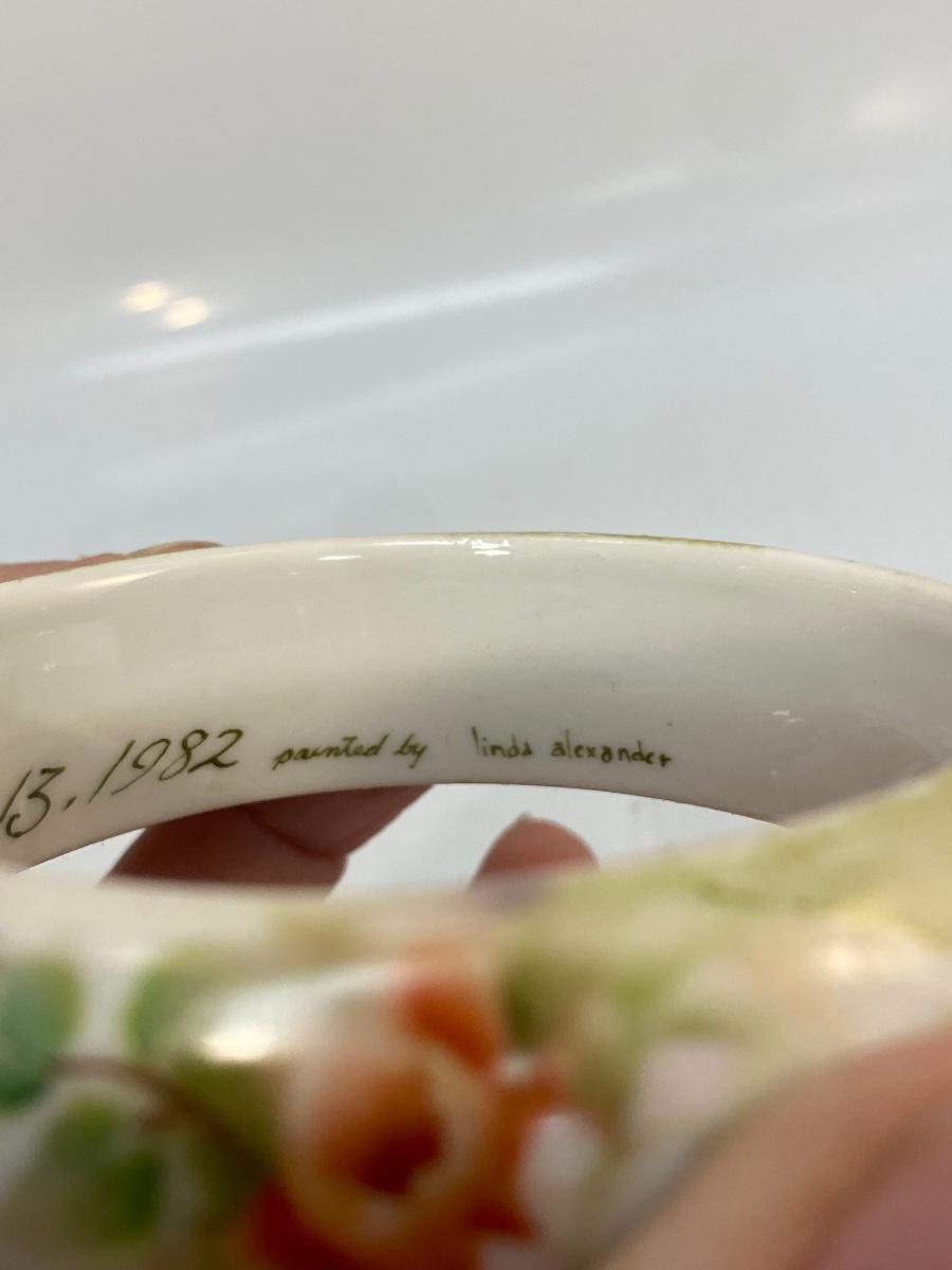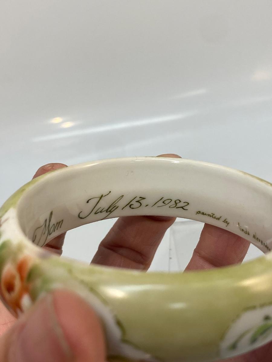 Vintage Hand Painted Floral Pattern Porcelain Bangle Bracelet Inscribed & Dated. Hand painted floral pattern similar to old porcelain dishes. Was a gift in 1982. Artist signed. Light wear but no cracks or damage noticed.