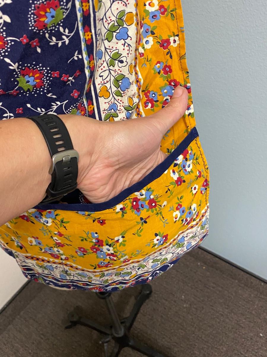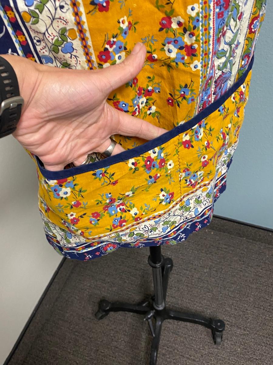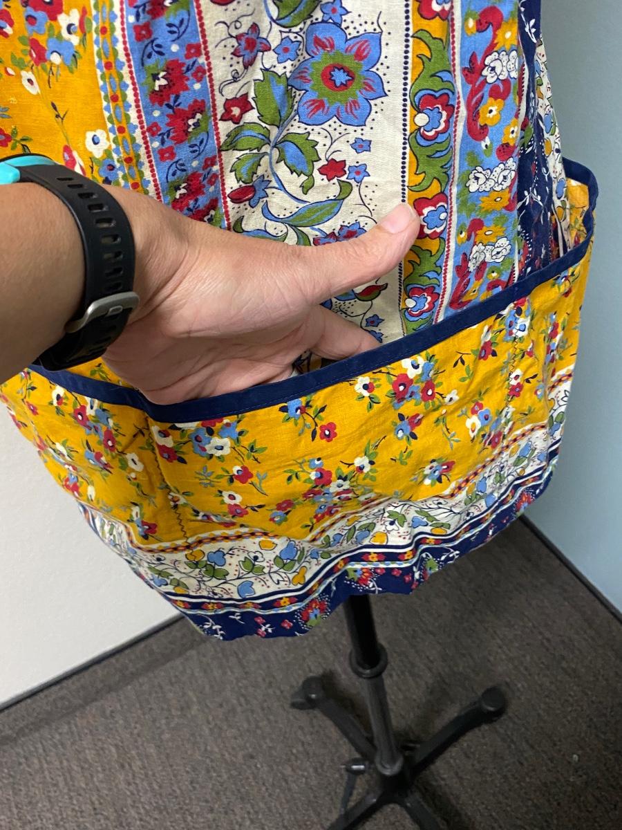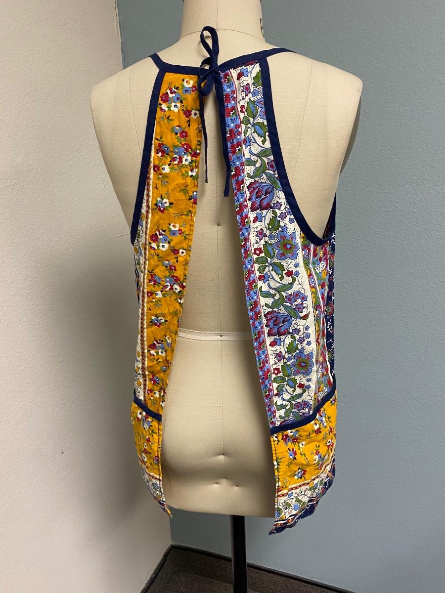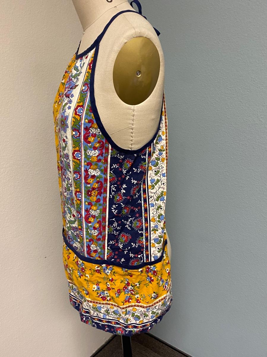 Colorful Vintage Floral Full Apron Smock Tie at Neck with Pockets. In good vintage condition. Has 4 large pockets at the bottom. Ties at back of neck. Mannequin is a medium, this would probably fit a large also.