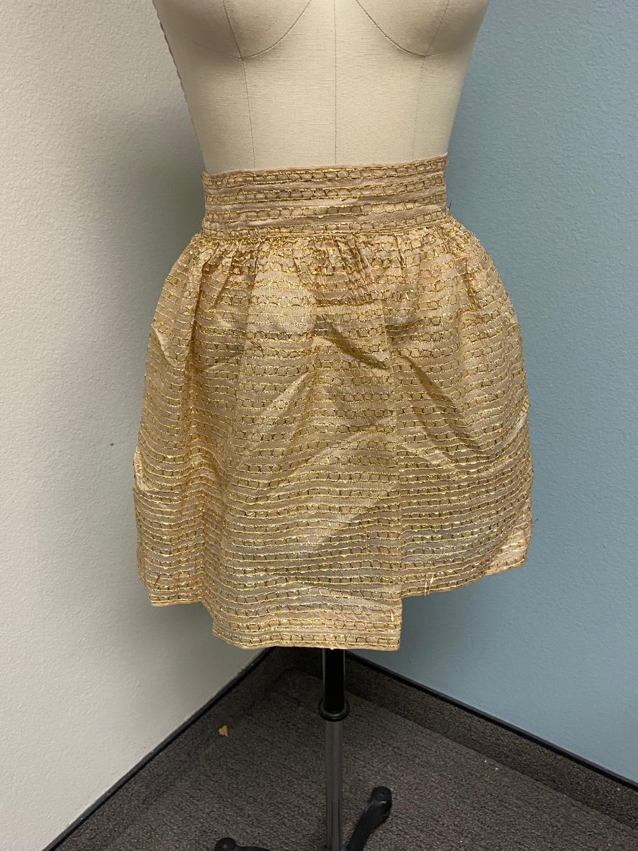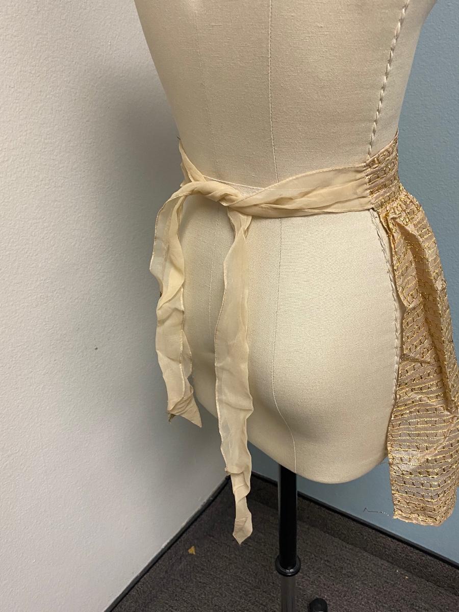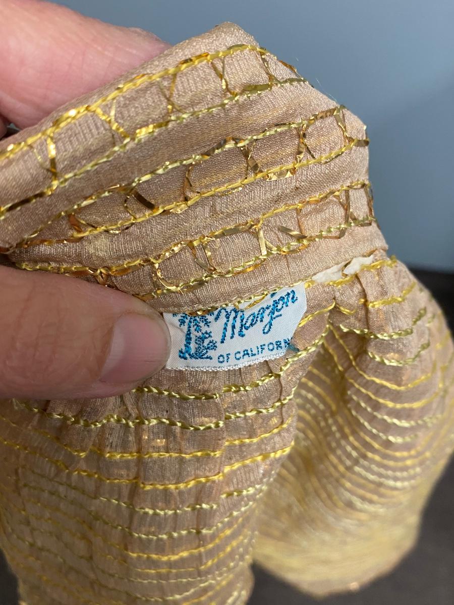 Vintage Retro Marjon of California Gold Stitched Formal Fancy Half Apron. Champagne gold with gold tinsel thread stitching. No pockets. Has maker tag along inside waist. Did notice a couple thread snags, no spots. Would probably fit a large ok.