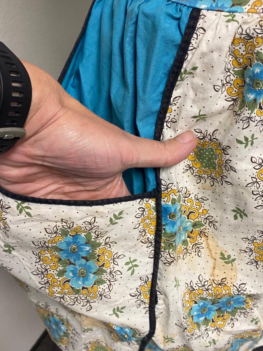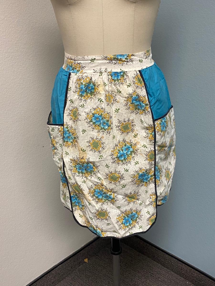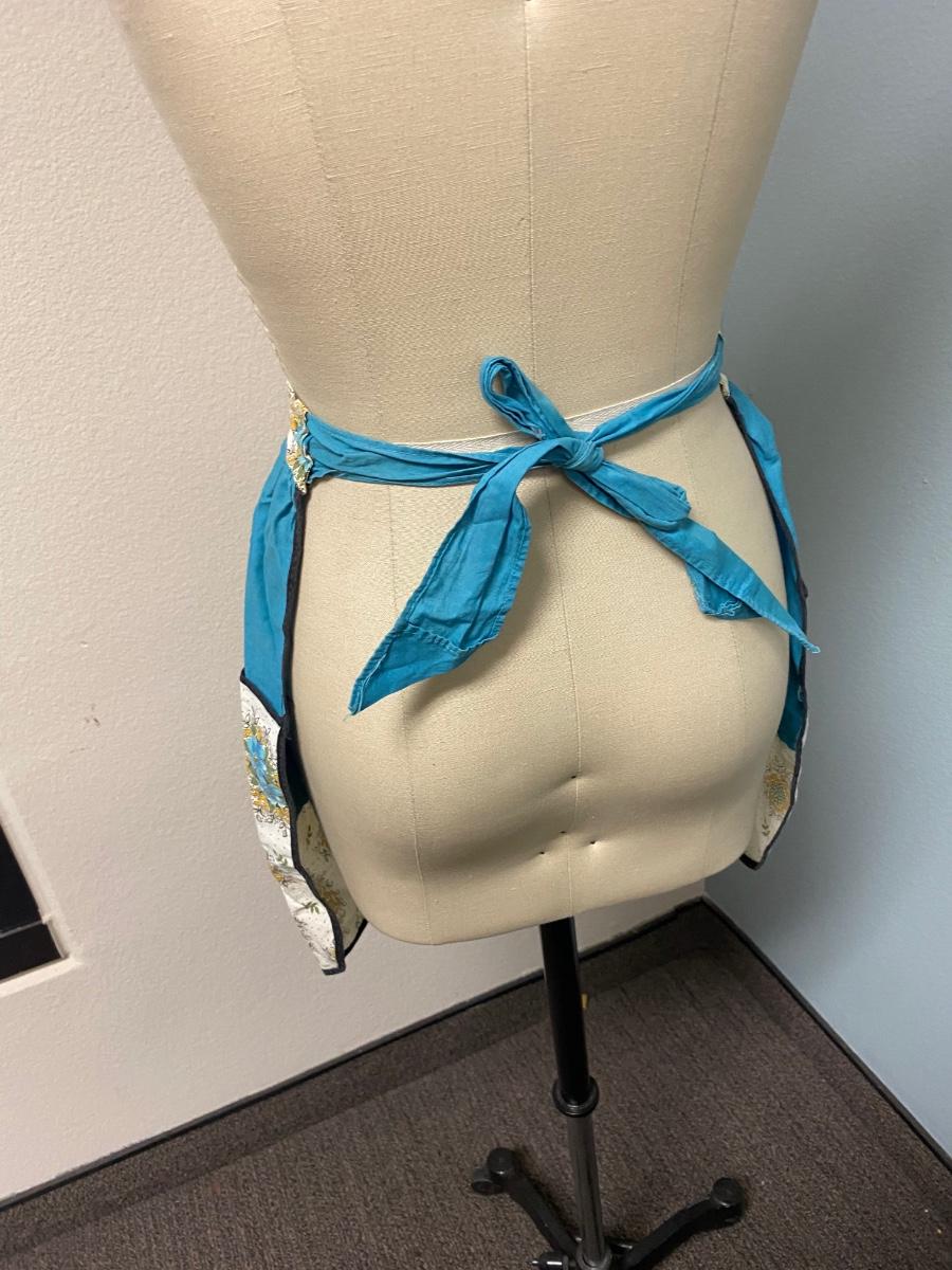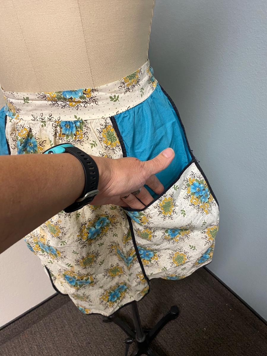 Vintage Hand Made Turquoise Blue Floral Half Apron Tie Bask with Pockets. In vintage worn condition. There are some stains and spots that sort of blend into pattern. Large pockets on the front. The ties are short on this apron, mannequin is an 8, this apron may fit a large.