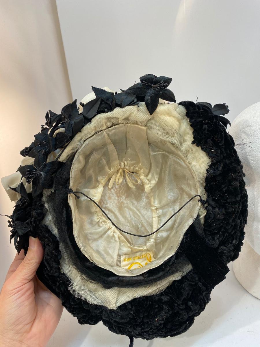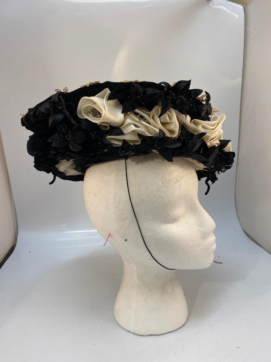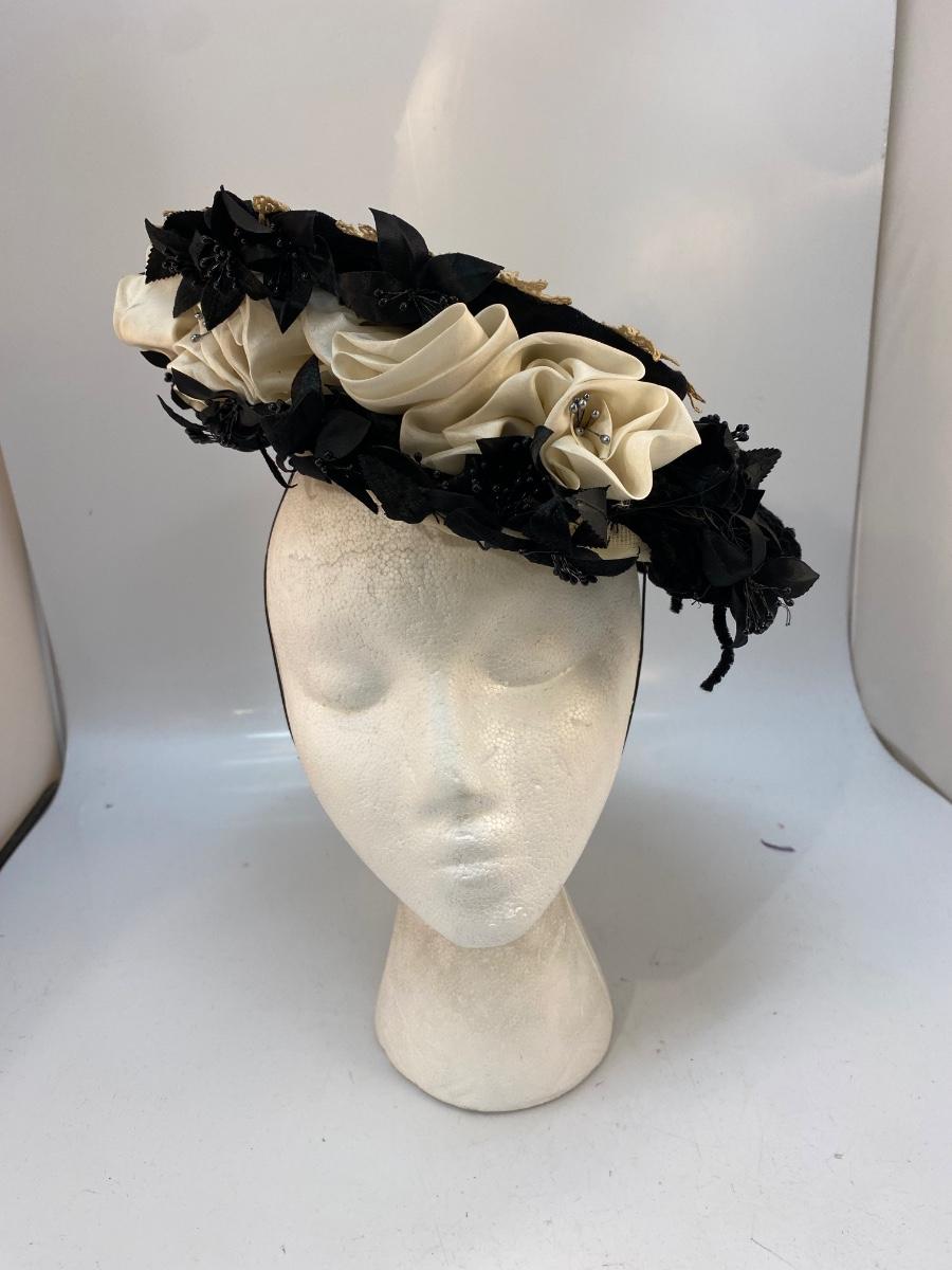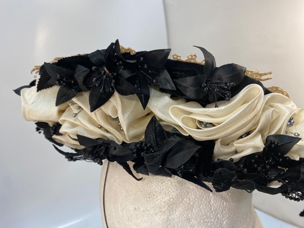 Vintage Victorian Black & White Gothic Funeral Gala Fascinator Hat J. Hock. In good vintage condition. White ribbon flowers with small black artificial flowers. Lace top. Some light discolor to lace from age and may need a little reshaping from storage. Label inside.
