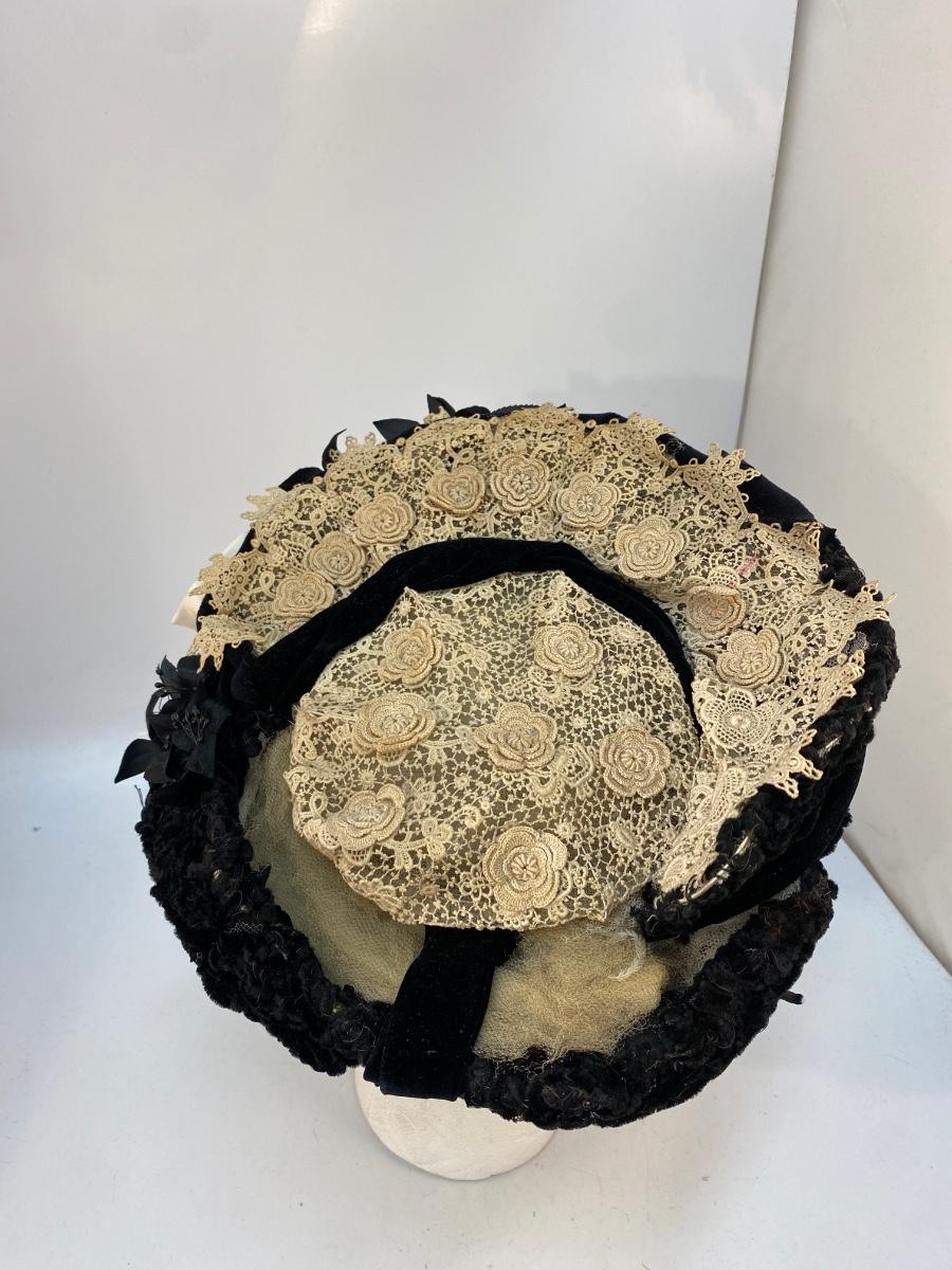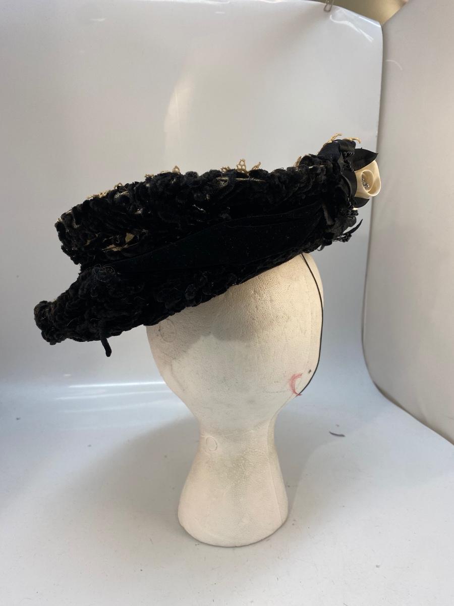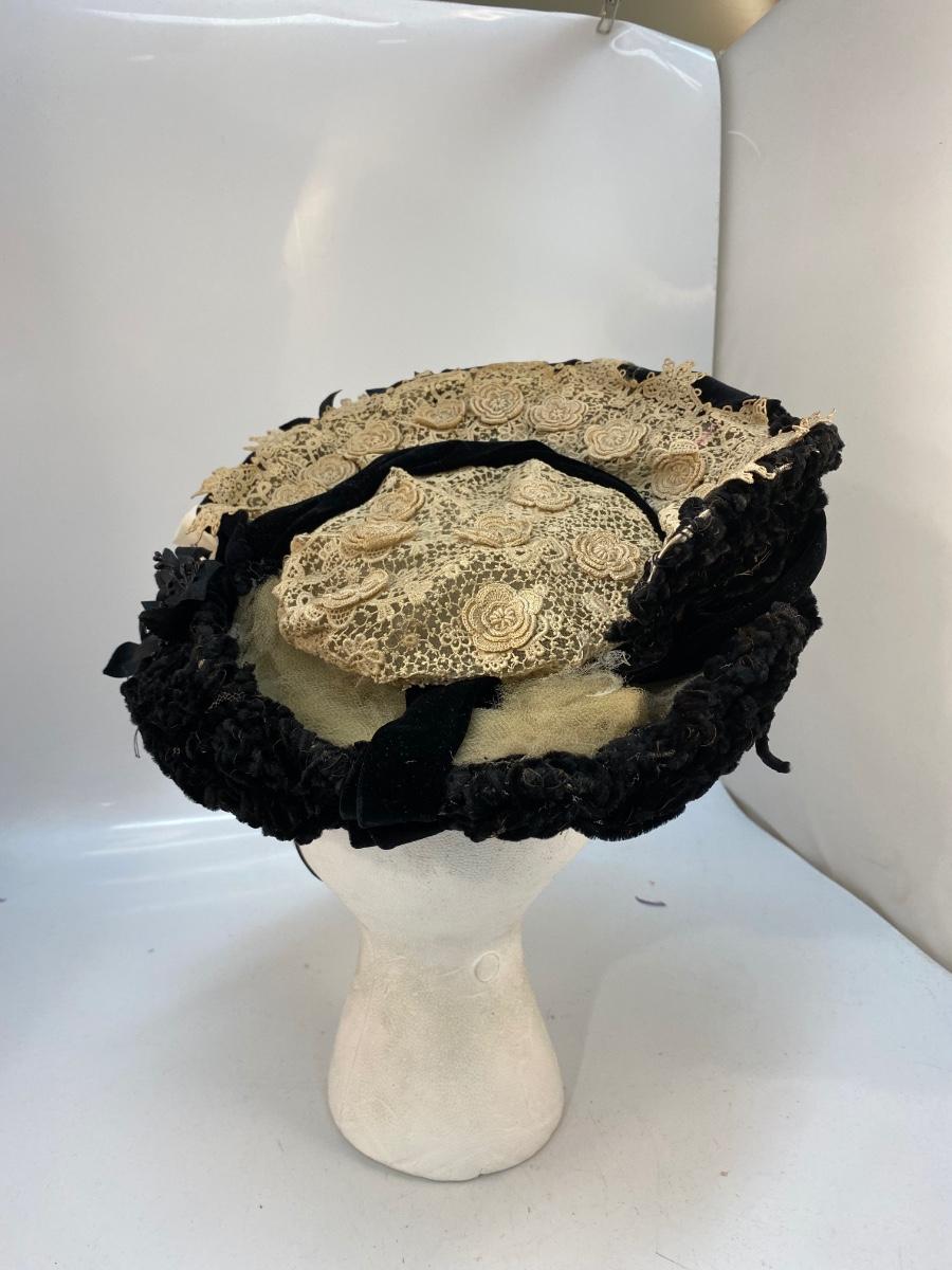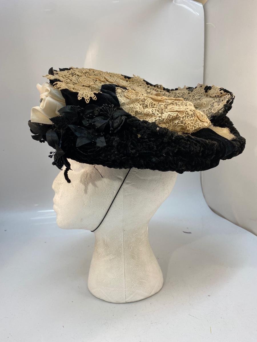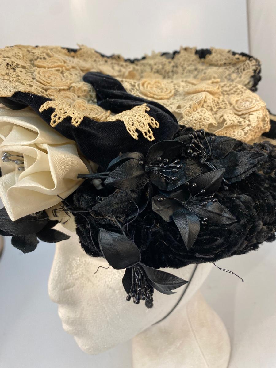 Vintage Victorian Black & White Gothic Funeral Gala Fascinator Hat J. Hock. In good vintage condition. White ribbon flowers with small black artificial flowers. Lace top. Some light discolor to lace from age and may need a little reshaping from storage. Label inside.