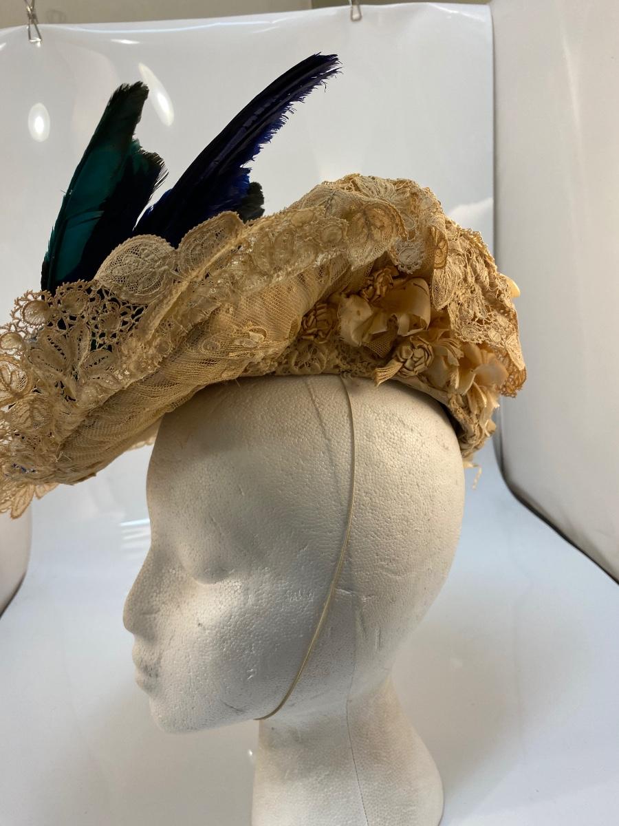 Vintage Antique Victorian Fascinator Hat Lace and Ribbon with Colorful Bird