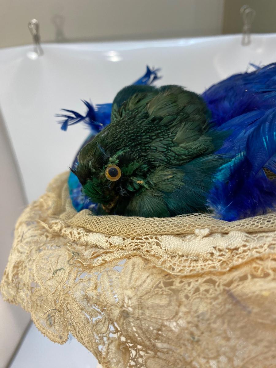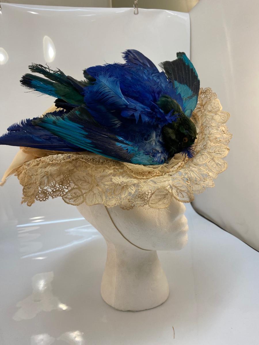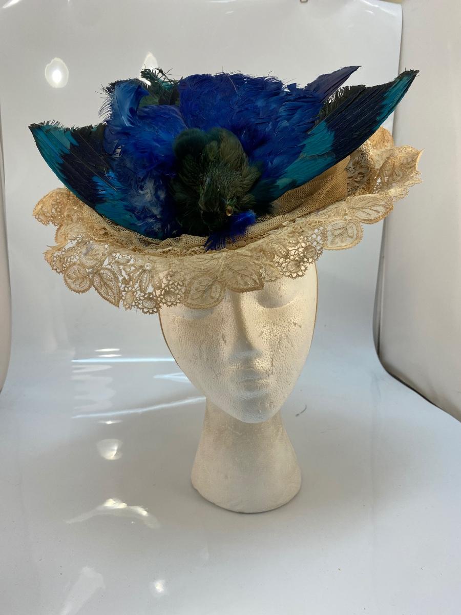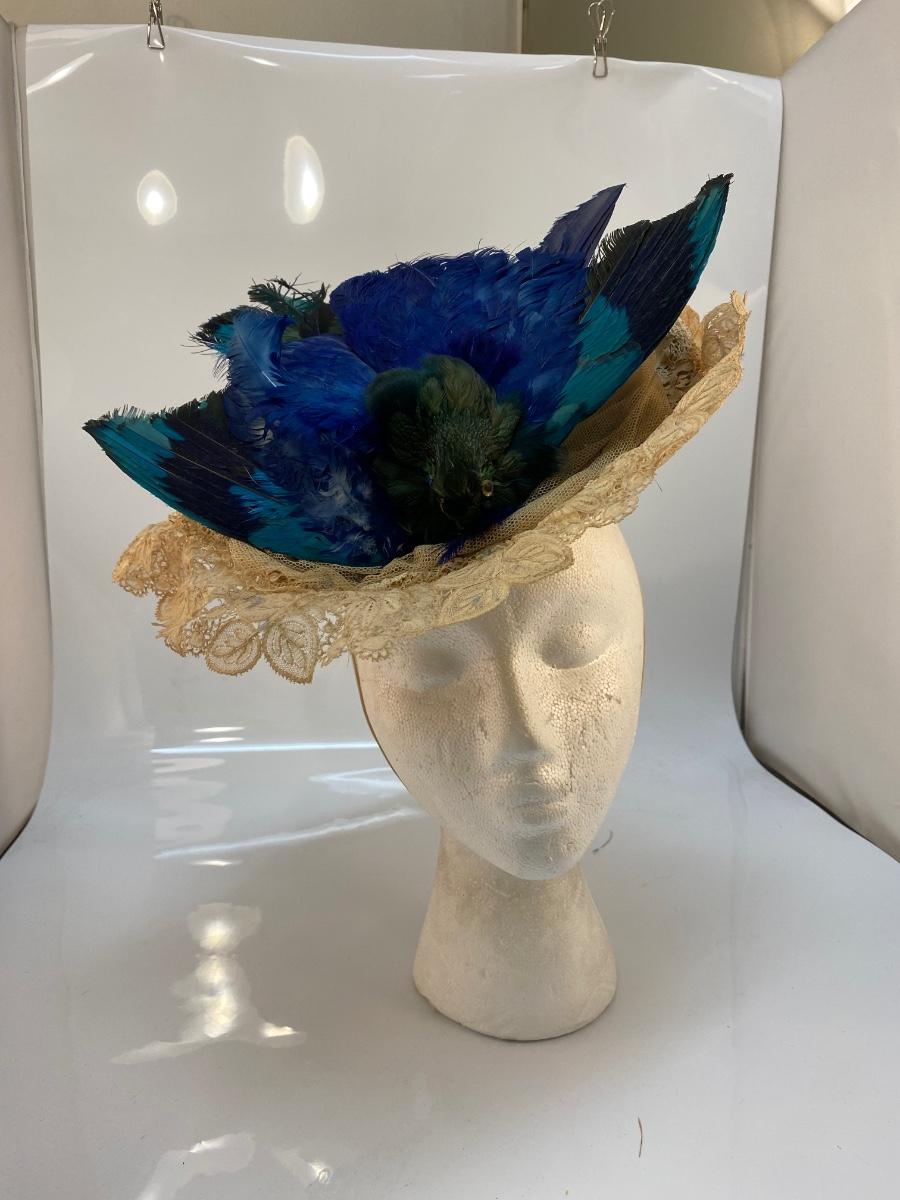 Vintage Antique Victorian Fascinator Hat Lace and Ribbon with Colorful Bird. Some light discolor to the lace and ribbon. Colorful blue and green bird adorns the front. Does not appear to be a whole bird but pieced together wings and taxidermy head with artificial eyes. Looks like a pigeon that has had the feathers dyed. See photos.