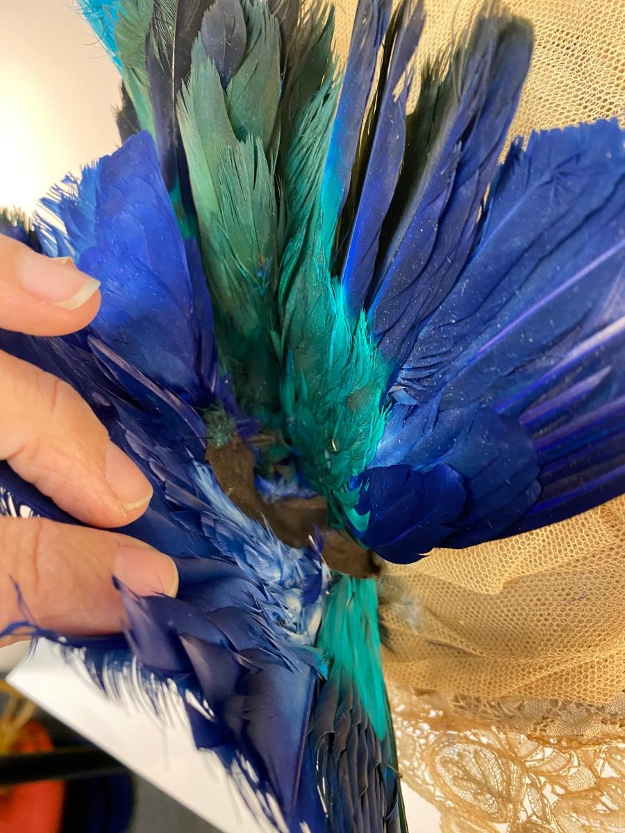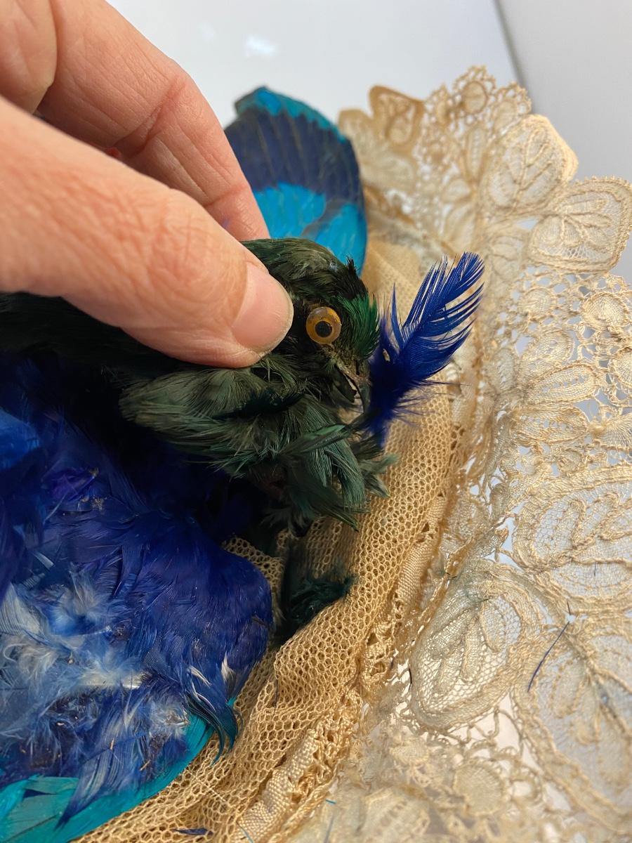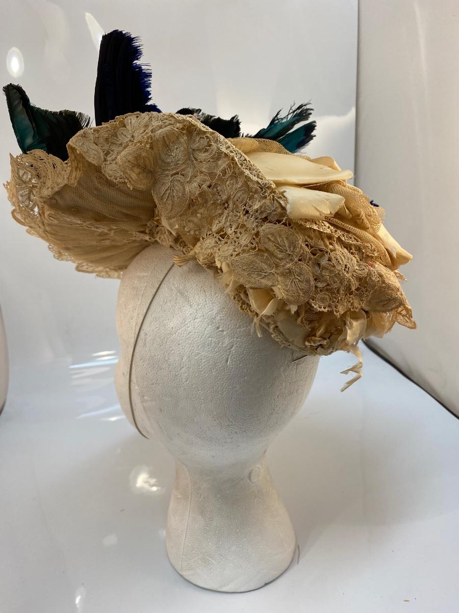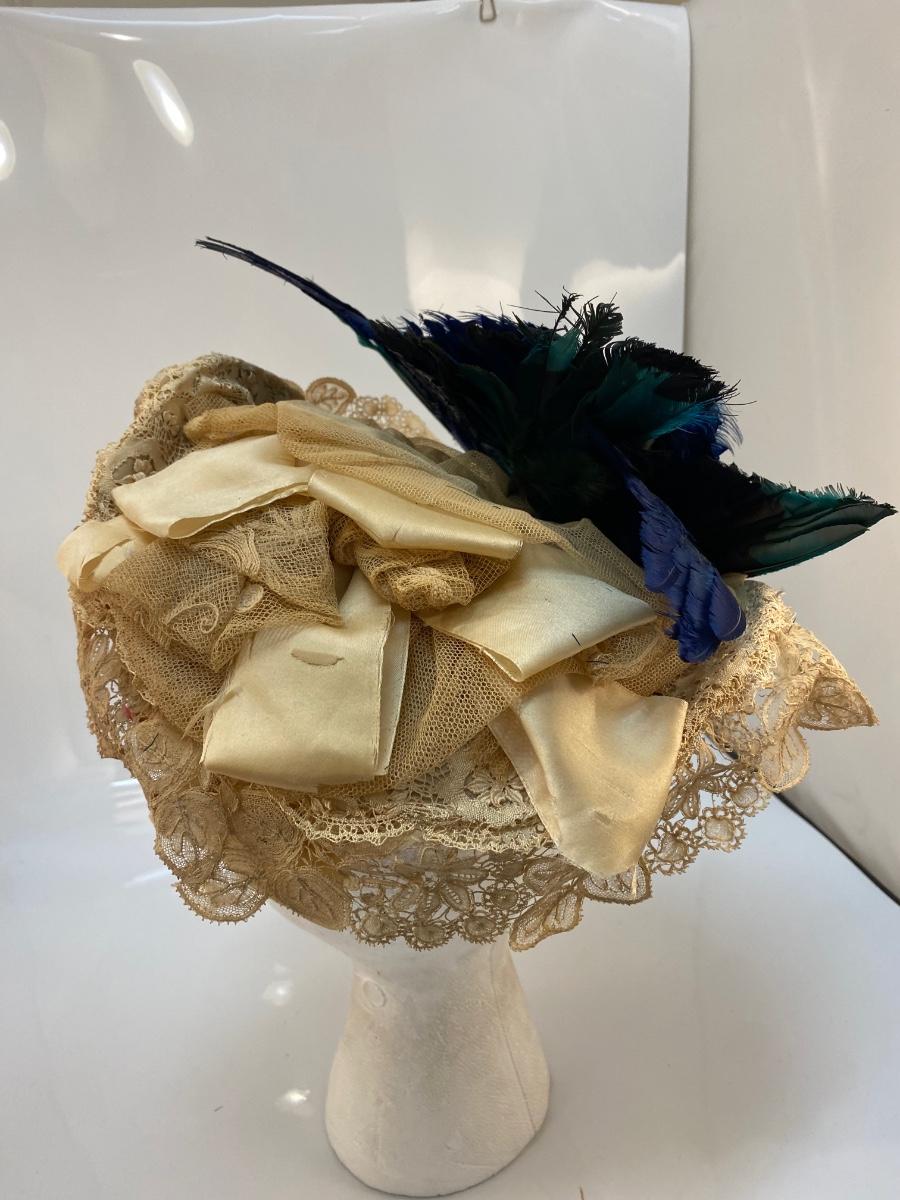 Vintage Antique Victorian Fascinator Hat Lace and Ribbon with Colorful Bird. Some light discolor to the lace and ribbon. Colorful blue and green bird adorns the front. Does not appear to be a whole bird but pieced together wings and taxidermy head with artificial eyes. Looks like a pigeon that has had the feathers dyed. See photos.