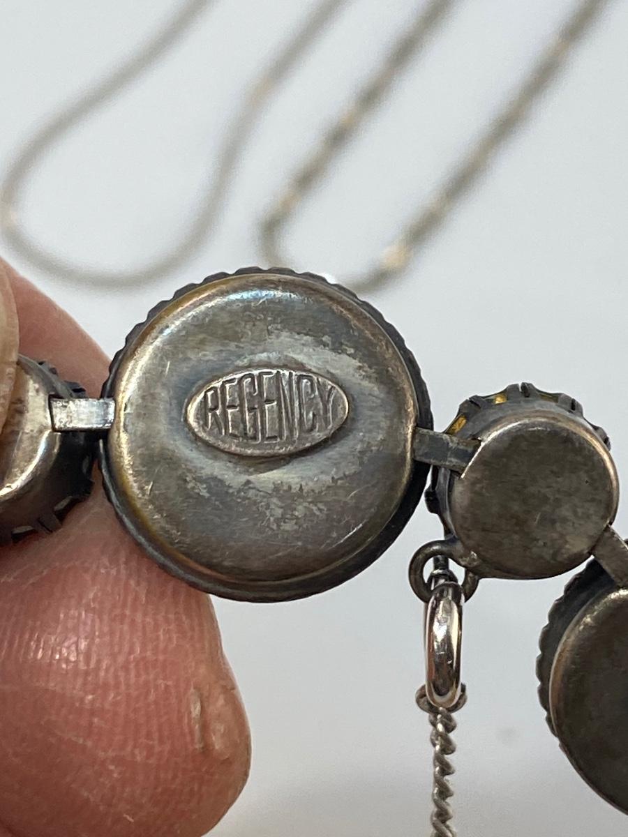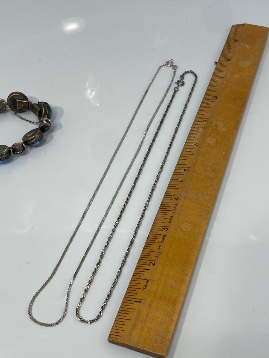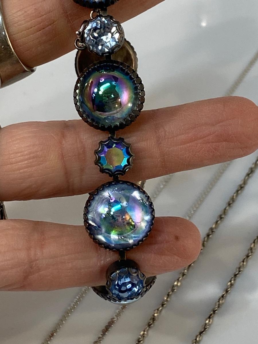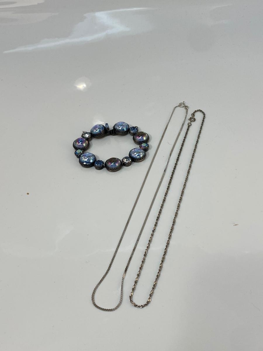 Fashion Jewelry Lot Regency Blue AB Glass Bracelet & Two Silver Chain Necklaces. Bracelet is from Regency; the glass bead links have a galaxy aurora glow to them. Silver chains, one is marked 925, the other is not.