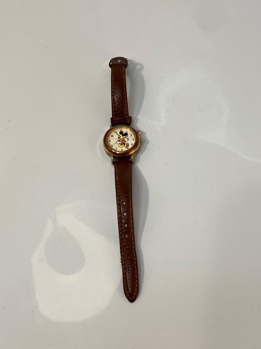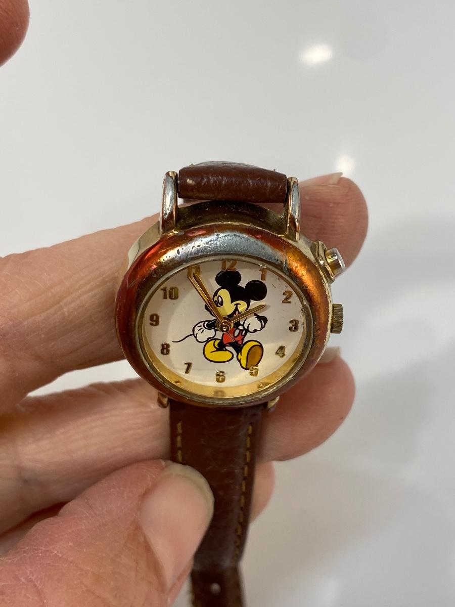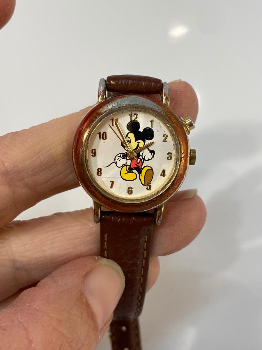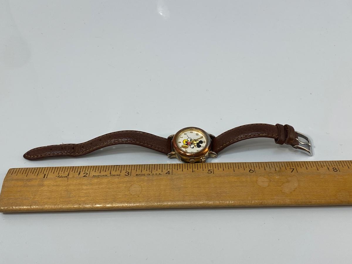 Vintage Retro Mickey Mouse Disney Ladies Wristwatch Plays Music. Watch is working and plays music when side button is pushed. There is a large scrap across the top of face as seen in photo. Watch band in good worn condition.
