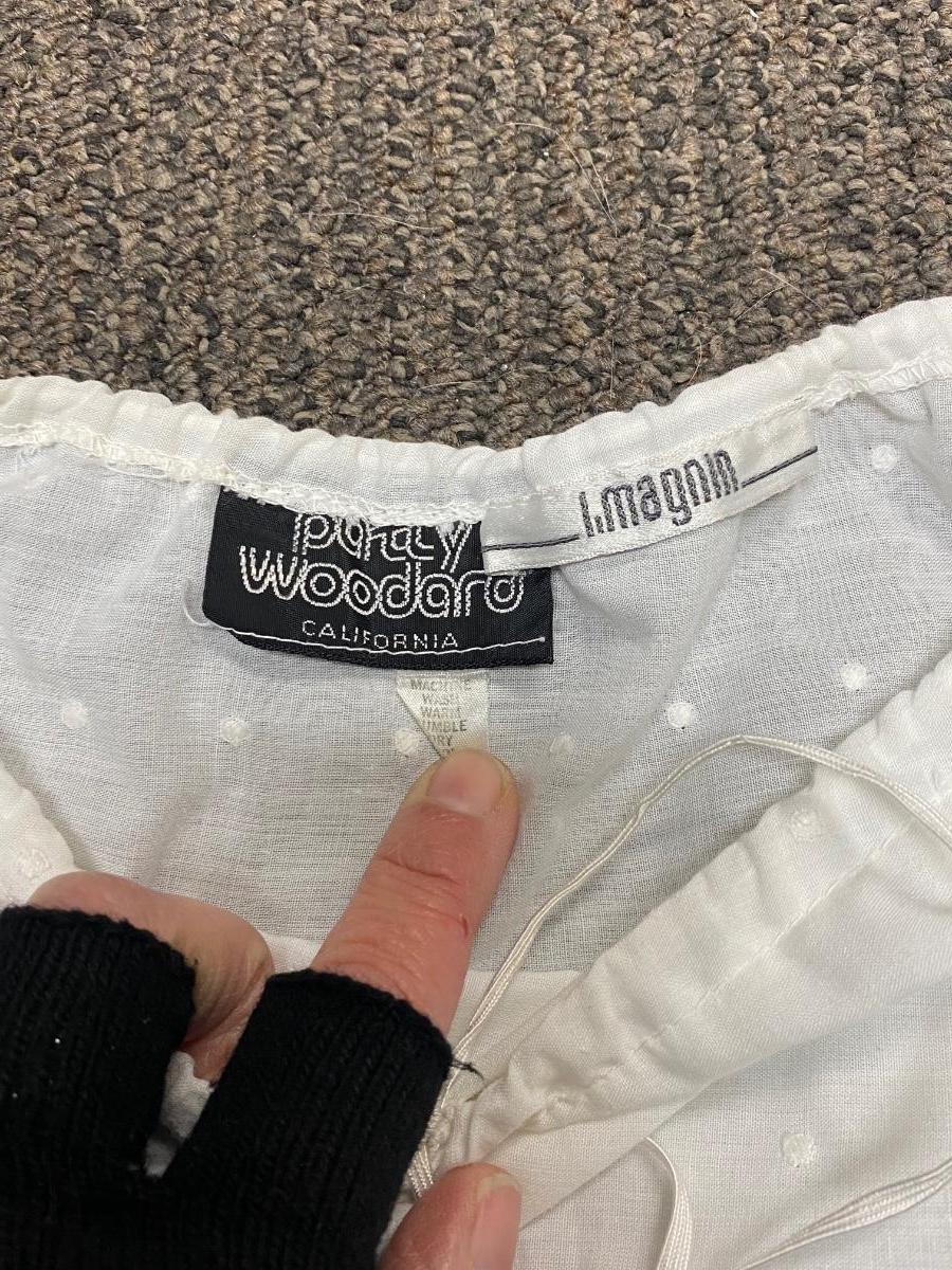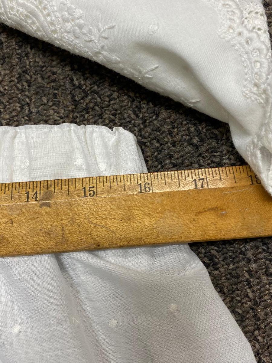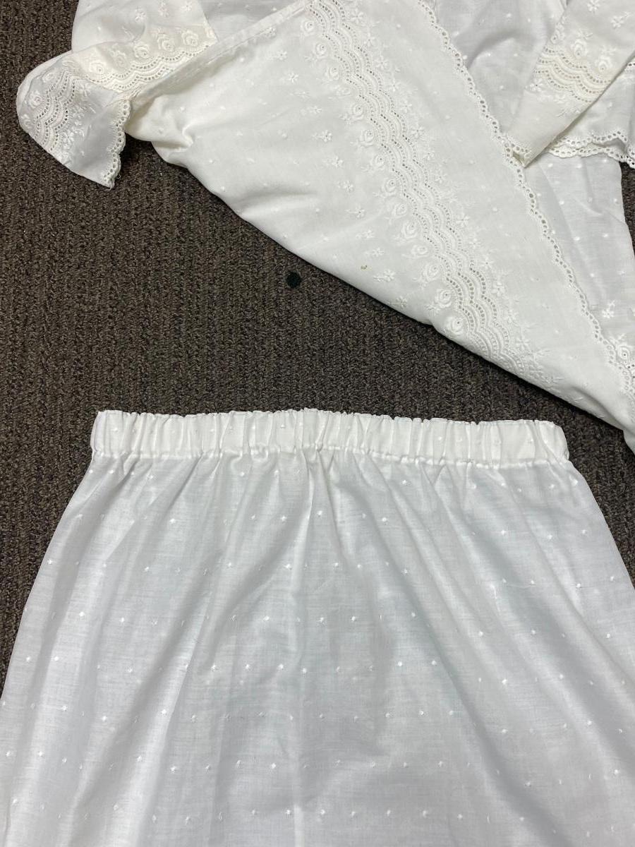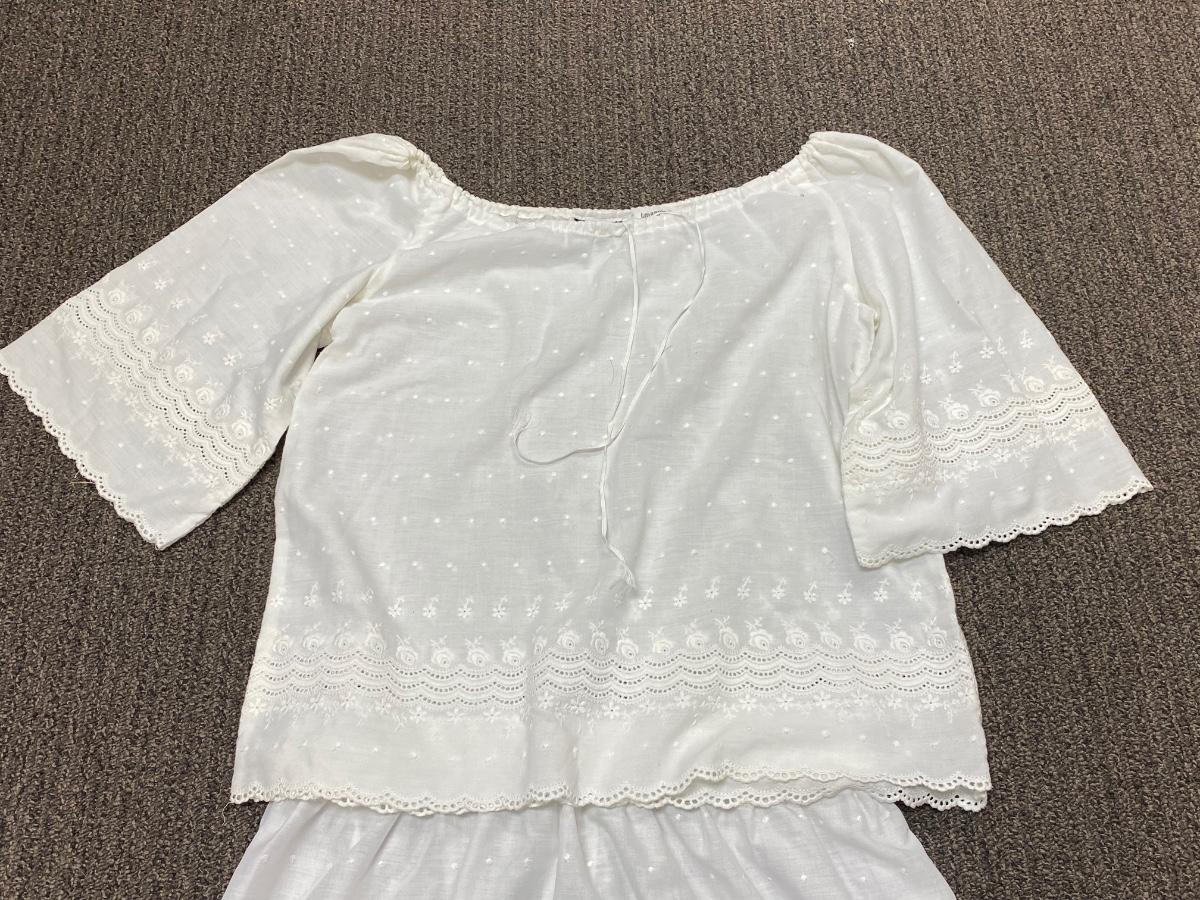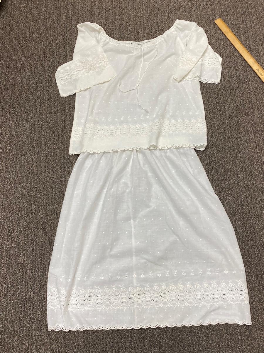 Victorian Style White Cotton Eyelet Skirt and Matching Blouse Set. This is not a vintage piece, it is a factory reproduction, there is a modern maker tag inside for I. Magnin and Patty Woodard California. In good condition. No holes or discolor. Larger size than the clothing from the estate, elastic waist measures about 16"