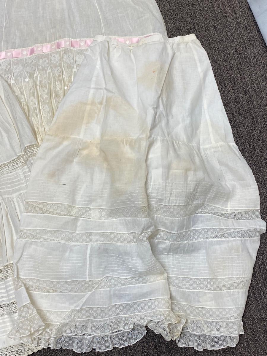 Lot of Three White Cotton Gibson Girl Victorian Skirts Petticoat. in vintage condition. There is discoloration and spots but no serious damage or holes.
