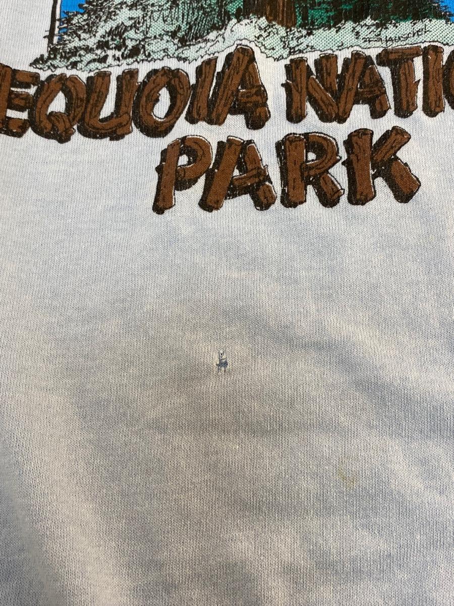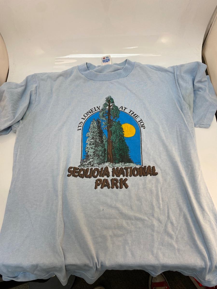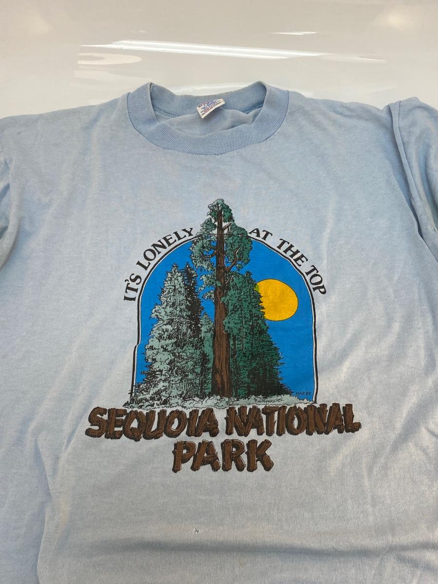 Retro Baby Blue Its Lonely at the Top Sequoia National Park Souvenir Tshirt. In vintage worn condition. There is yellowing at the armpits, general discolor from age, and a small hole below the image on front. Size large.