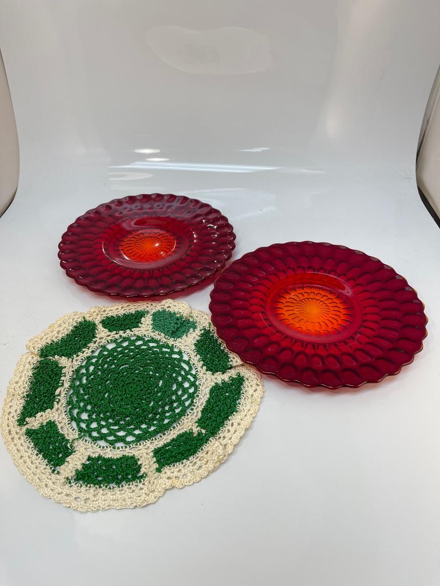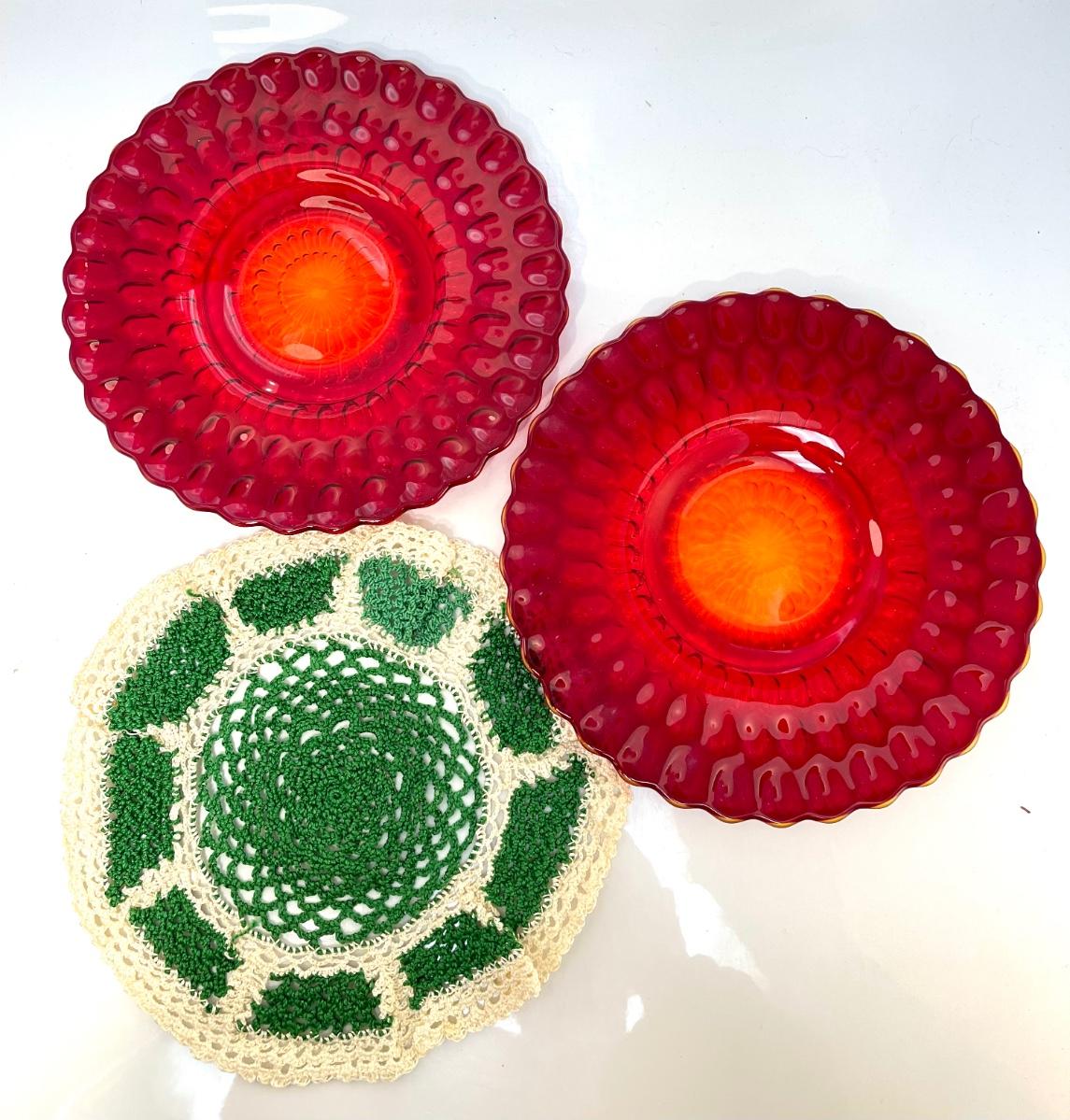 Vintage Ruby Red Thumbprint Fenton Glass Plates with Green & White Doily