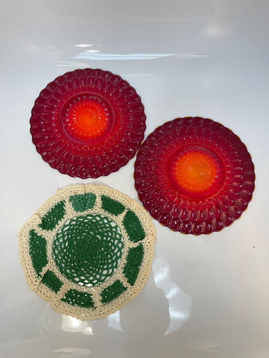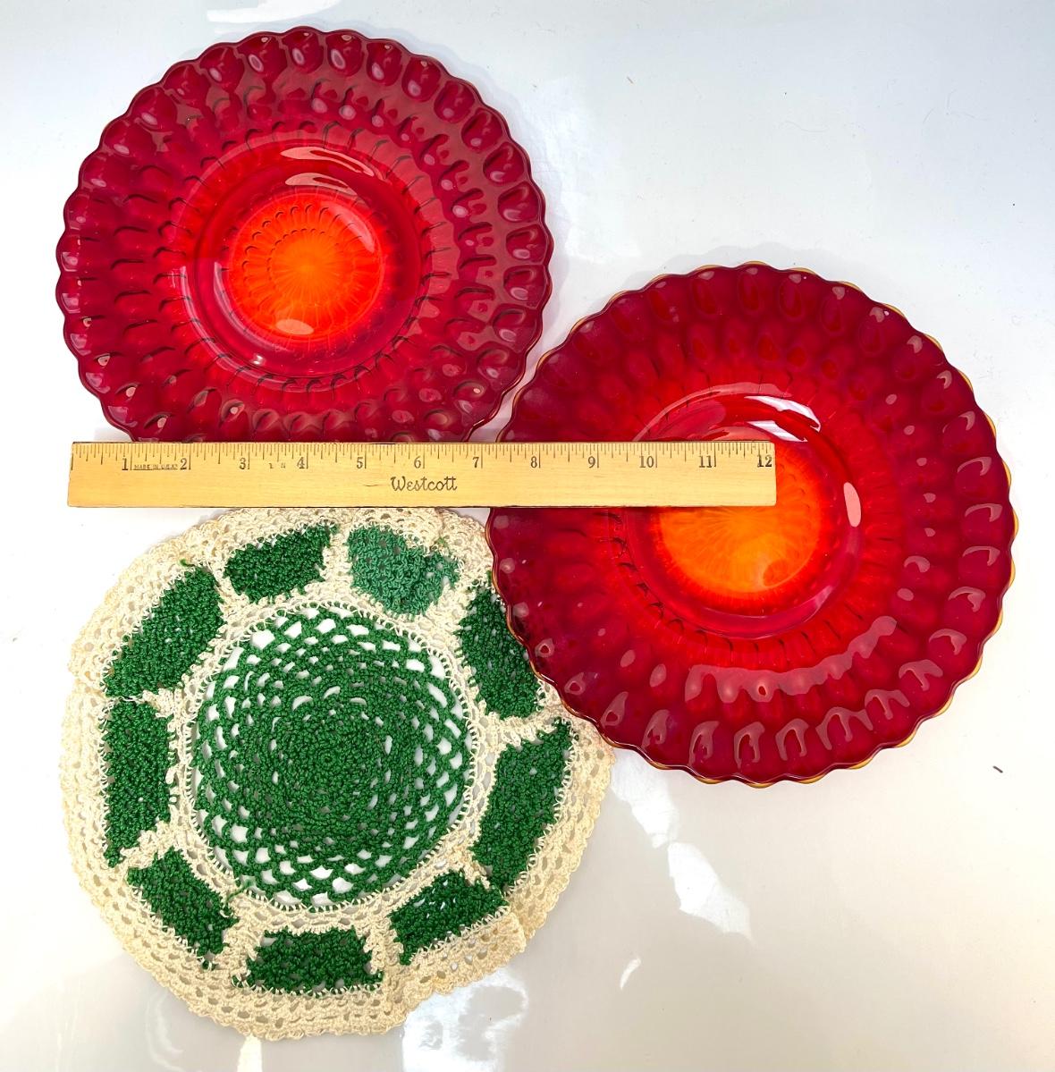 Vintage Ruby Red Thumbprint Fenton Glass Plates with Green & White Doily. In good condition. Thumbprint effect gives a radiating color look to the plates. About 8" size. No chips.