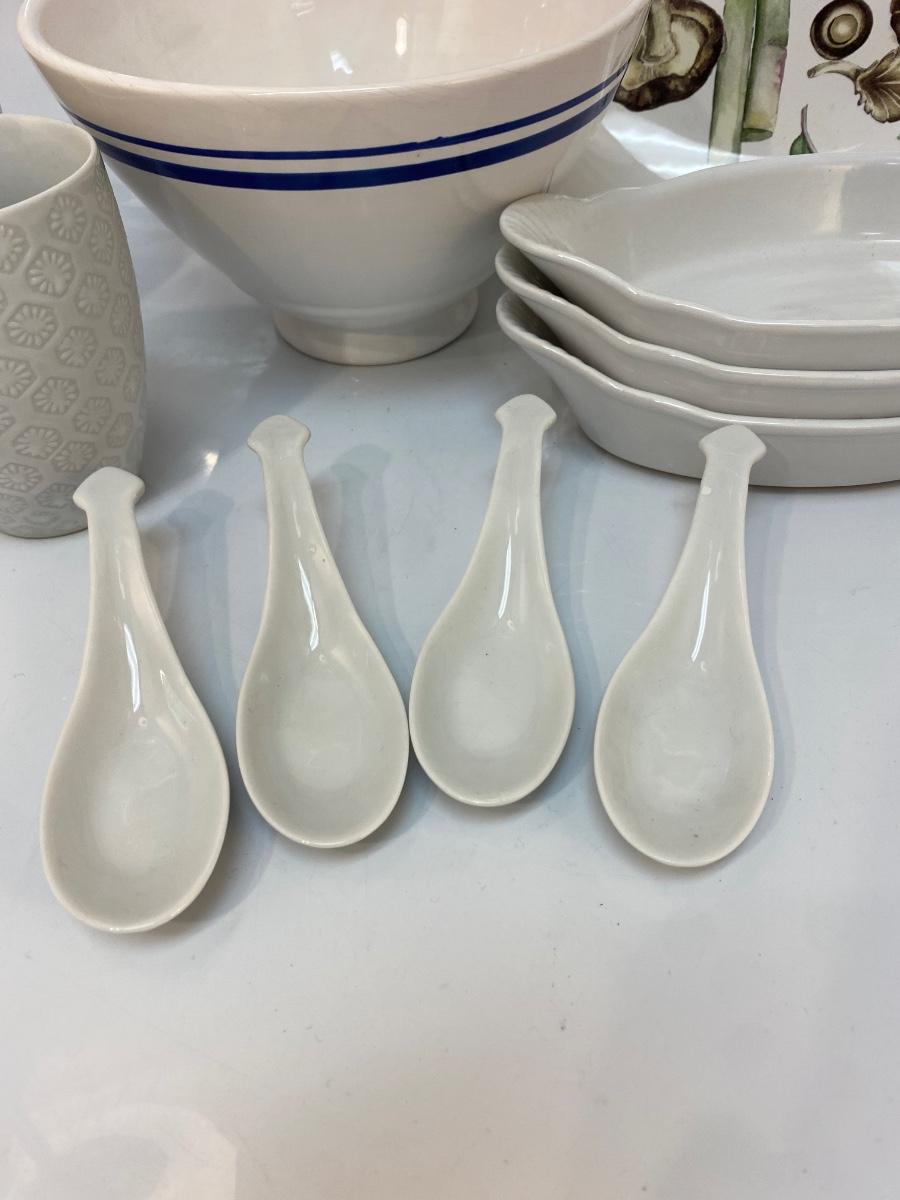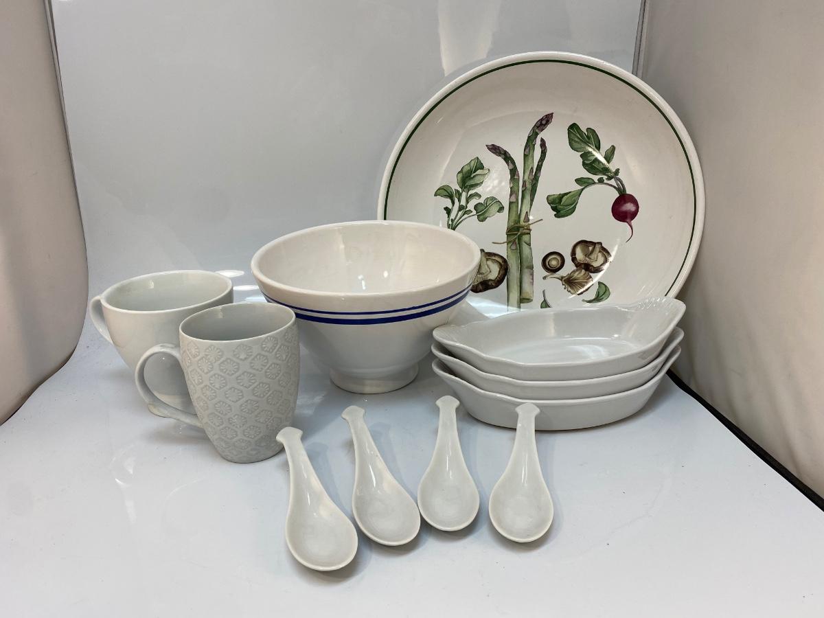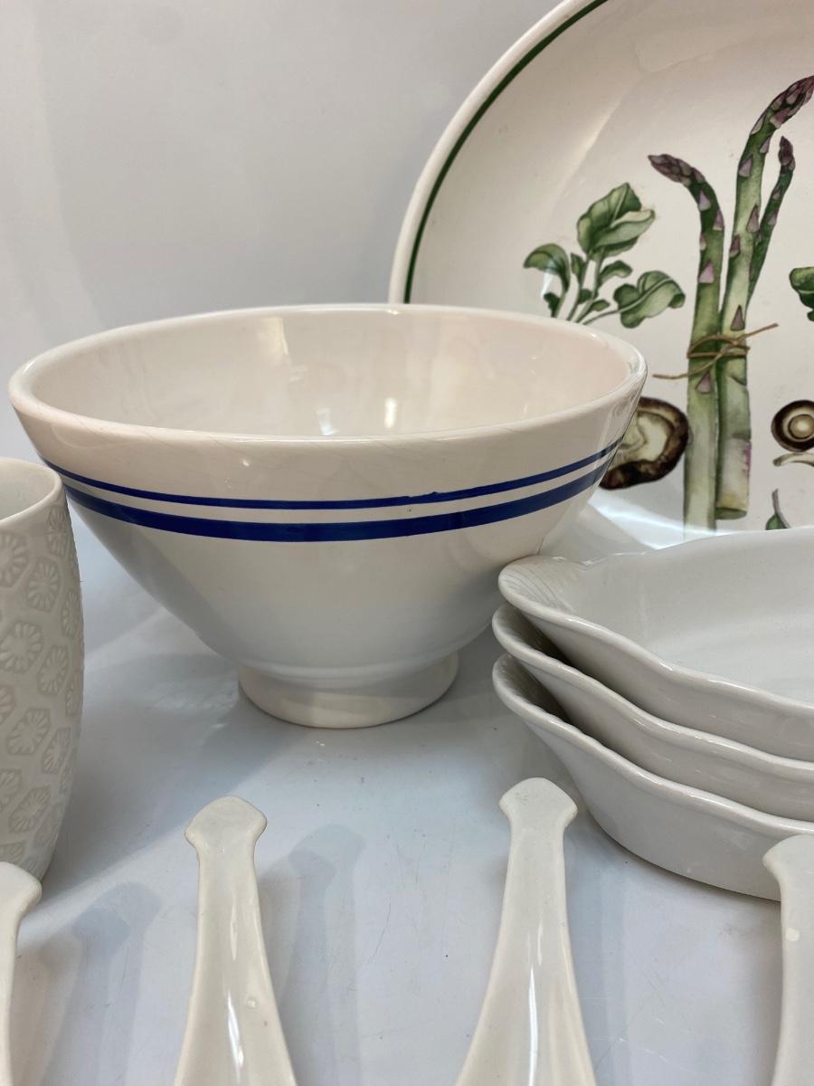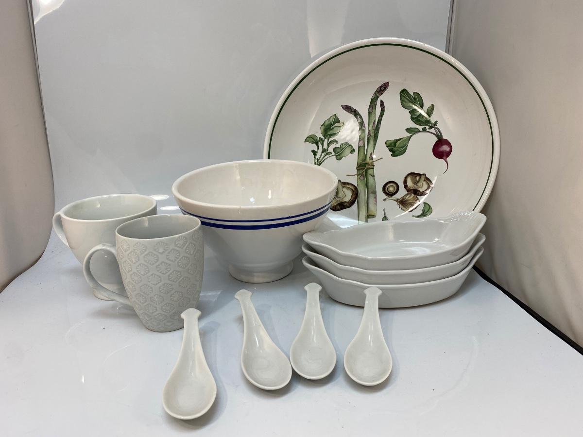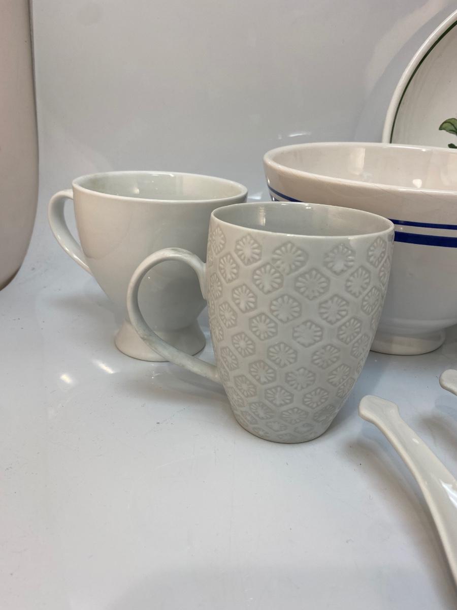 Mixed Lot of Various Kitchen Ceramics Cups Bowls Spoons. Everything in good used condition. One small chip found along bottom edge of blue stripe bowl., no other chips noticed.