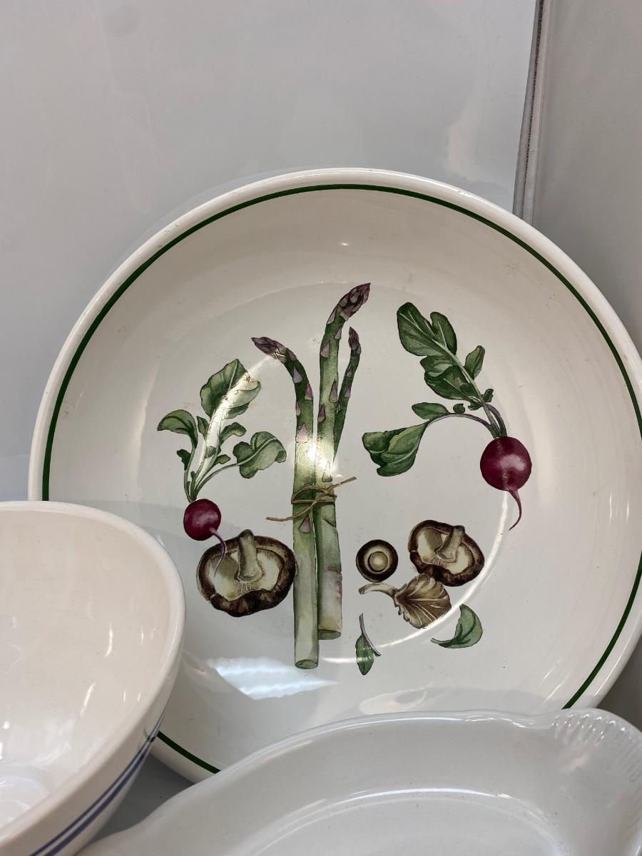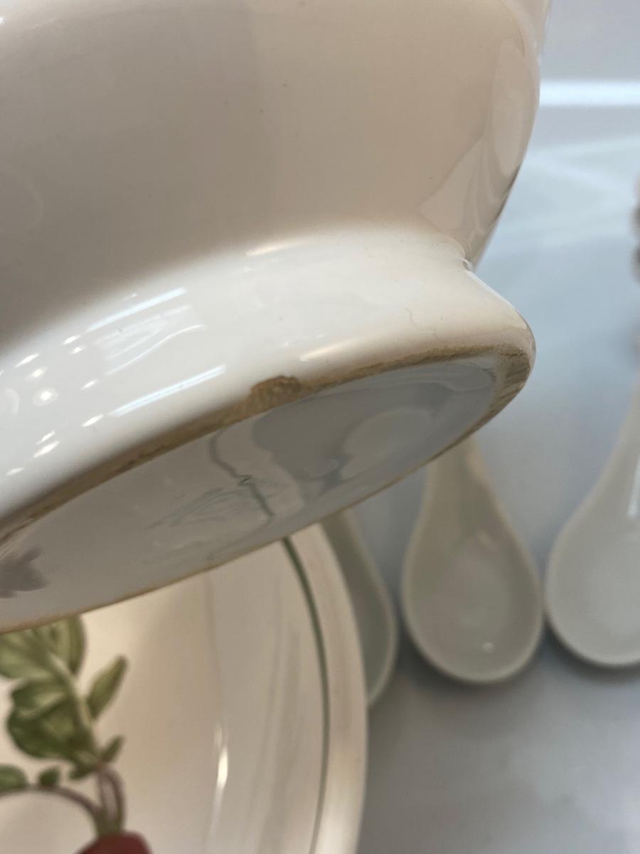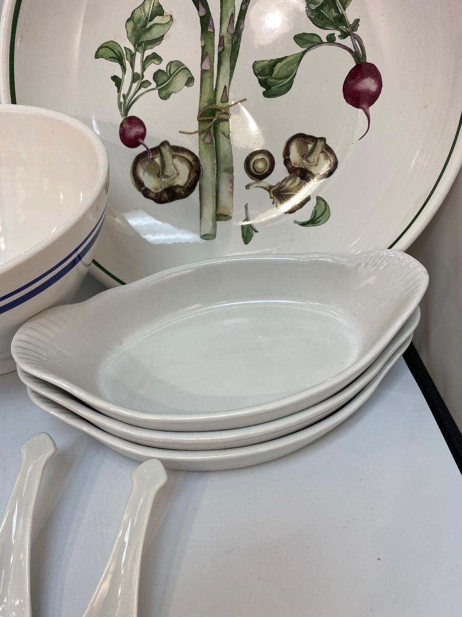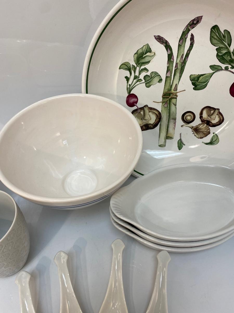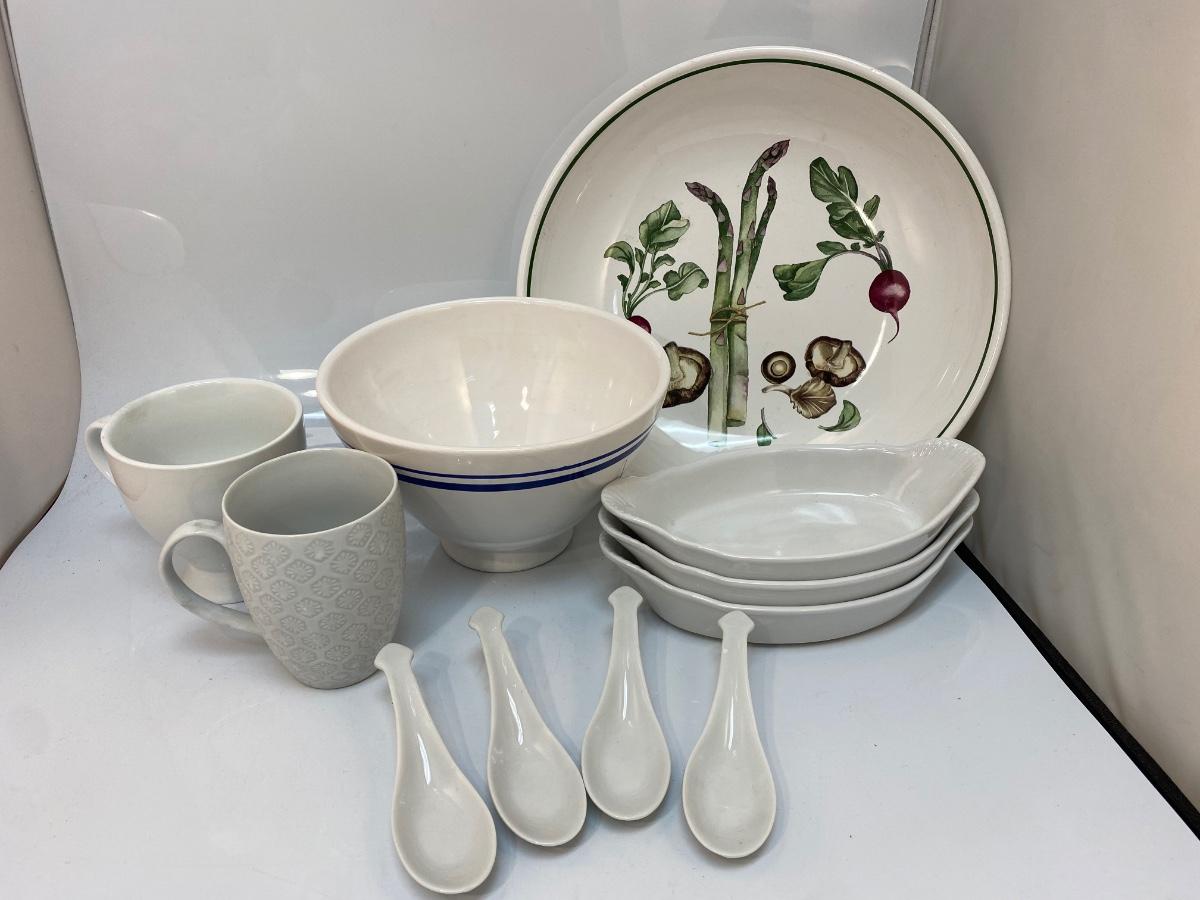 Mixed Lot of Various Kitchen Ceramics Cups Bowls Spoons. Everything in good used condition. One small chip found along bottom edge of blue stripe bowl., no other chips noticed.