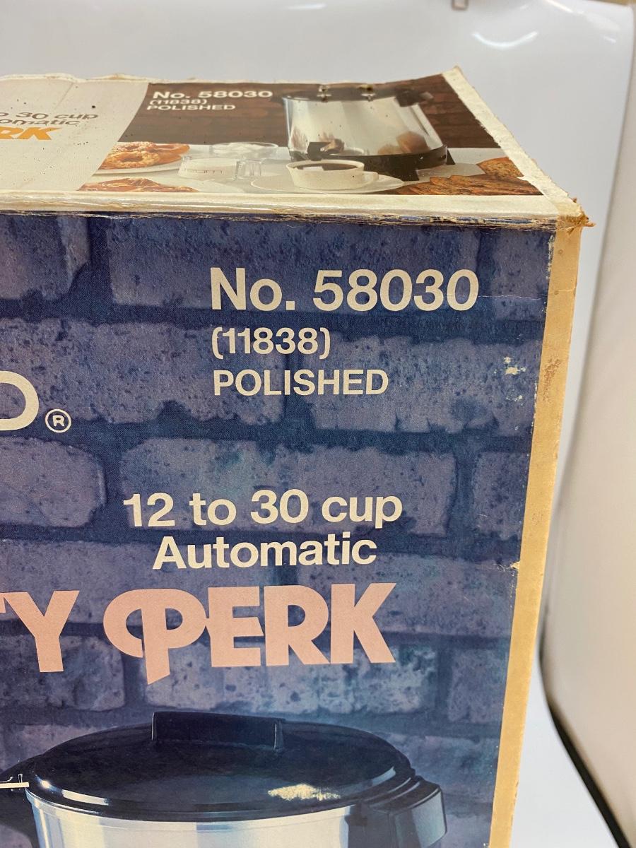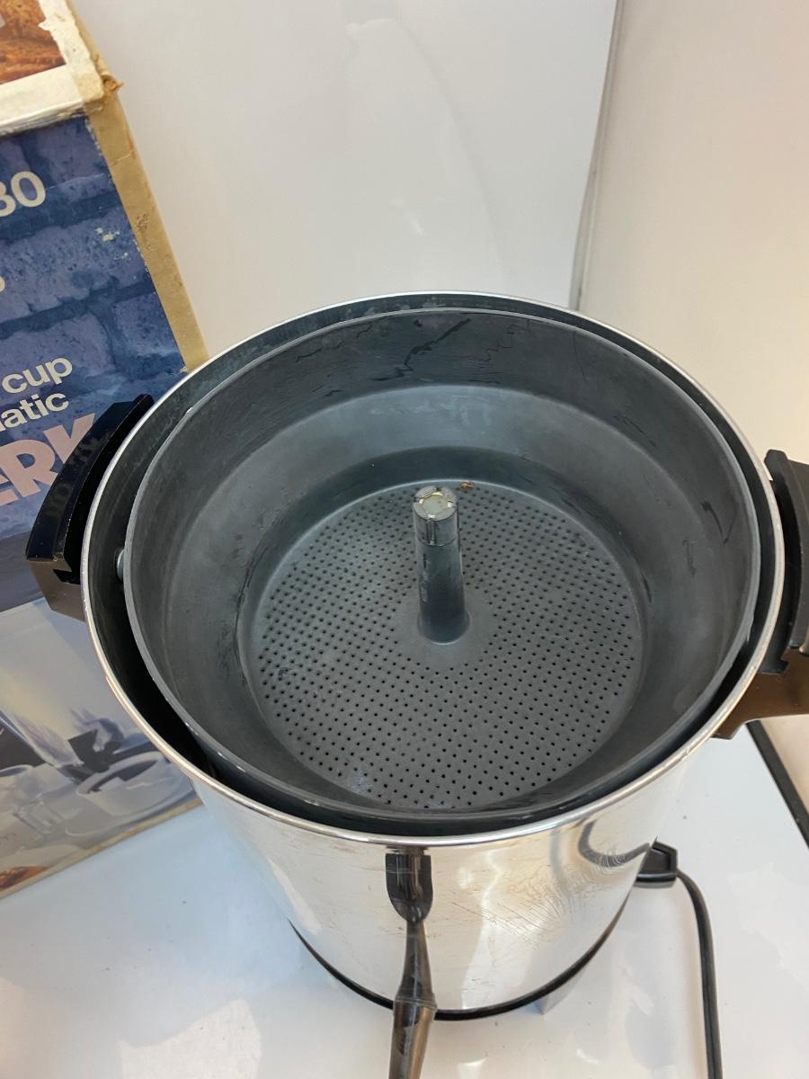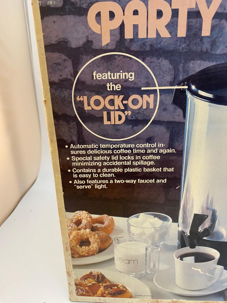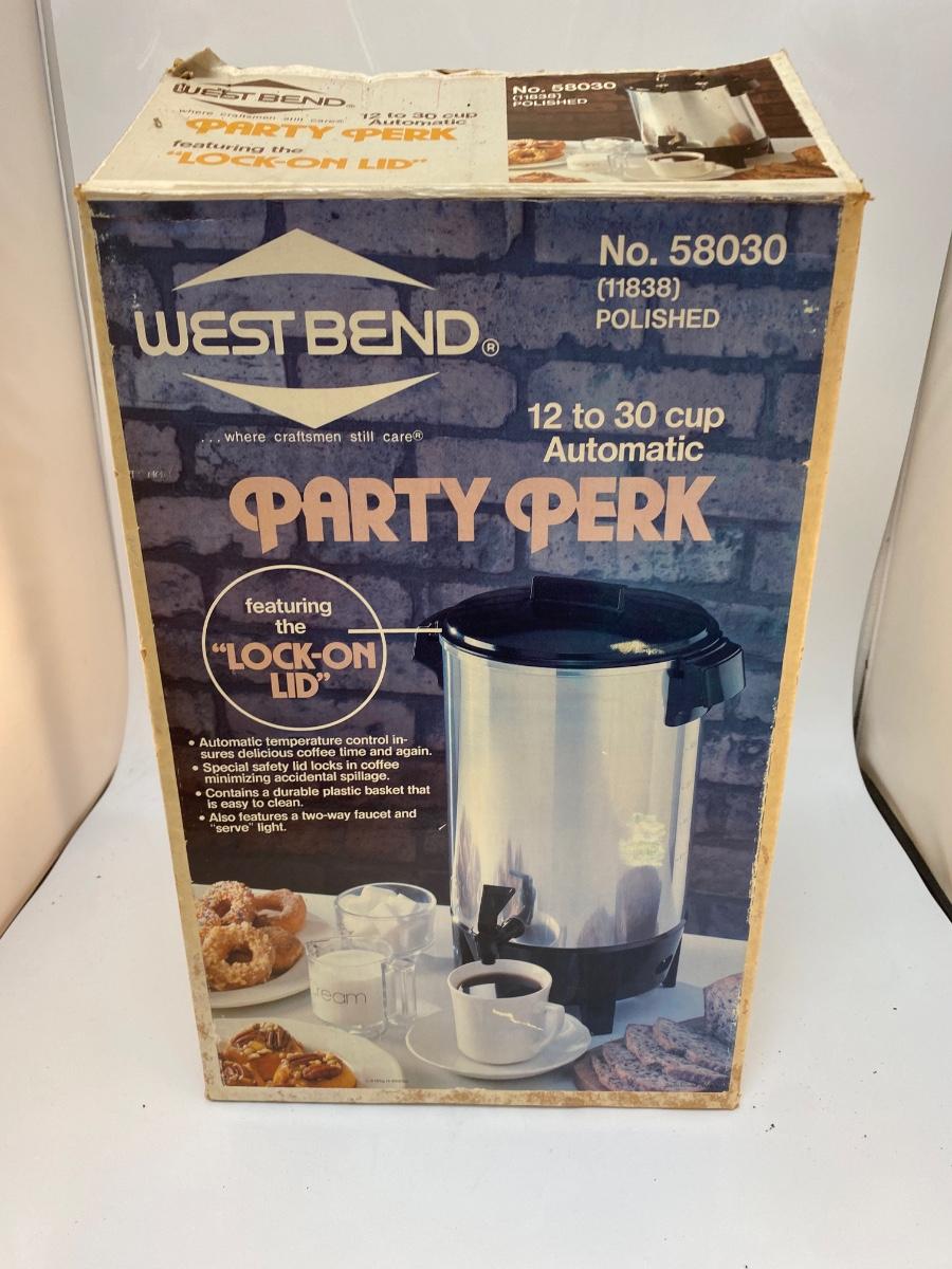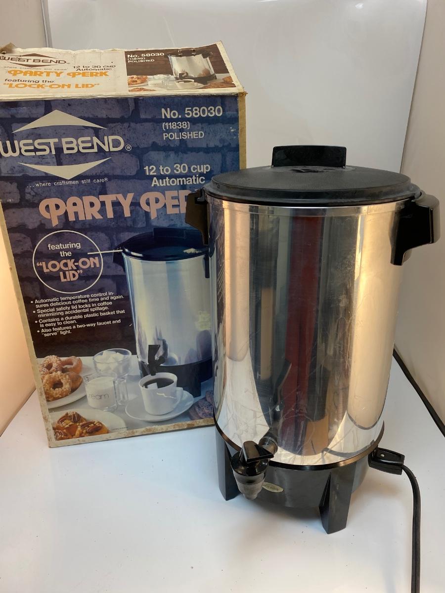 West Bend Party Perk Coffee Maker Urn Dispenser 12-30 Cup with Box. In good used condition. Plugged in and it does come on/gets hot.